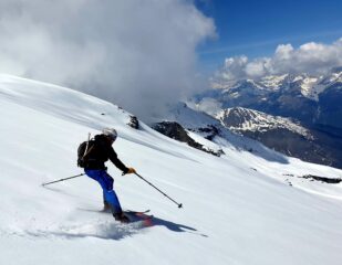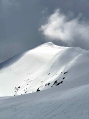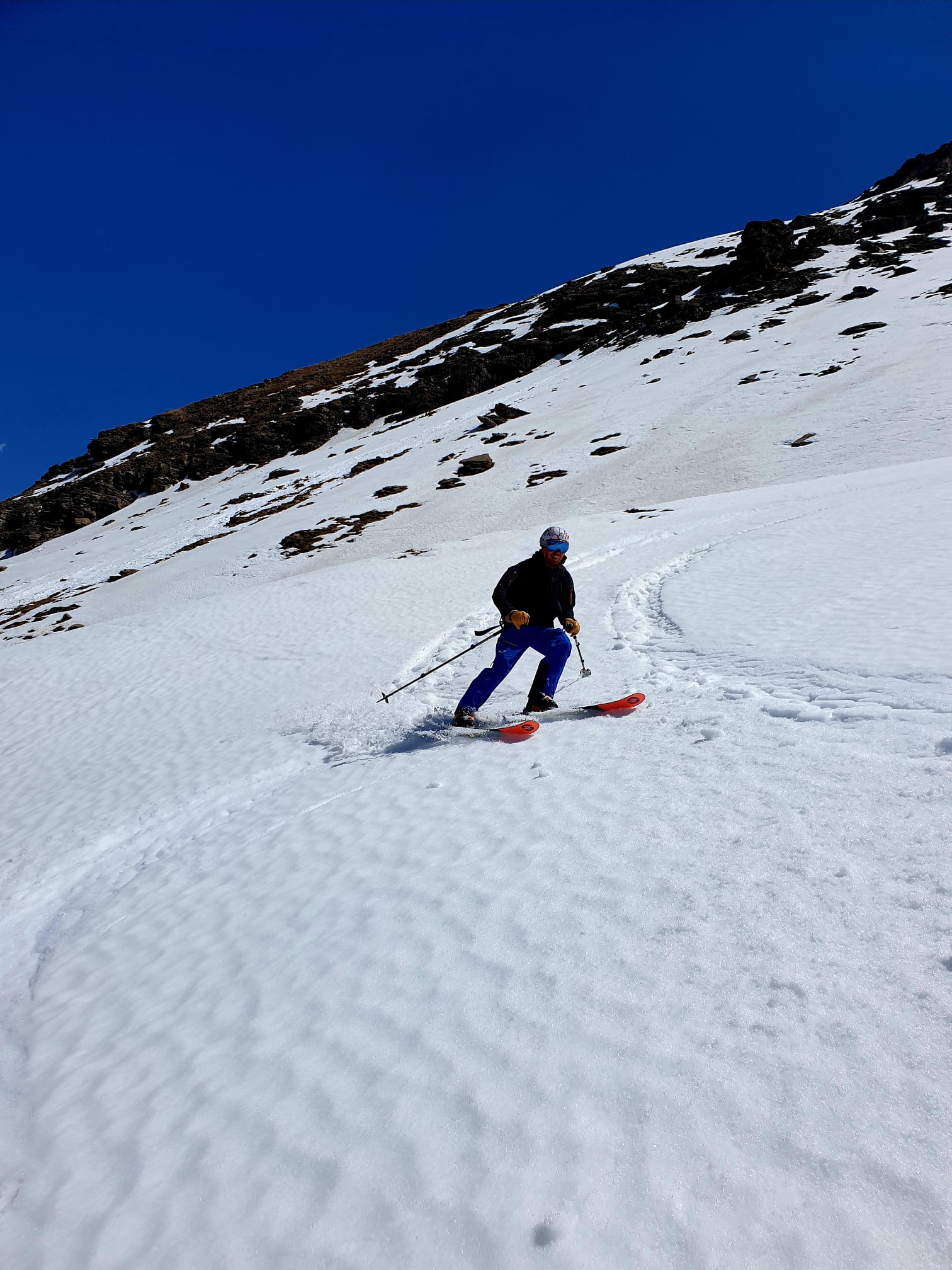 Partiti alle 6.30 circa. Portage di mezz’ora almeno. Purtroppo una linguetta di neve impediva di andare in macchina oltre la bergeria. In salita seguito un itinerario non corretto che ci ha obbligati ad attraversare un enorme cono di valanga e fare un pezzetto a piedi su sentiero. Ricongiunti all’itinerario corretto, affrontiamo il primo muro con rampant indispensabili, soprattutto successivamente nel passaggio appena prima dell’accesso ai pendii superiori, prima del lungo traverso. Da qui in poi tutto ok e arrivo in cima verso le 11.30. discesa spettacolare fino a 2900m, su pendii lisci e grippanti, non ancora smollati. Sotto i 2900 neve marcia e poco agevole, soprattutto nel muro.