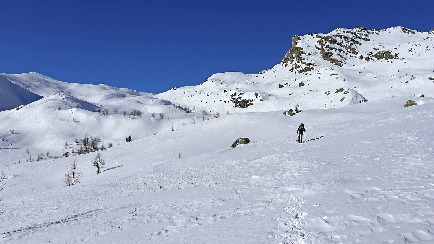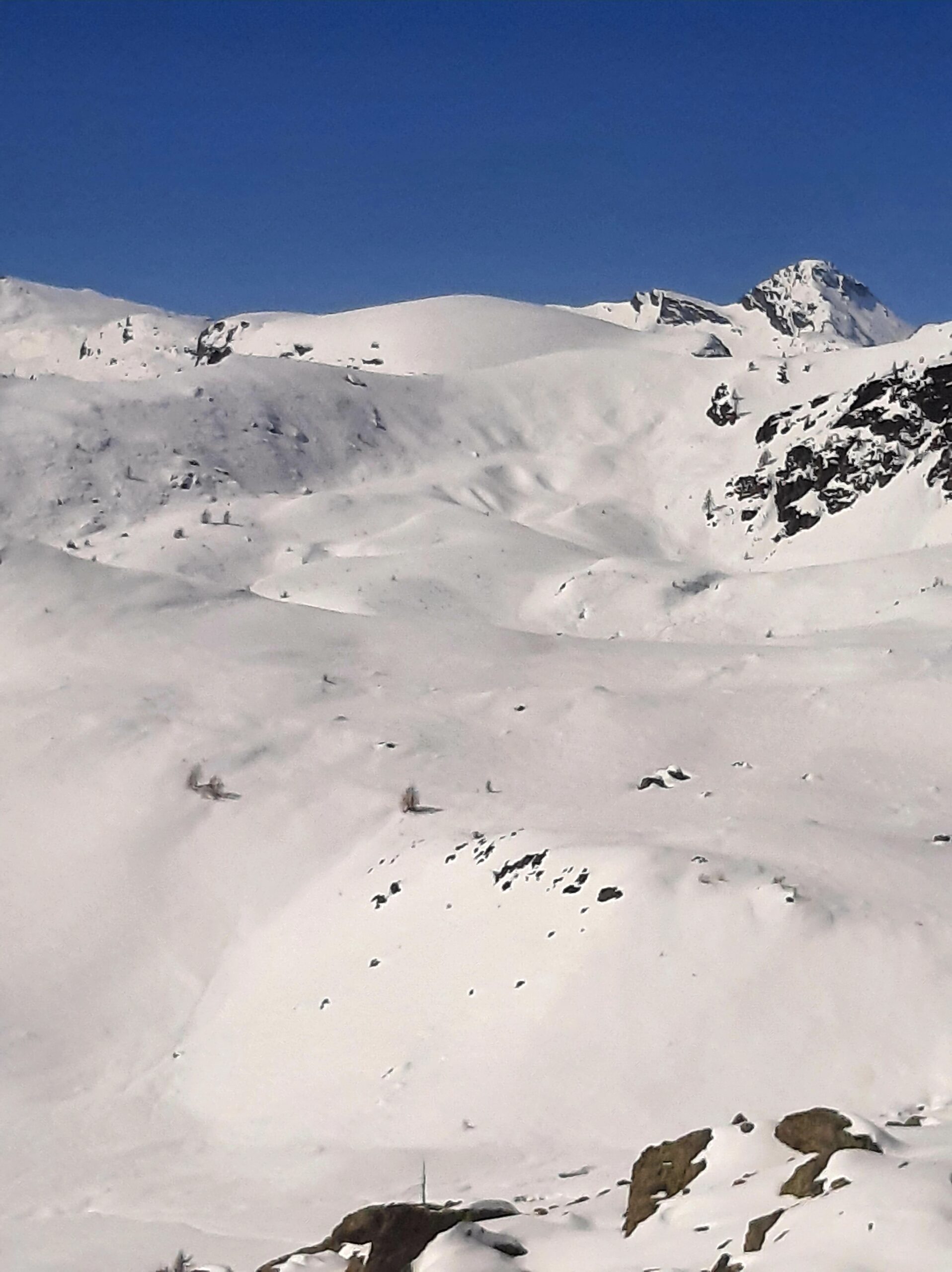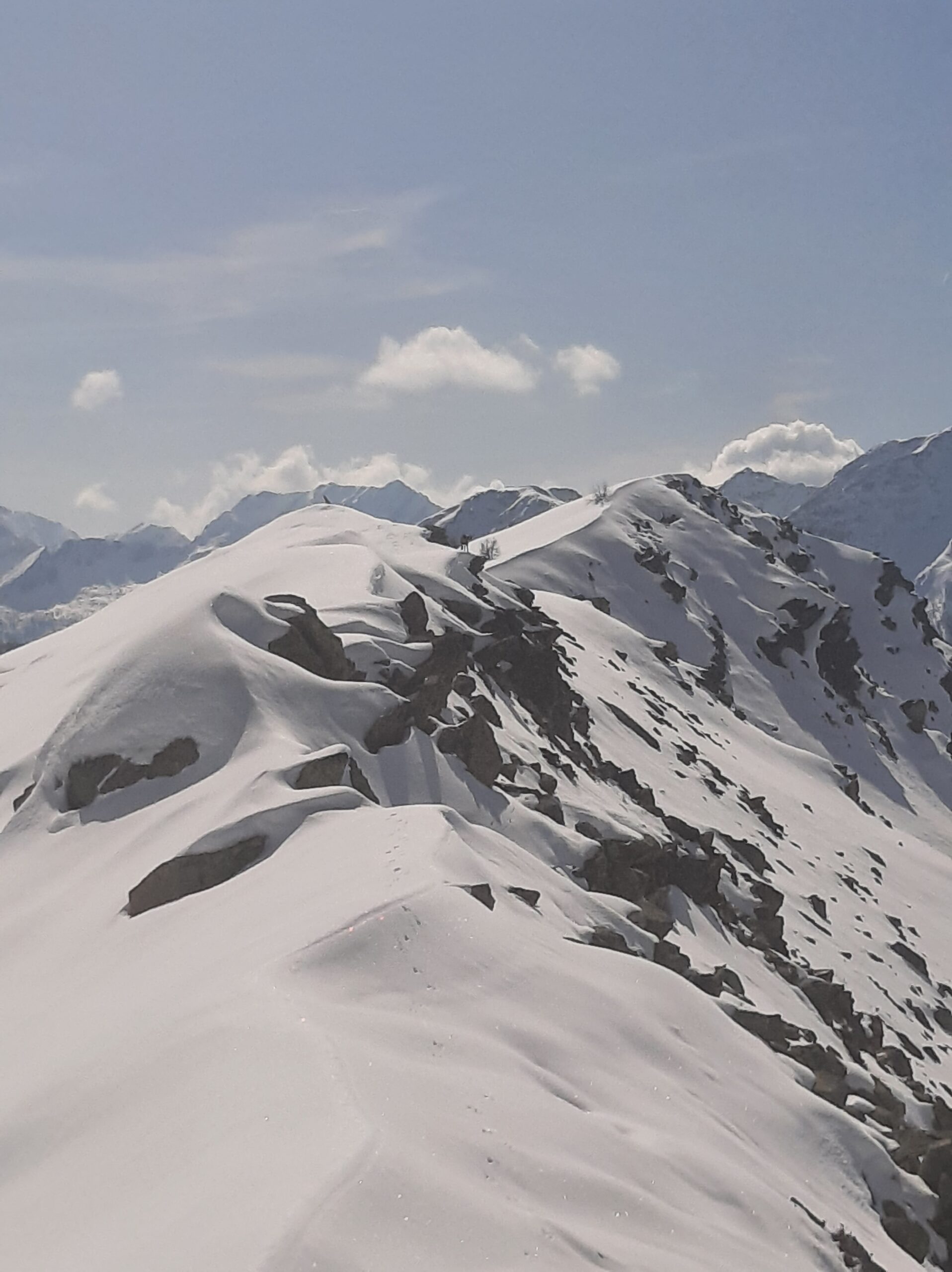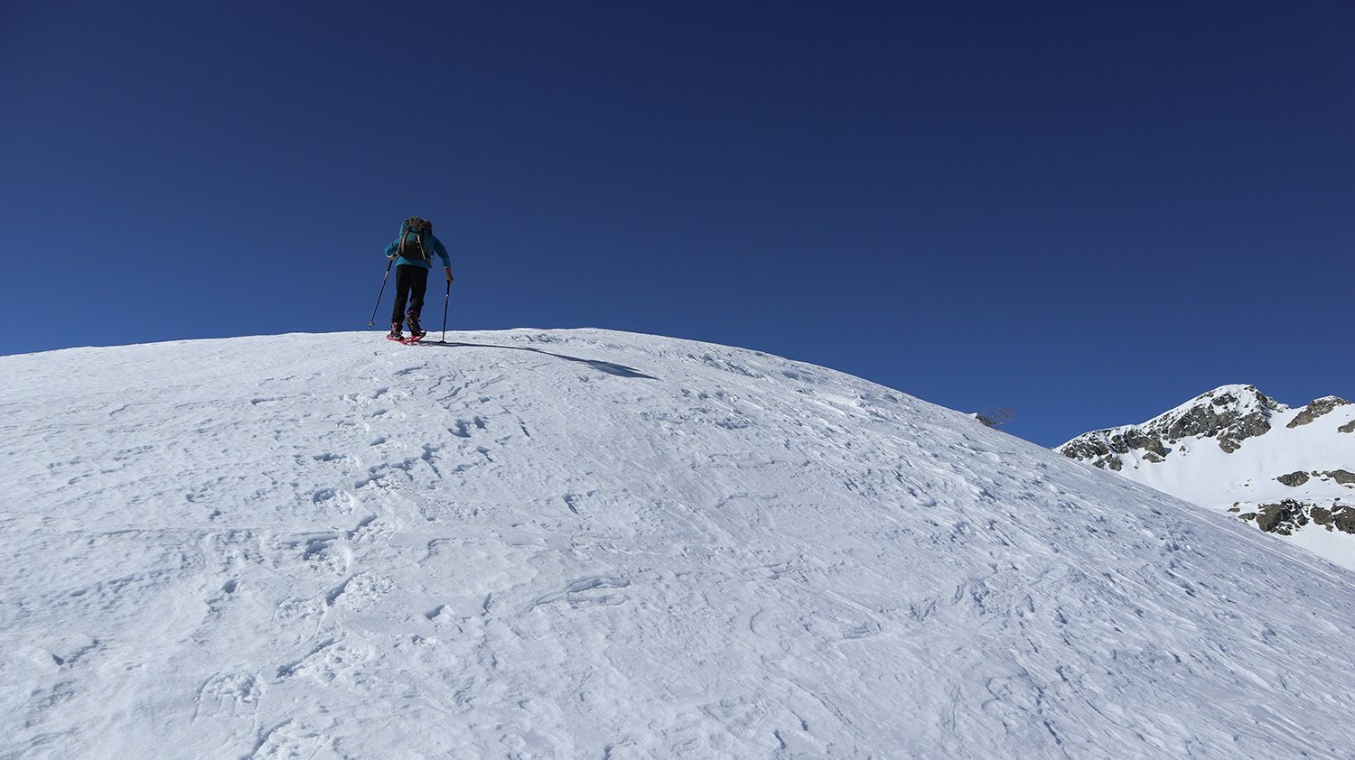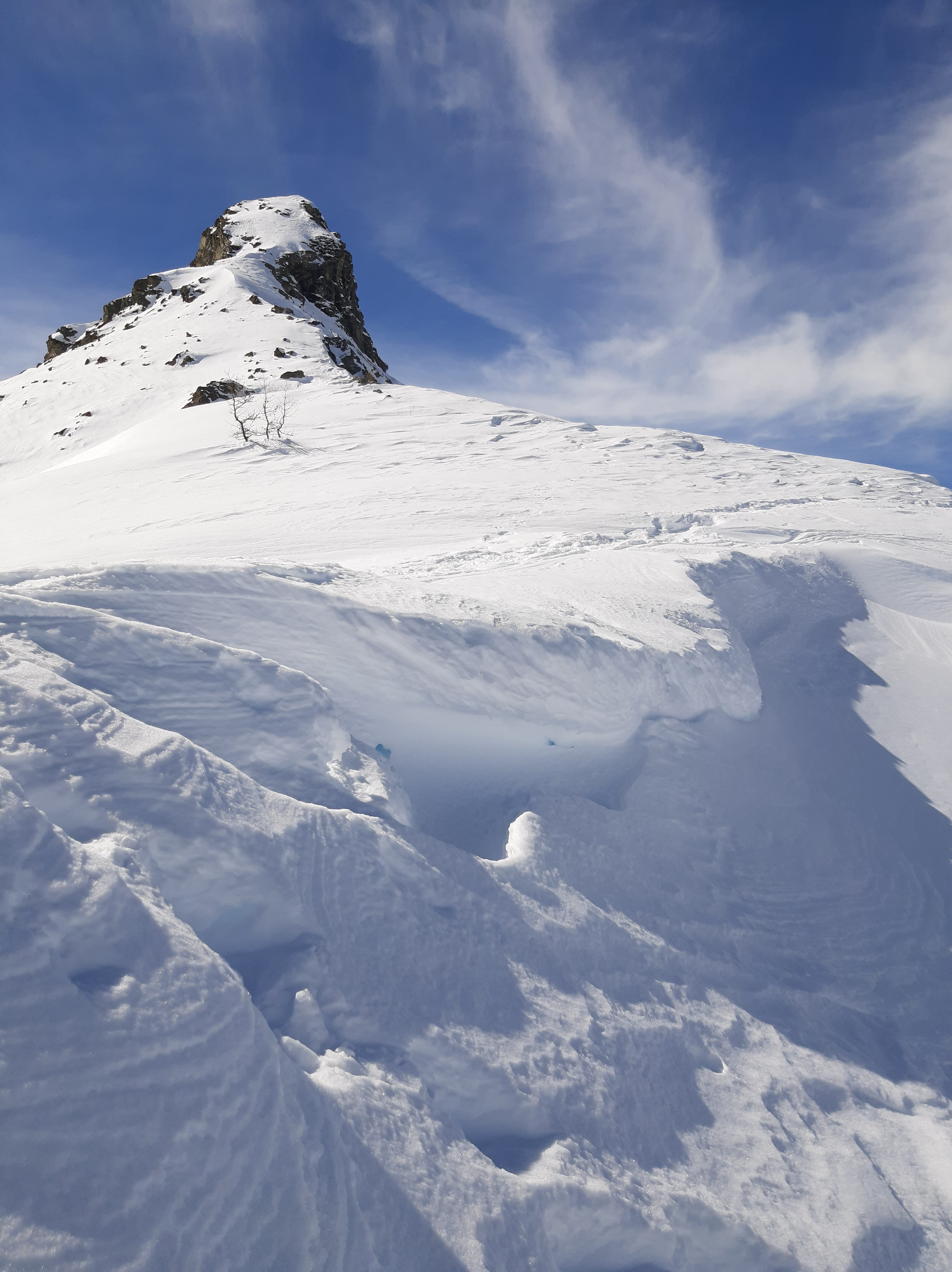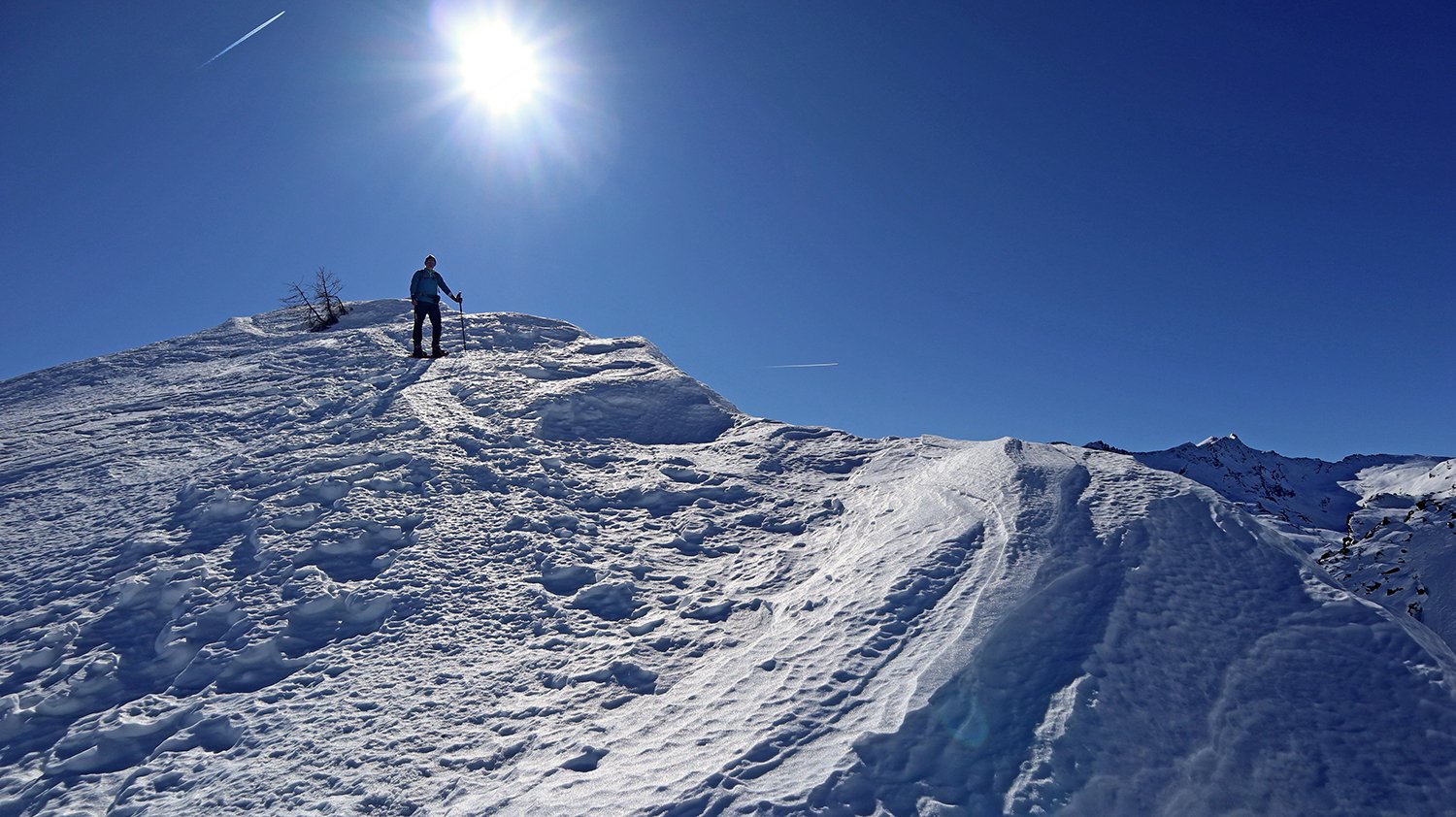 Da qui il percorso rimanente è molto evidente, con la vetta di fronte in direzione sud. Si raggiunge un rudere di alpeggio 2176 m. Oltre si apre il pendio finale, che si può risalire direttamente (moderata pendenza), oppure aggirare a destra raggiungendo un colletto. Da qui pochi metri lungo la comoda dorsale e si è in cima, 2289 m.