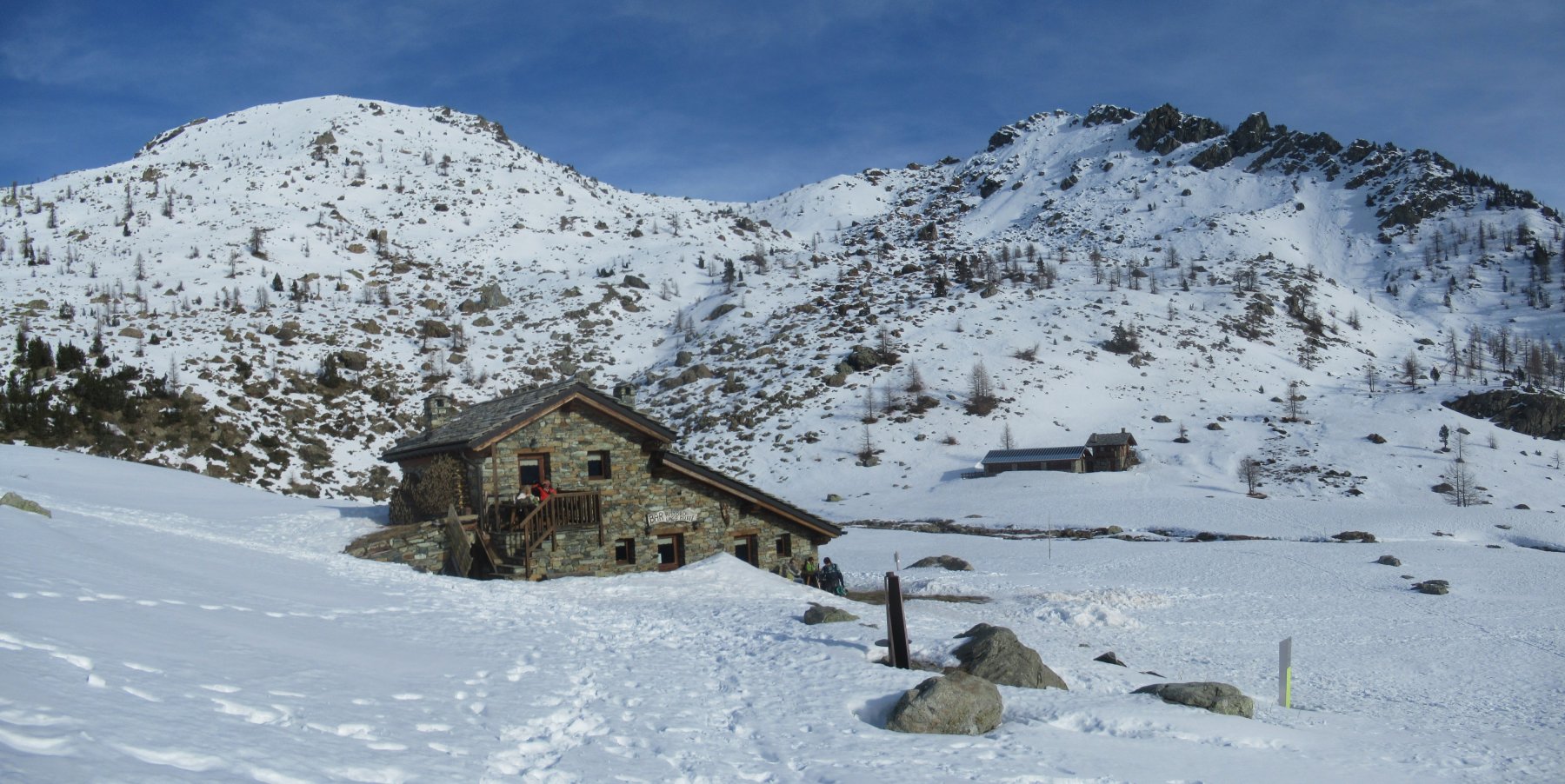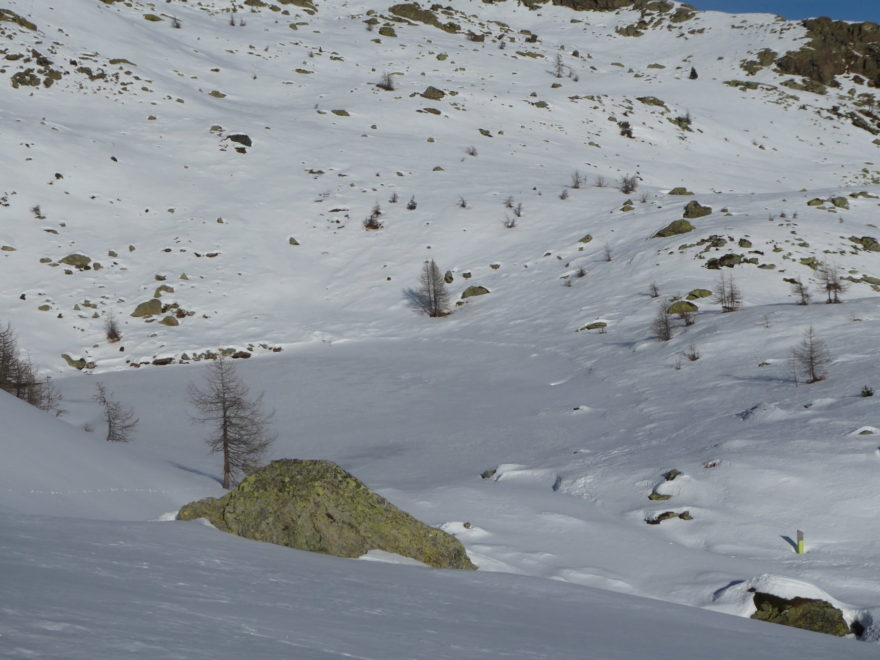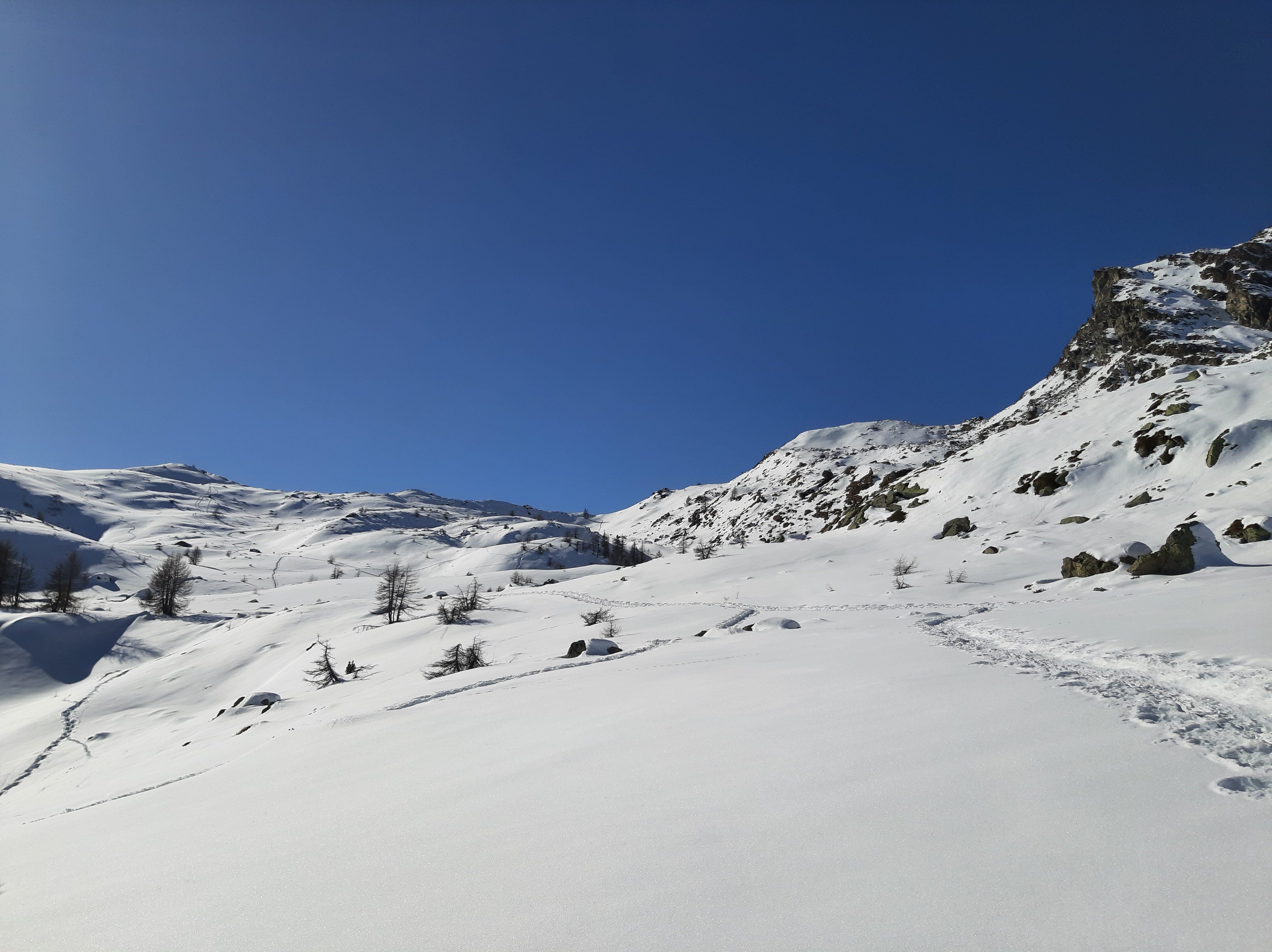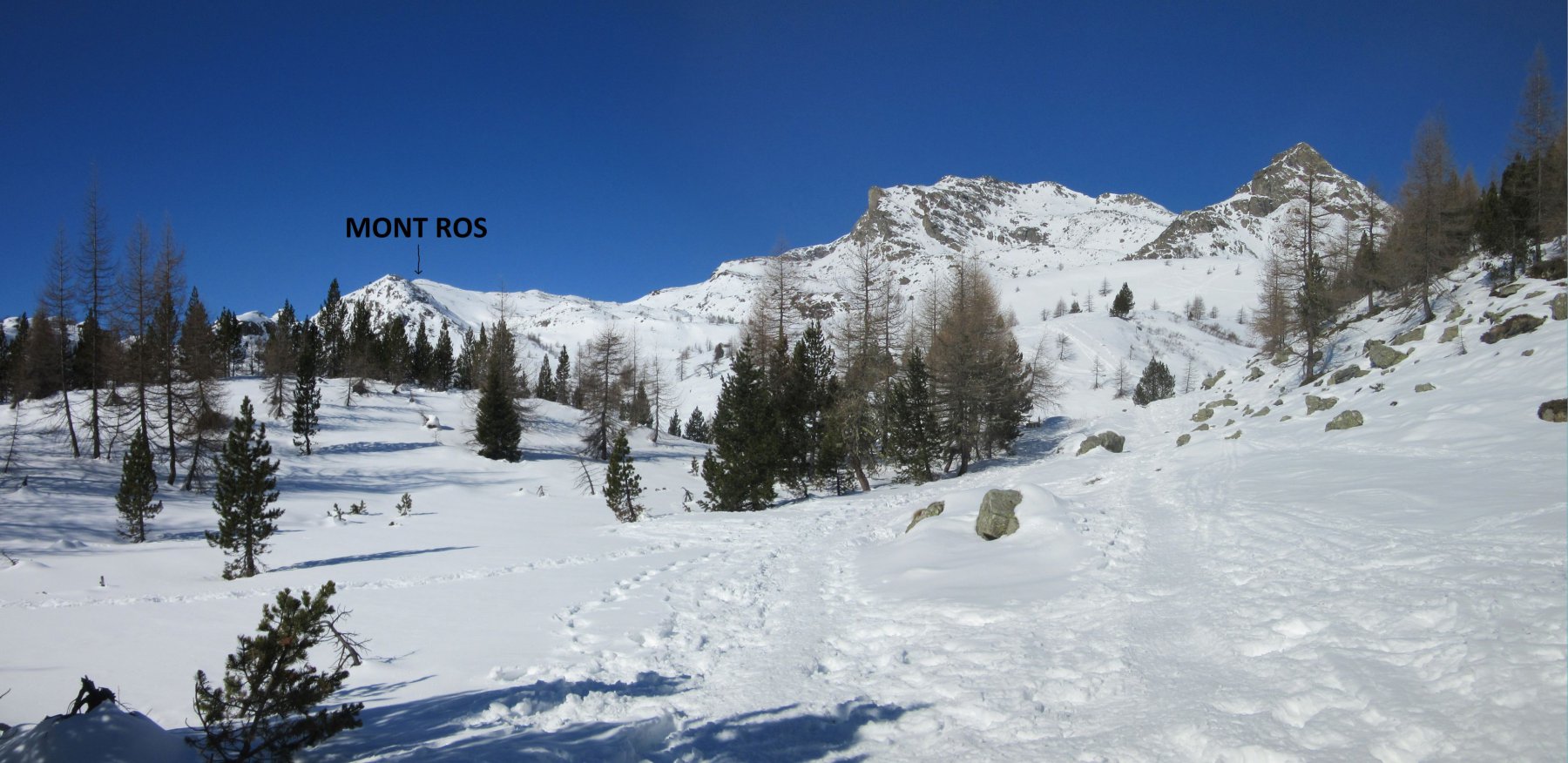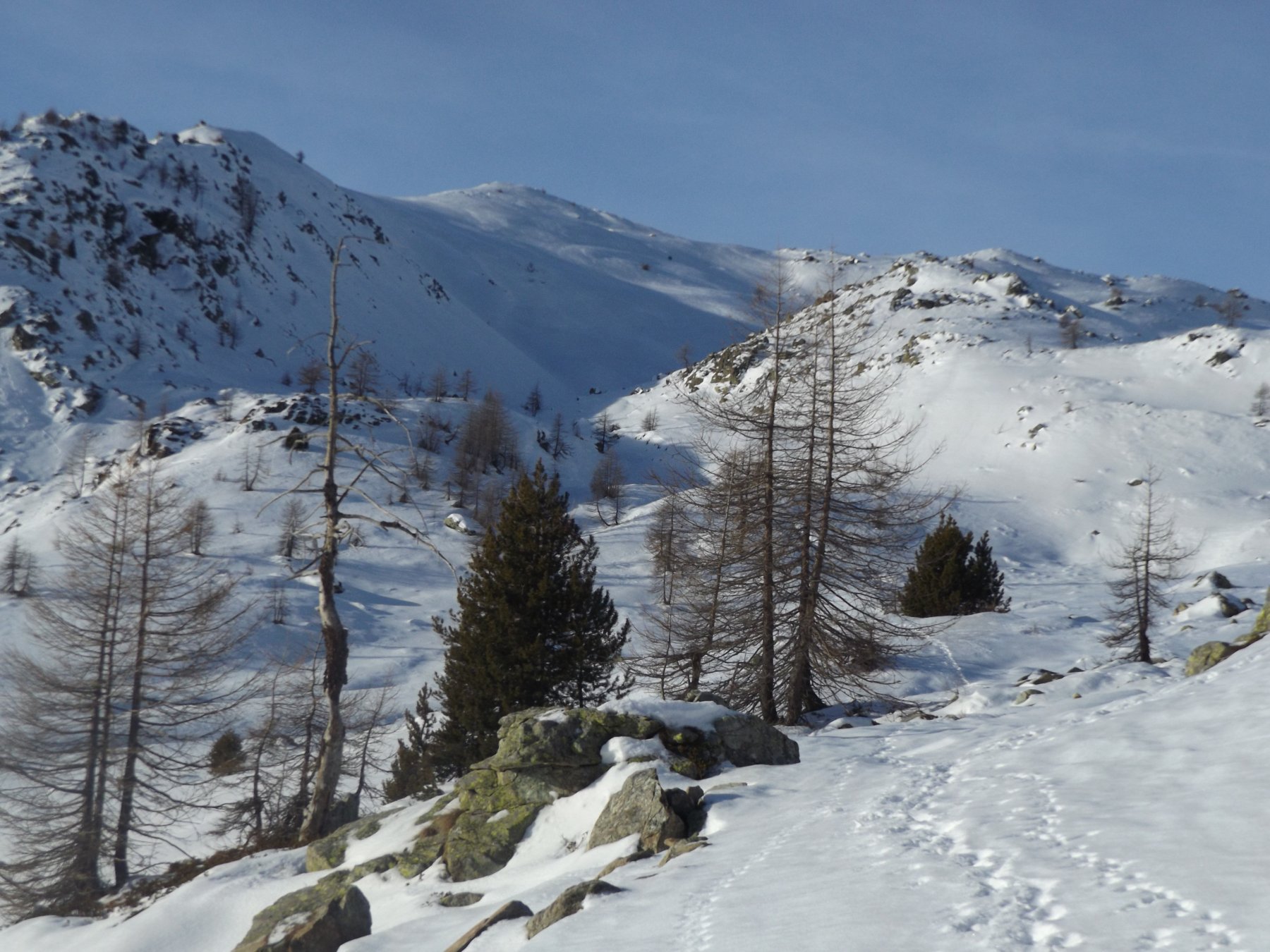 Dal parcheggio, si segue la strada per Dondena per alcune centinaia di metri, superati due tornanti, fino a raggiungere uno spiazzo con a destra una bacheca con cartina e indicazioni varie. Si segue quindi il sentiero che con alcuni scalini sale nella pineta, seguendo indicazioni per il lago Muffè e altre mete. Superato un primo tratto boschivo, si giunge in un ampio ripiano con una baita in posizione panoramica. Si prosegue a monte di essa, riprendendo il sentiero che prosegue nel bosco, fino a raggiungere una radura più aperta, nei pressi di un bivio per il Lago Muffè (sentiero estivo-sentiero invernale) a circa 1950 m. Qui si prosegue a sinistra, iniziando un traverso sul percorso di un sentiero estivo, che passa nei pressi di una costruzione in cemento dell’acquedotto. Si prosegue il traverso fino nei pressi dell’Alpe Vernoille, non lontana dall’omonimo lago. Si può anche passare dal bellissimo Lago Muffè, contornarlo a sinistra, e con semicerchio sempre verso sinistra giungere a Vernoille.