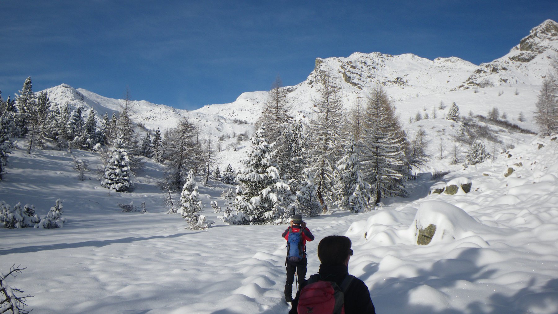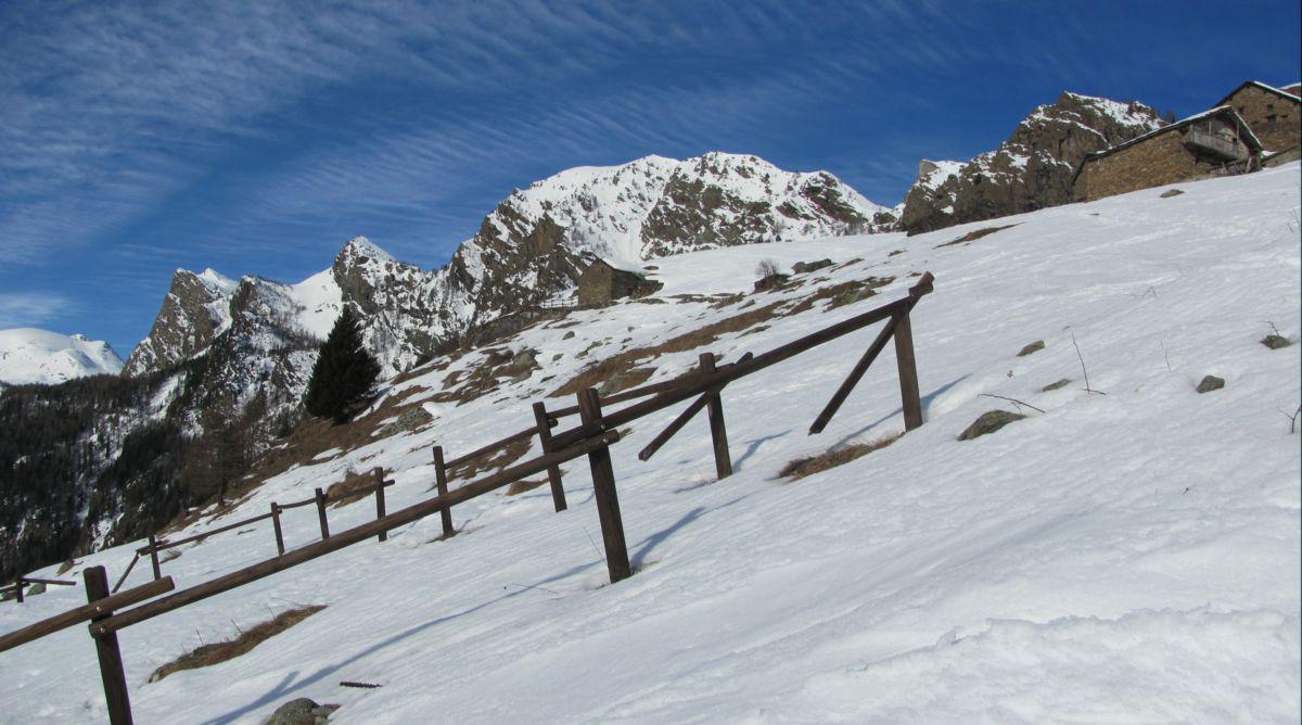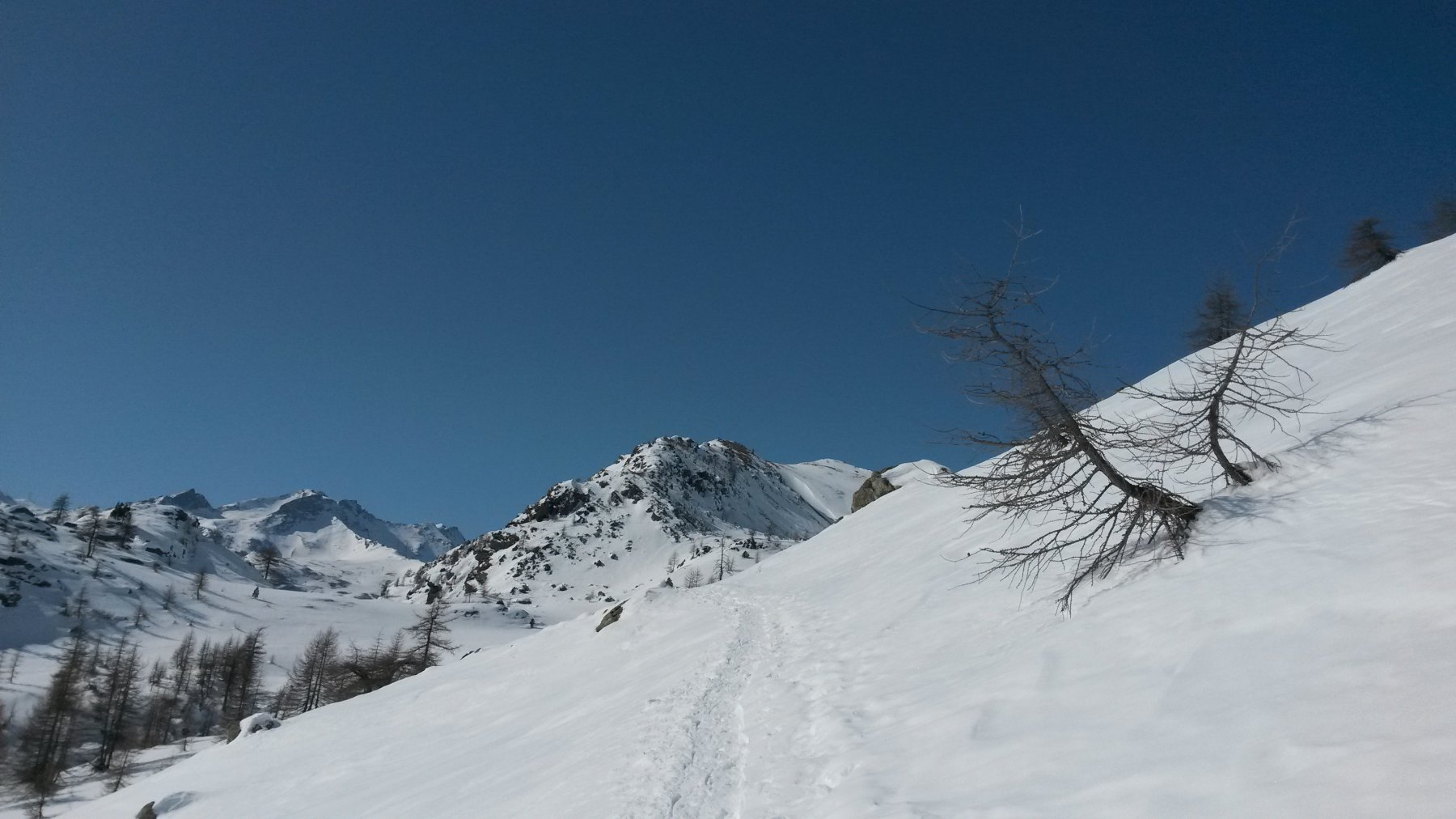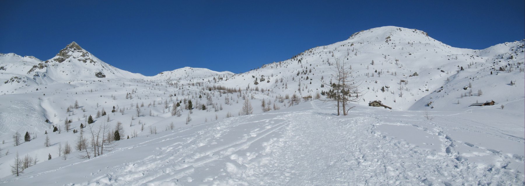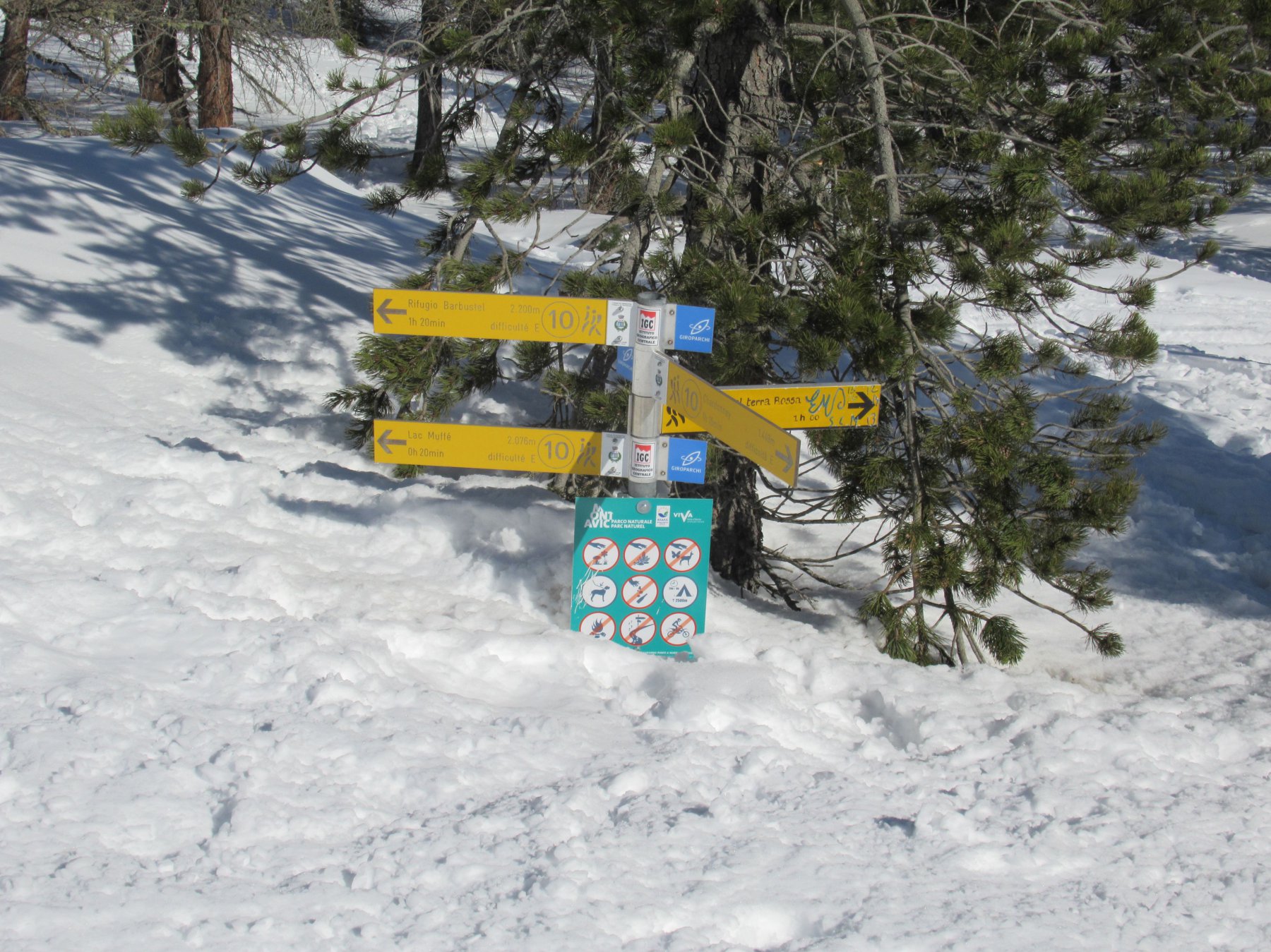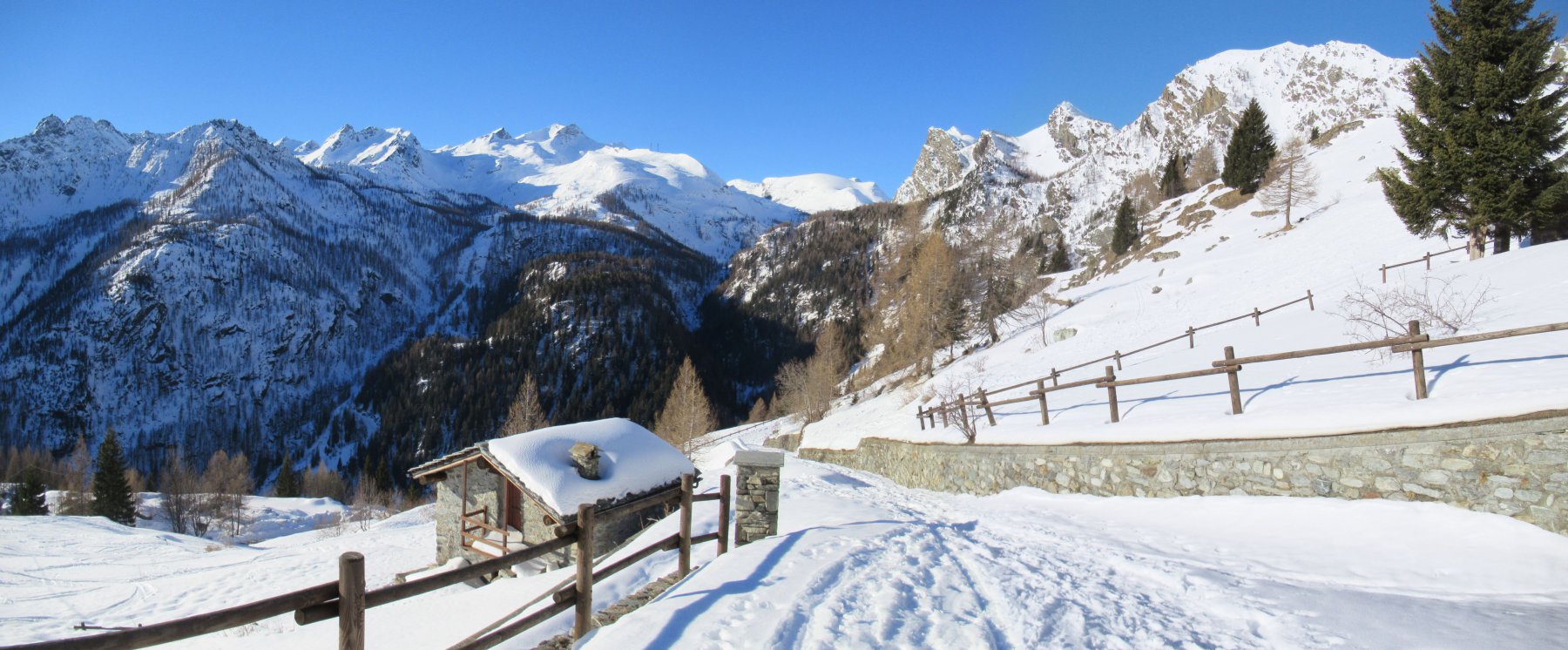 Dal parcheggio, si segue la strada per Dondena per alcune centinaia di metri, superati due tornanti, fino a raggiungere uno spiazzo con a destra una bacheca con cartina e indicazioni varie. Si segue quindi il sentiero che con alcuni scalini sale nella pineta, seguendo indicazioni per il lago Muffè e altre mete. Superato un primo tratto boschivo, si giunge in un ampio ripiano con una baita in posizione panoramica. Si prosegue a monte di essa, riprendendo il sentiero che prosegue nel bosco, fino a raggiungere una radura più aperta, nei pressi di un bivio per il Lago Muffè (sentiero estivo-sentiero invernale) a circa 1950 m. Qui si prosegue a sinistra, iniziando un traverso sul percorso di un sentiero estivo, che passa nei pressi di una costruzione in cemento dell’acquedotto. Si prosegue il traverso fino nei pressi dell’Alpe Vernoille, non lontana dall’omonimo lago. Si può anche passare dal bellissimo Lago Muffè, contornarlo a sinistra, e con semicerchio sempre verso sinistra giungere a Vernoille.