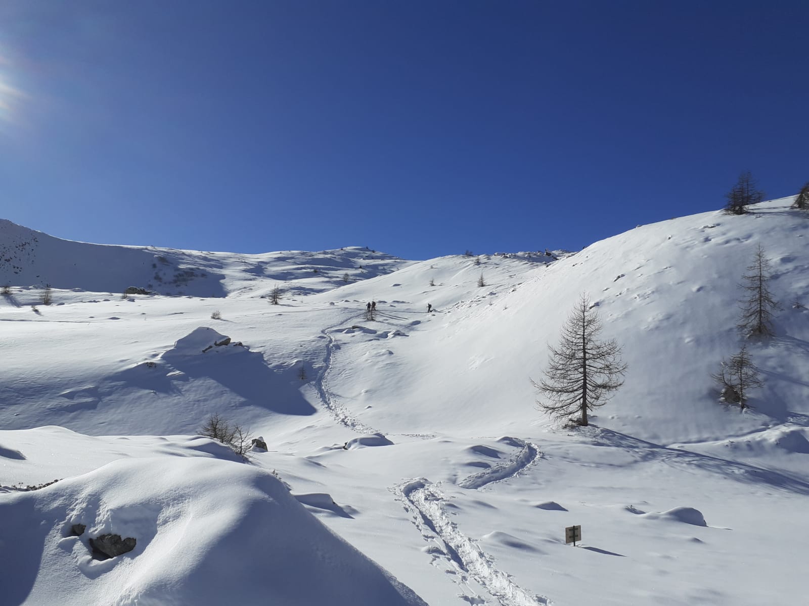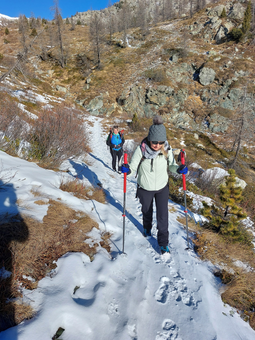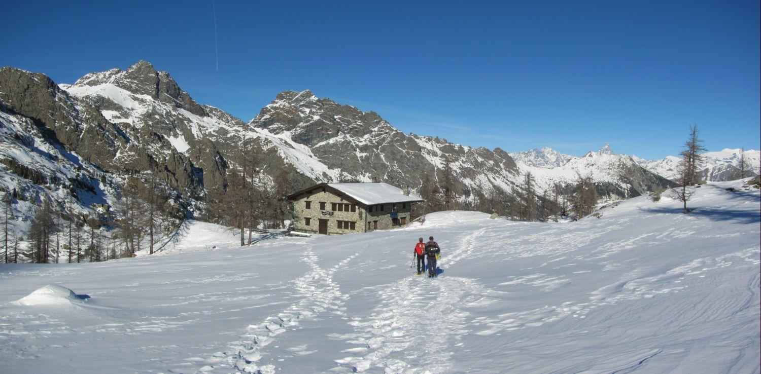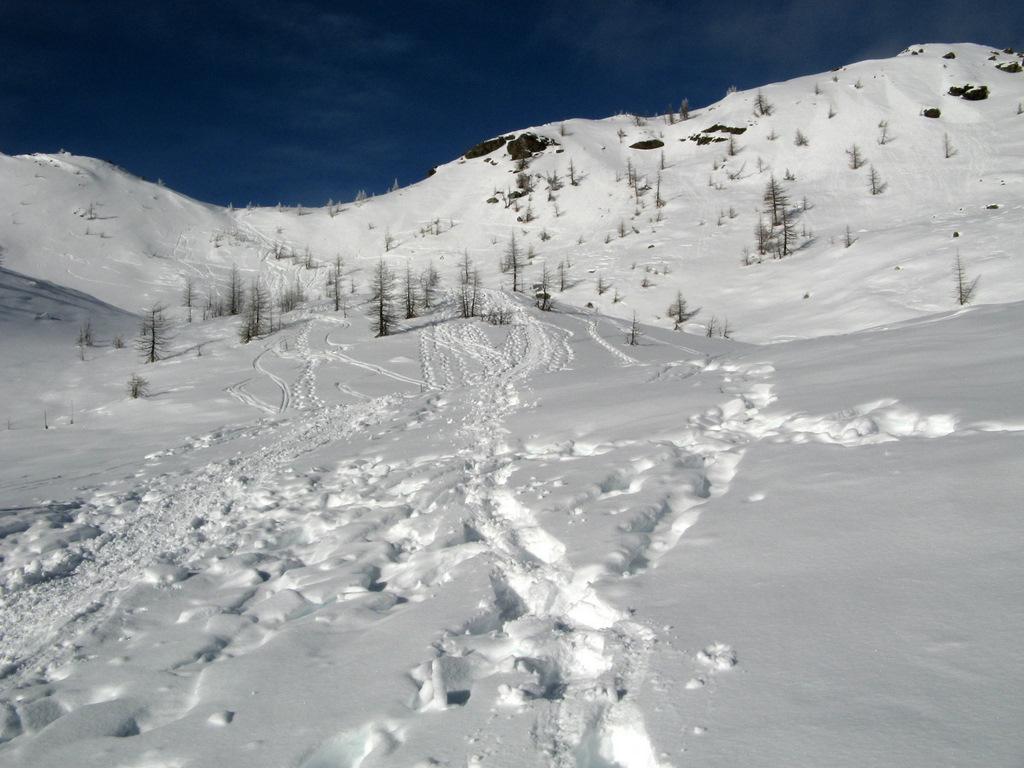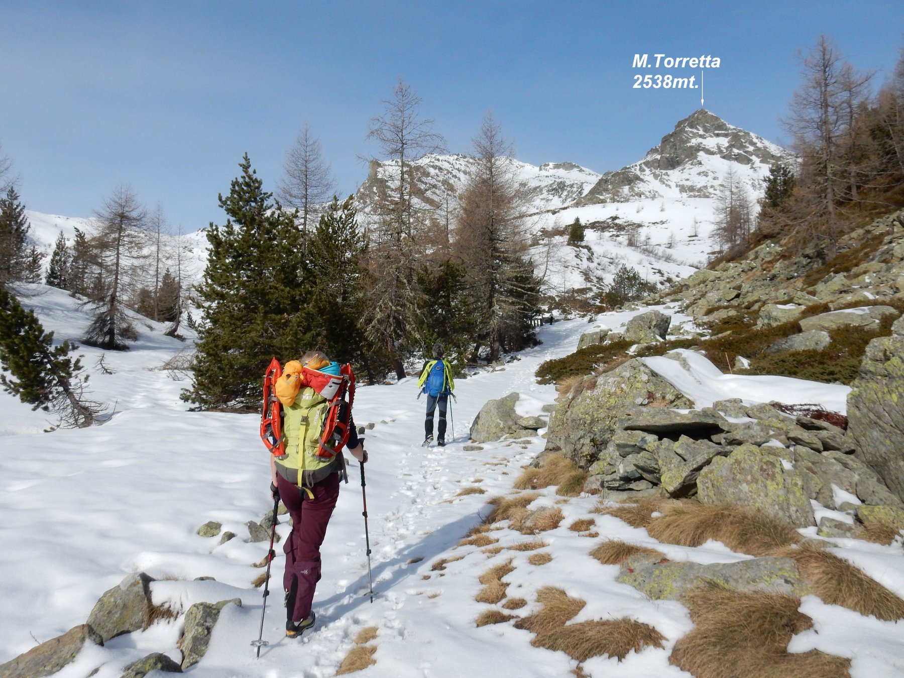 Dal parcheggio, si segue la strada per Dondena per alcune centinaia di metri, superati due tornanti, fino a raggiungere uno spiazzo con a destra una bacheca con cartina e indicazioni varie. Si segue quindi il sentiero che con alcuni scalini sale nella pineta, seguendo indicazioni per il lago Muffè e altre mete. Superato un primo tratto boschivo, si giunge in un ampio ripiano con una baita in posizione panoramica. Si prosegue a monte di essa, riprendendo il sentiero che prosegue nel bosco, fino a raggiungere una radura più aperta, nei pressi di un bivio per il Lago Muffè (sentiero estivo-sentiero invernale) a circa 1950 m. Qui si prosegue a sinistra, iniziando un traverso sul percorso di un sentiero estivo, che passa nei pressi di una costruzione in cemento dell’acquedotto. Si prosegue il traverso fino nei pressi dell’Alpe Vernoille, non lontana dall’omonimo lago. Si può anche passare dal bellissimo Lago Muffè, contornarlo a sinistra, e con semicerchio sempre verso sinistra giungere a Vernoille.