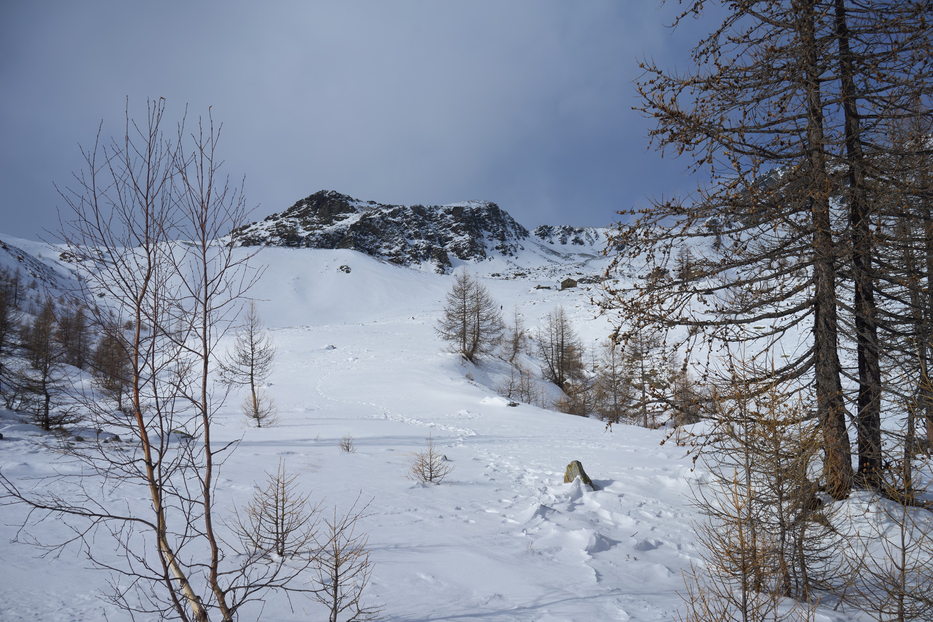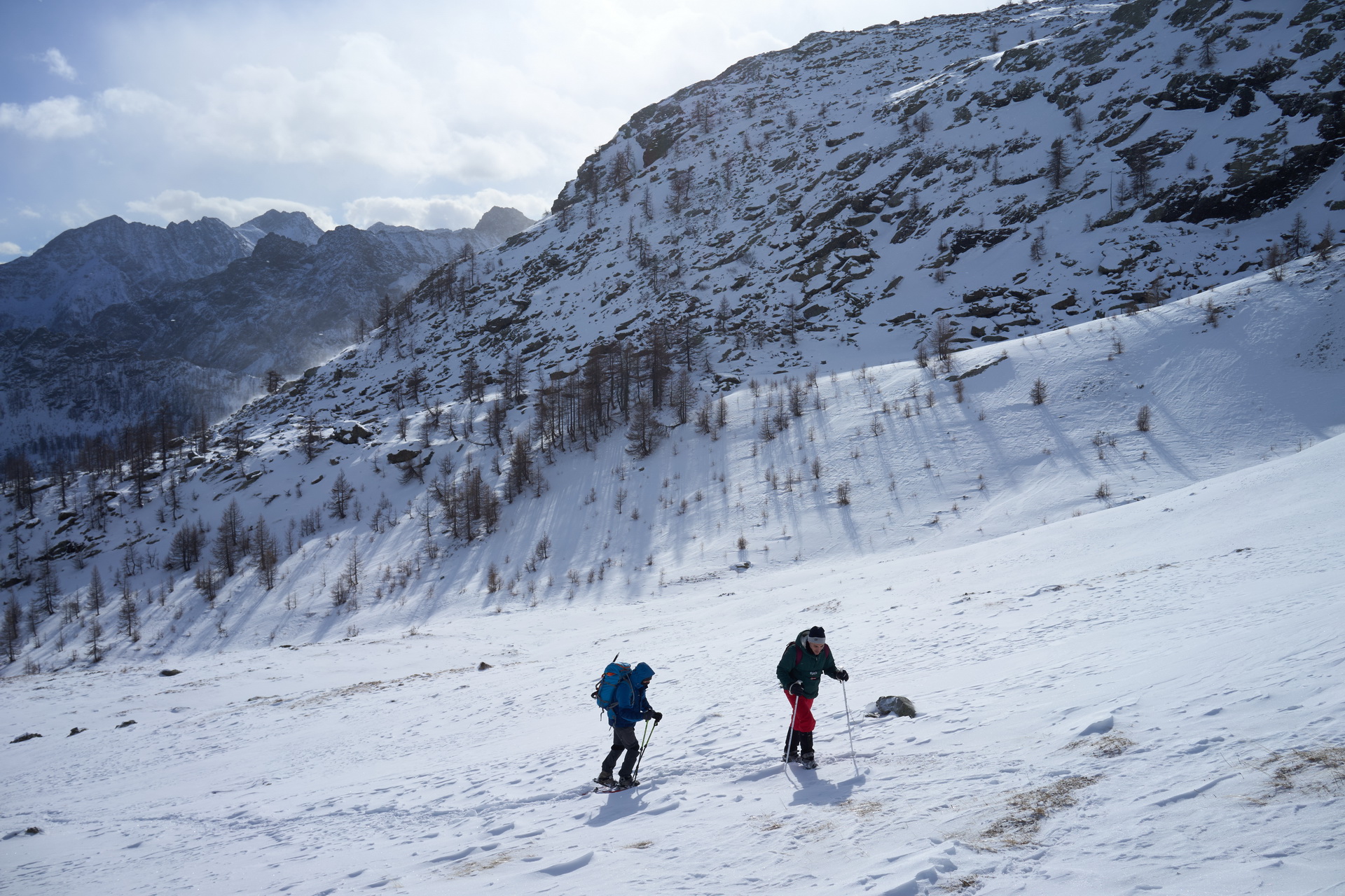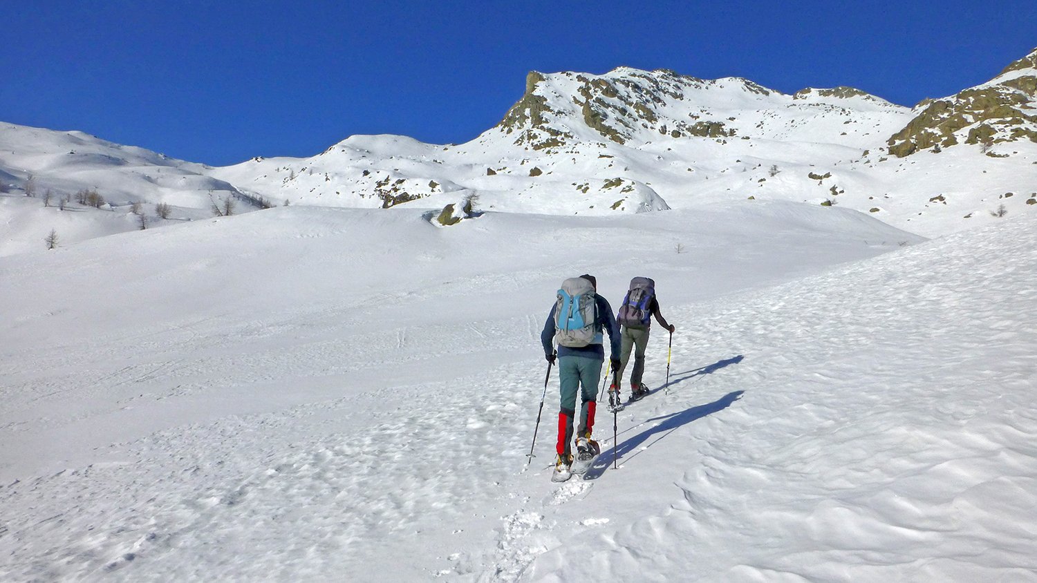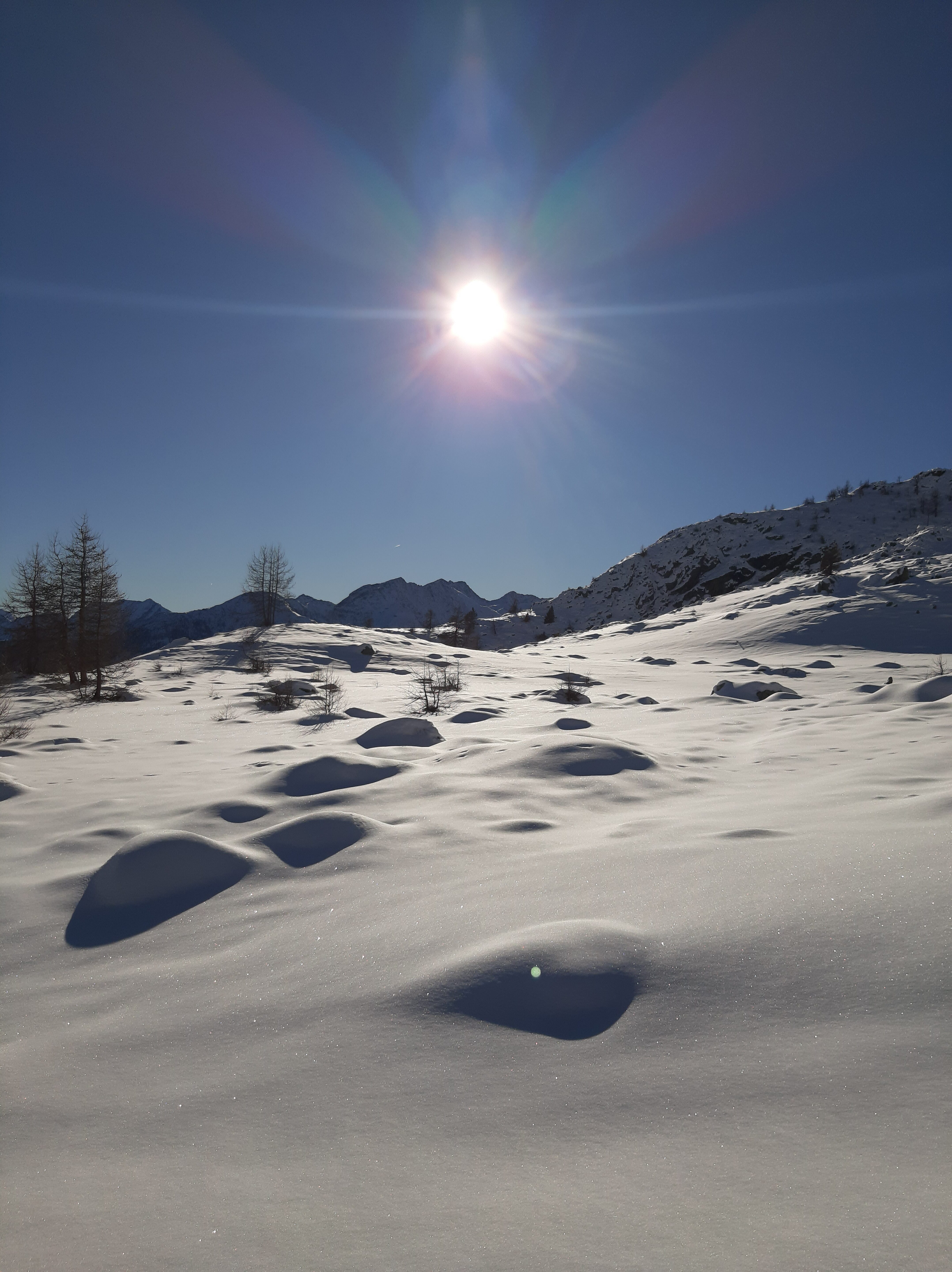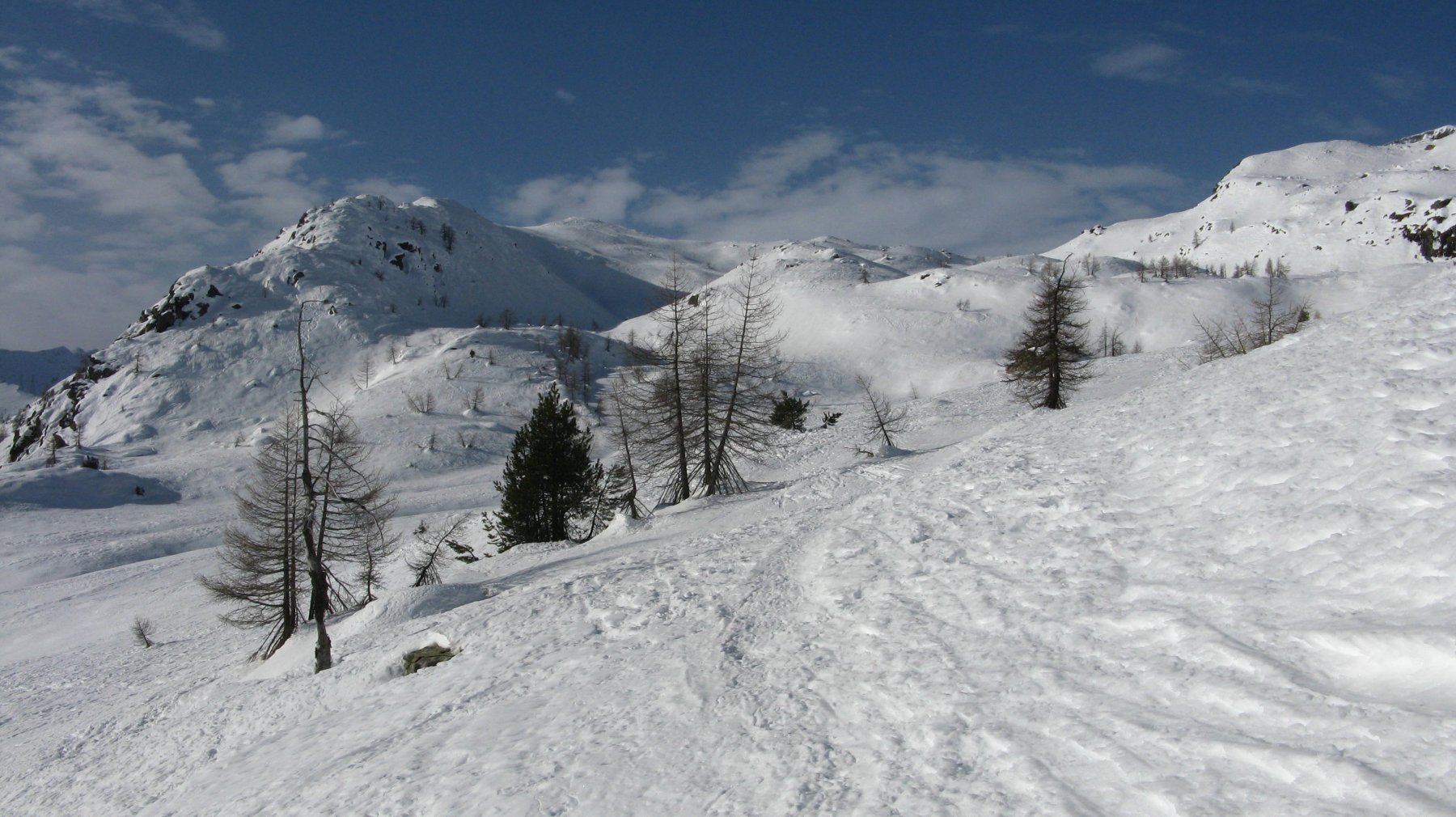 Dal parcheggio, si segue la strada per Dondena per alcune centinaia di metri, superati due tornanti, fino a raggiungere uno spiazzo con a destra una bacheca con cartina e indicazioni varie. Si segue quindi il sentiero che con alcuni scalini sale nella pineta, seguendo indicazioni per il lago Muffè e altre mete. Superato un primo tratto boschivo, si giunge in un ampio ripiano con una baita in posizione panoramica. Si prosegue a monte di essa, riprendendo il sentiero che prosegue nel bosco, fino a raggiungere una radura più aperta, nei pressi di un bivio per il Lago Muffè (sentiero estivo-sentiero invernale) a circa 1950 m. Qui si prosegue a sinistra, iniziando un traverso sul percorso di un sentiero estivo, che passa nei pressi di una costruzione in cemento dell’acquedotto. Si prosegue il traverso fino nei pressi dell’Alpe Vernoille, non lontana dall’omonimo lago. Si può anche passare dal bellissimo Lago Muffè, contornarlo a sinistra, e con semicerchio sempre verso sinistra giungere a Vernoille.