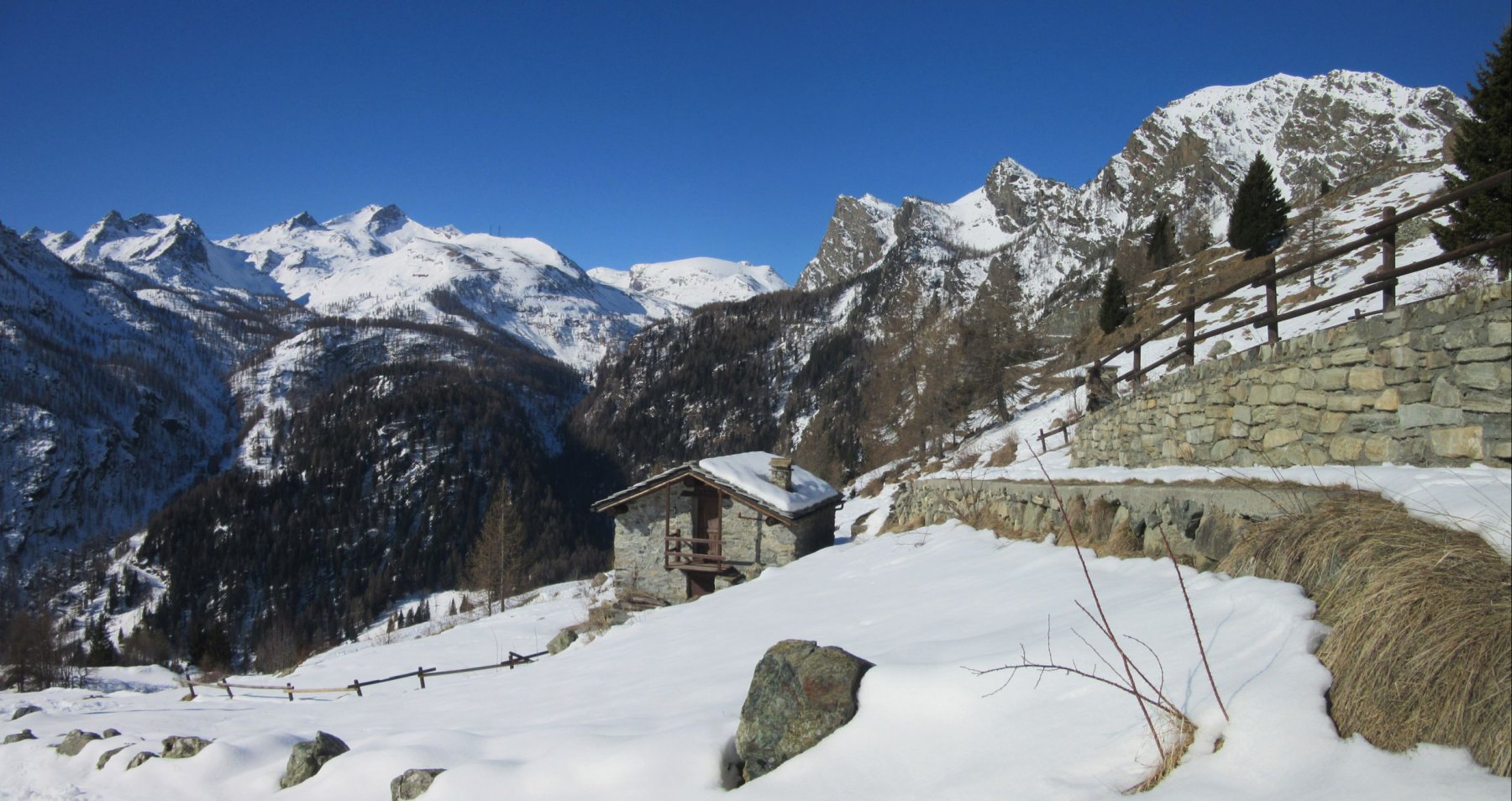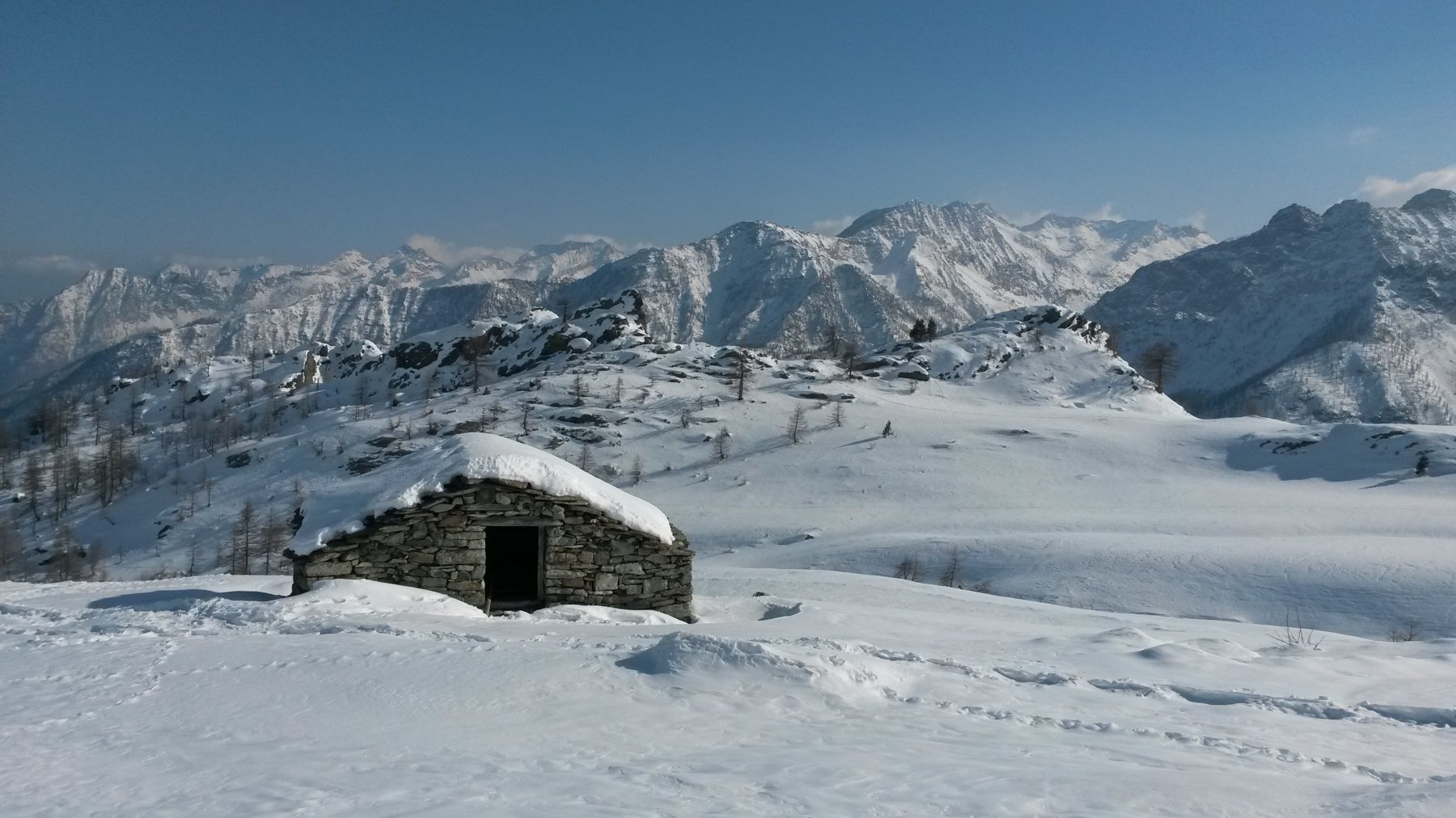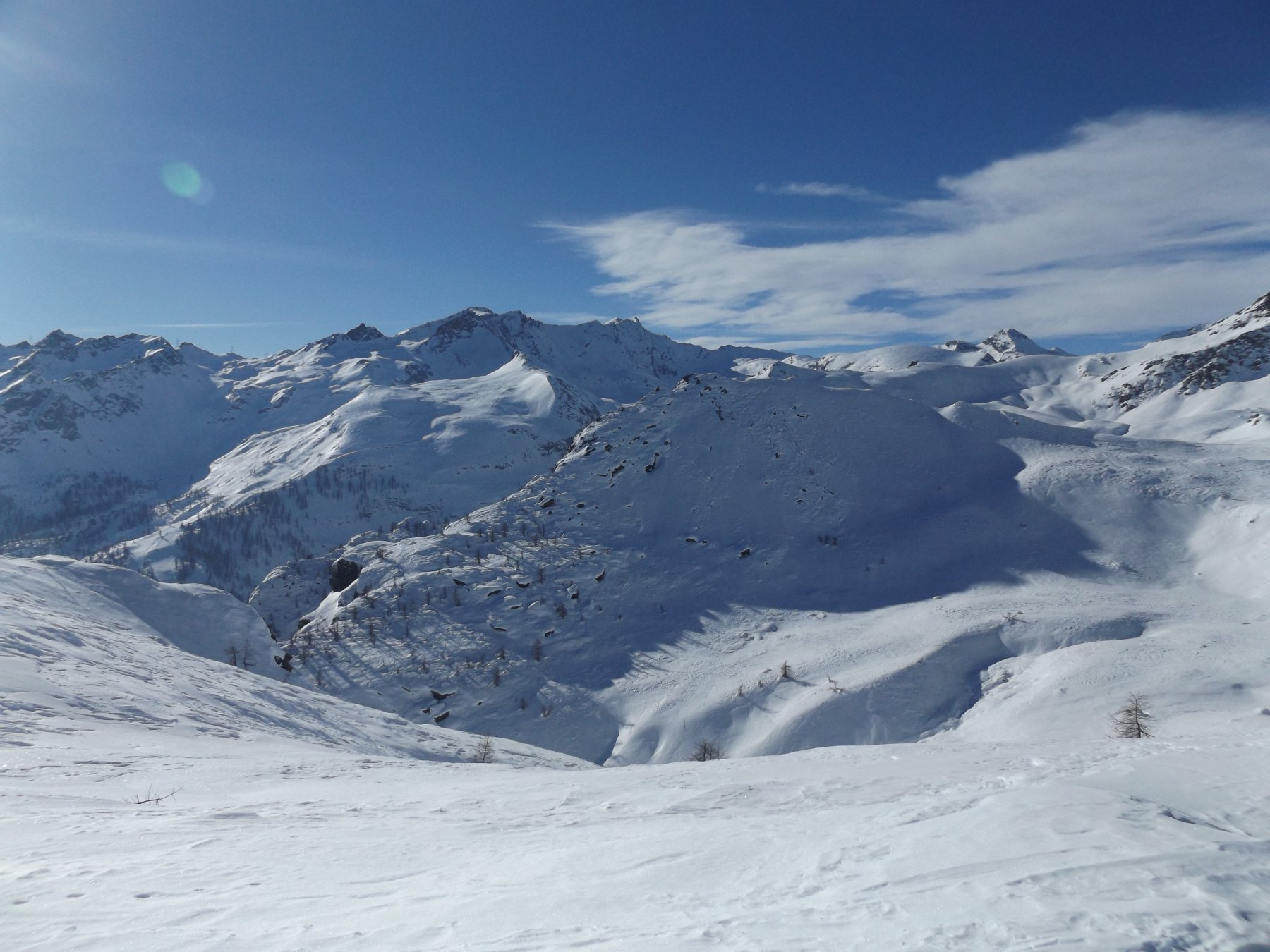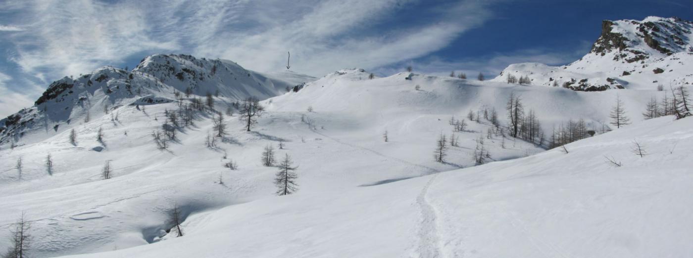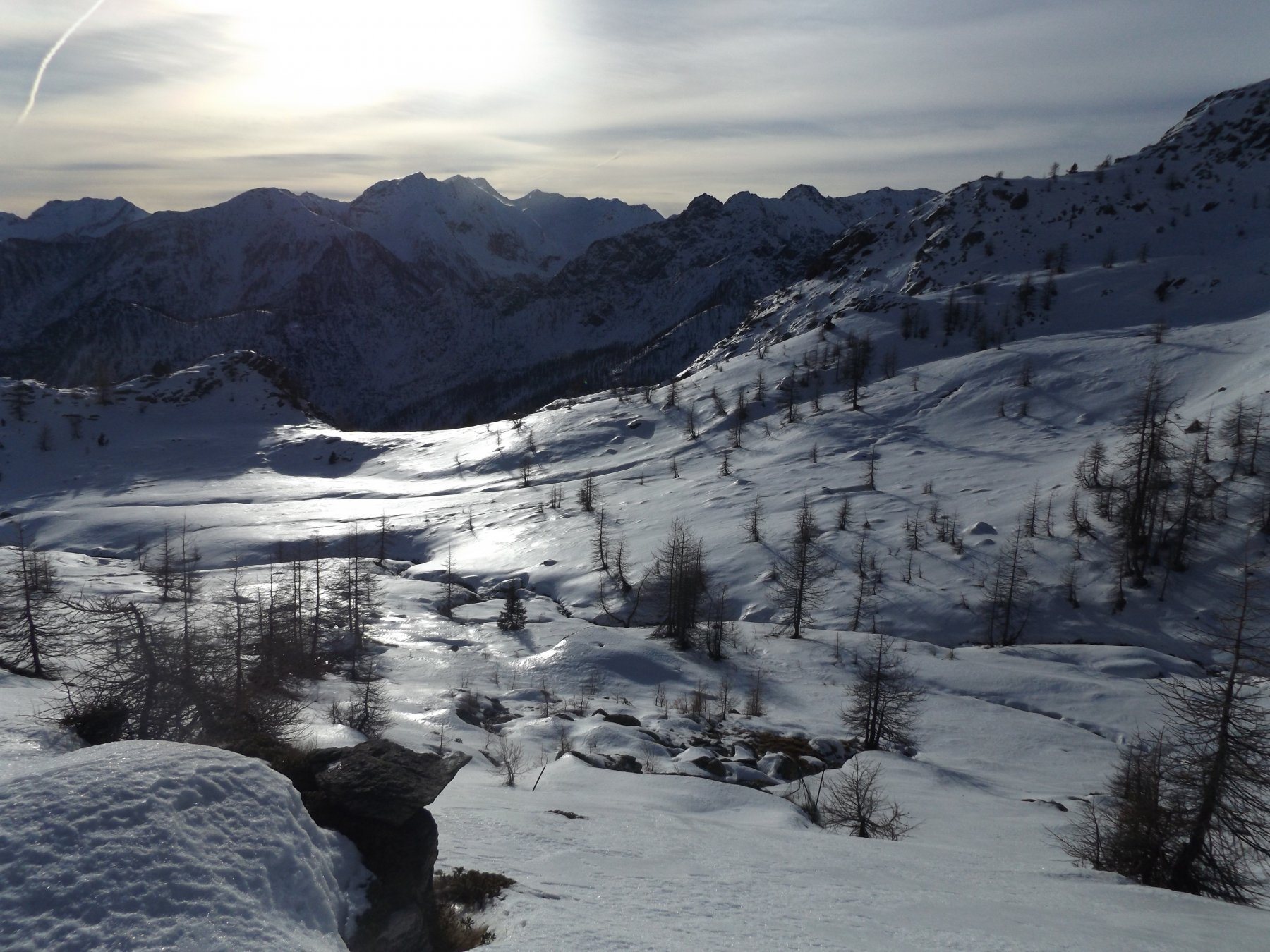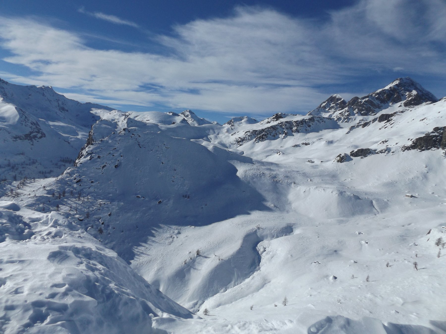 Dal parcheggio, si segue la strada per Dondena per alcune centinaia di metri, superati due tornanti, fino a raggiungere uno spiazzo con a destra una bacheca con cartina e indicazioni varie. Si segue quindi il sentiero che con alcuni scalini sale nella pineta, seguendo indicazioni per il lago Muffè e altre mete. Superato un primo tratto boschivo, si giunge in un ampio ripiano con una baita in posizione panoramica. Si prosegue a monte di essa, riprendendo il sentiero che prosegue nel bosco, fino a raggiungere una radura più aperta, nei pressi di un bivio per il Lago Muffè (sentiero estivo-sentiero invernale) a circa 1950 m. Qui si prosegue a sinistra, iniziando un traverso sul percorso di un sentiero estivo, che passa nei pressi di una costruzione in cemento dell’acquedotto. Si prosegue il traverso fino nei pressi dell’Alpe Vernoille, non lontana dall’omonimo lago. Si può anche passare dal bellissimo Lago Muffè, contornarlo a sinistra, e con semicerchio sempre verso sinistra giungere a Vernoille.