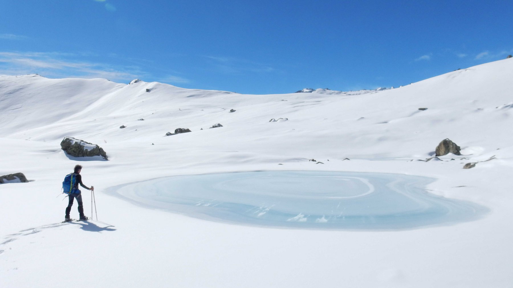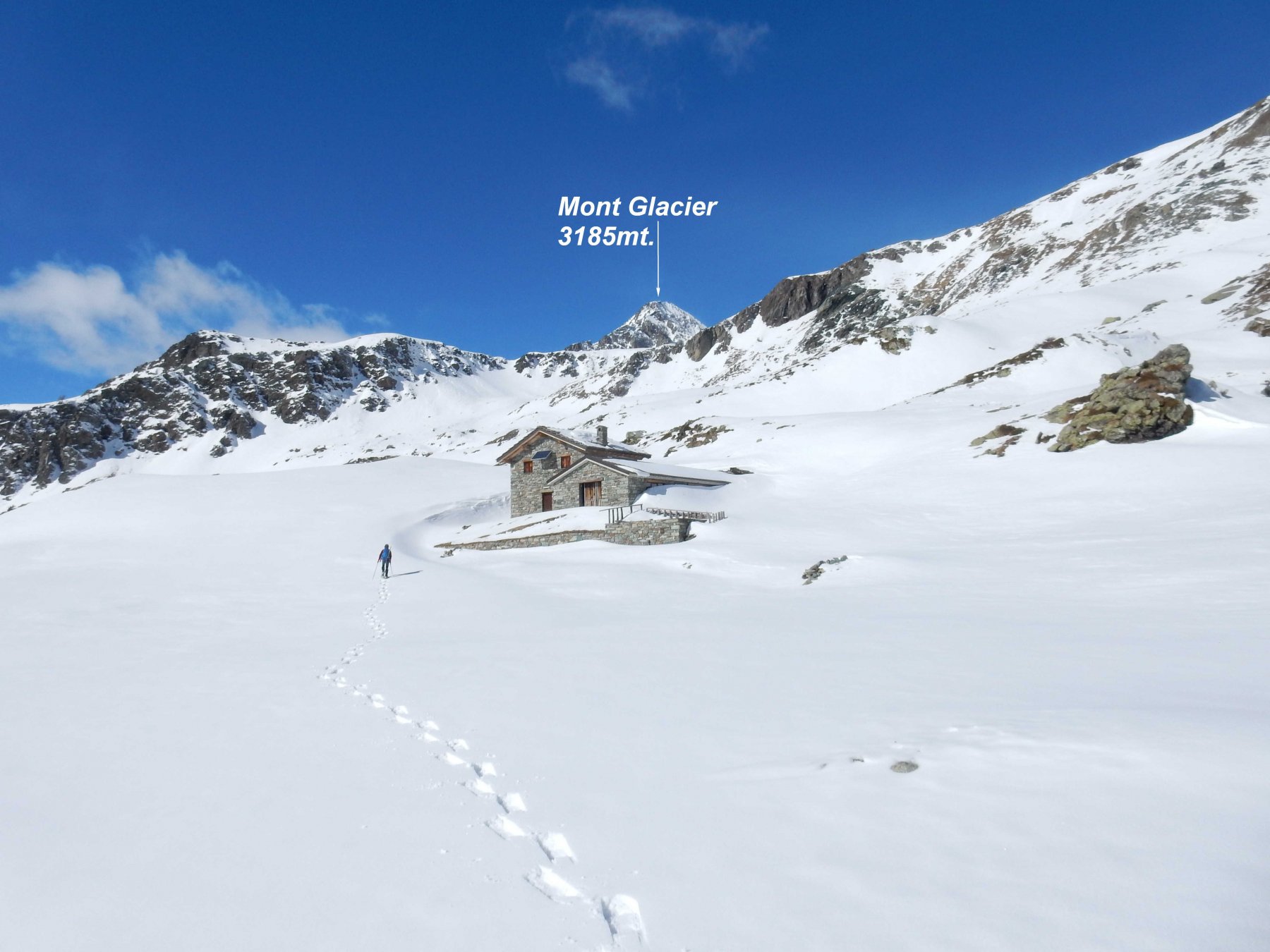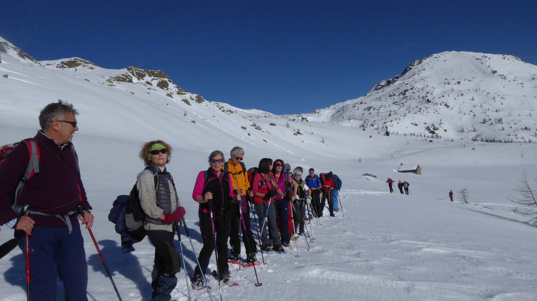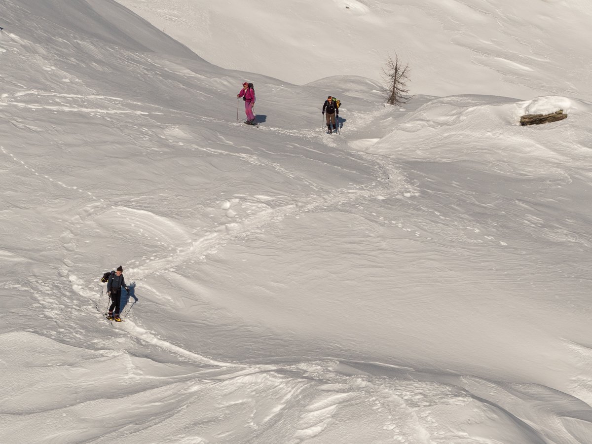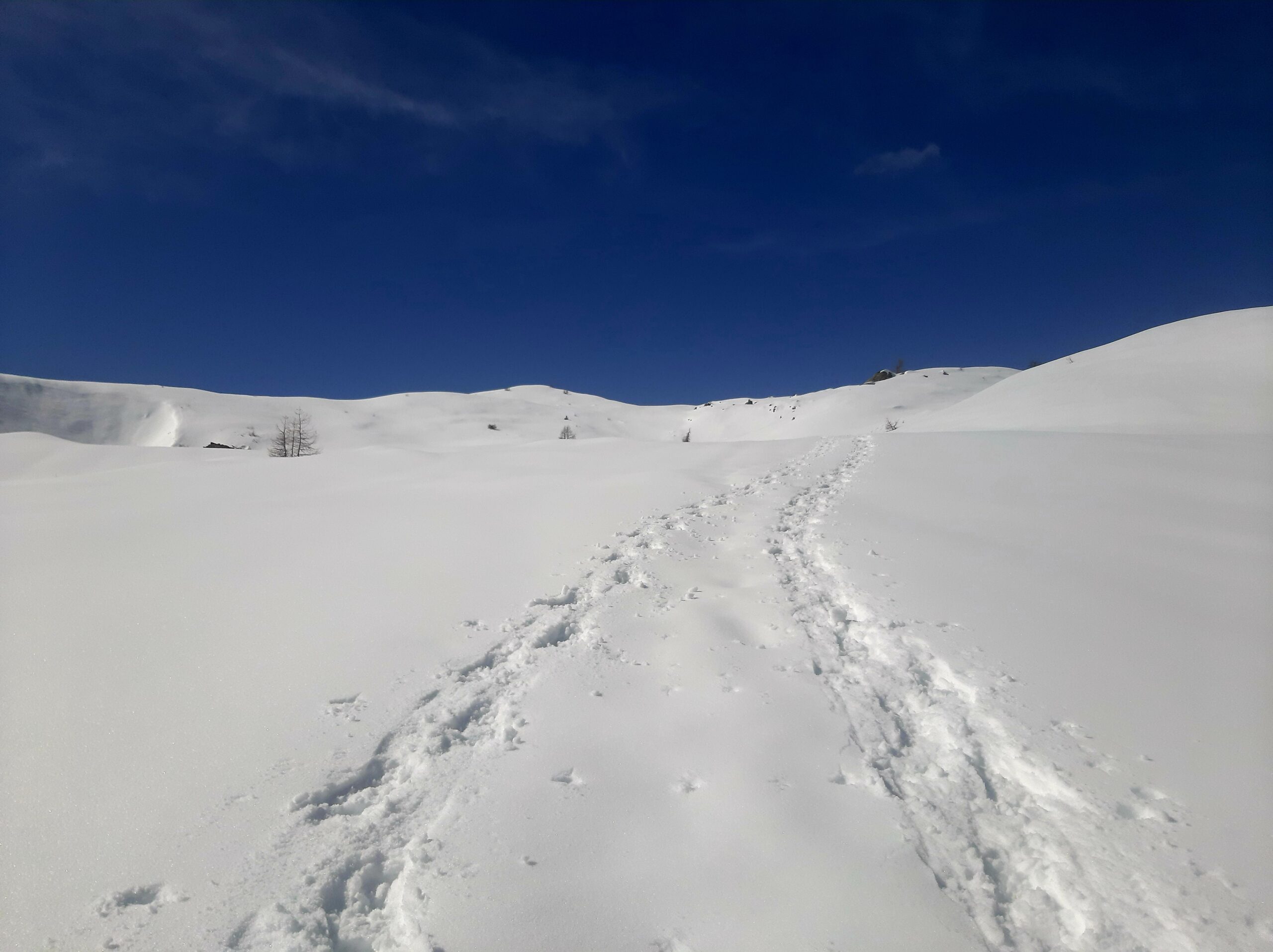 Dal parcheggio, si segue la strada per Dondena per alcune centinaia di metri, superati due tornanti, fino a raggiungere uno spiazzo con a destra una bacheca con cartina e indicazioni varie. Si segue quindi il sentiero che con alcuni scalini sale nella pineta, seguendo indicazioni per il lago Muffè e altre mete. Superato un primo tratto boschivo, si giunge in un ampio ripiano con una baita in posizione panoramica. Si prosegue a monte di essa, riprendendo il sentiero che prosegue nel bosco, fino a raggiungere una radura più aperta, nei pressi di un bivio per il Lago Muffè (sentiero estivo-sentiero invernale) a circa 1950 m. Qui si prosegue a sinistra, iniziando un traverso sul percorso di un sentiero estivo, che passa nei pressi di una costruzione in cemento dell’acquedotto. Si prosegue il traverso fino nei pressi dell’Alpe Vernoille, non lontana dall’omonimo lago. Si può anche passare dal bellissimo Lago Muffè, contornarlo a sinistra, e con semicerchio sempre verso sinistra giungere a Vernoille.