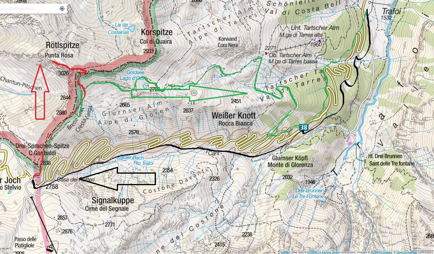 Discesa sempre con L’Ortles nel mirino. 3025-2925m ciclabile 80%, 2925-2850m 30%, Dai 2850mt totalmente ciclabile fino a trafoi per lo stupendo nr. 20 GOLDSEEWEG che vuoi il tempo perso per ed in cima, affrontiamo proprio dopo l’orario di divieto alle ore 16,00. Poi superato il lago Goldsee prendiamo il nr.10/16 con un po’ di balzi ma sempre ciclabili fino a circa 2100mt, poi bella e facile mulattiera fino ai tornanti a circa quota 1900mt. poi dal VIDEO si dovrebbe capire tutto il giro