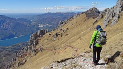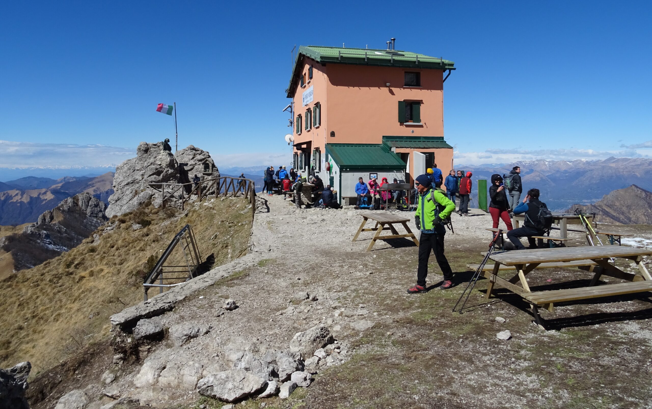 Partiti da Rongio sul bel sentiero che sale nei boschi al Baitello di Manavello (bellissimo punto panoramico). Scavalchiamo senza farci caso lo Zucco di Manavello e ci portiamo sul ripido sentierino che sale ripido il selvaggio versante ovest ricco di roccioni calcarei dello Zucco di Portorella, passando il brevissimo e facile tratto attrezzato con catena. Ultimo tratto molto panoramico che traversa sotto lo Zucco di Pertusio (non salito) al Rif.Rosalba, tutto asciutto con residui di neve solo a tratti nei punti esposti in ombra. Sosta birra all’aperto, riparati dal forte vento che tira da nord che ci ha accompagnato per quasi tutta la salita, dietro le solide mura del rifugio Rosalba, oggi invaso da una fiumana di gente. La discesa programmata dalla Val Scarettone salta, visto ancora l’innevamento ghiacciato residuo, non adatto alle pedule basse da trail che indossiamo oggi. Scatta allora come alternativa (già programmata) la discesa sul solatio versante sud, sgombro da neve con il sentiero 8A+12 Colonghei 964mt. fino a Rongio 398mt.dove chiudiamo l’anello D+ 1450mt. 14km.