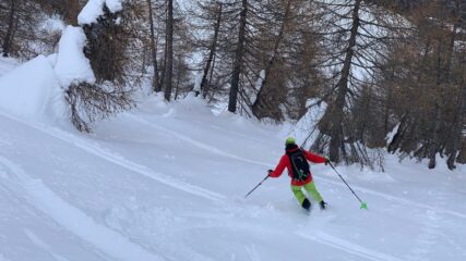 Neve bella e divertente nella parte alta per circa 500m tenendosi molto verso est, neve ancora sciabile ma totalmente tritata nella parte bassa.