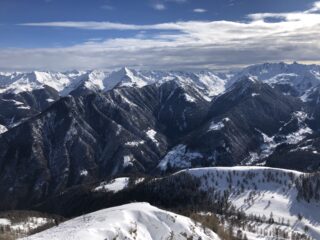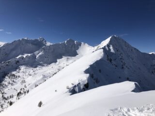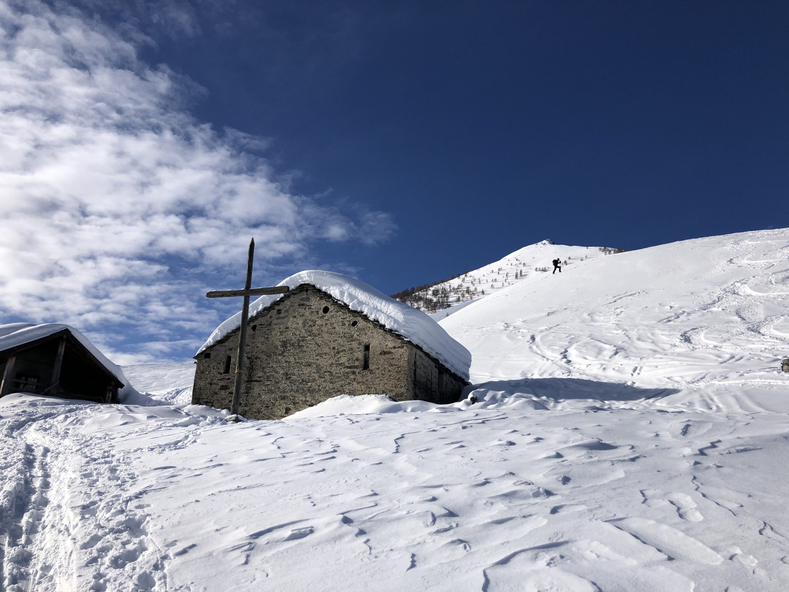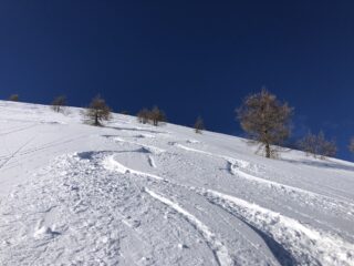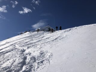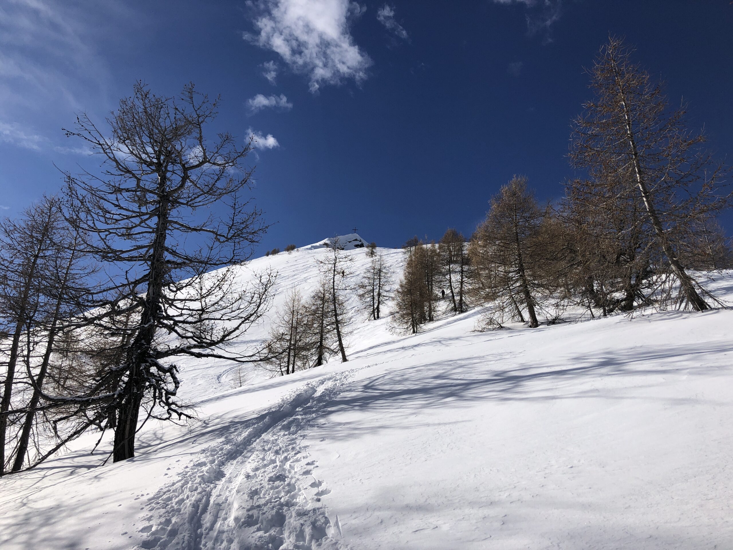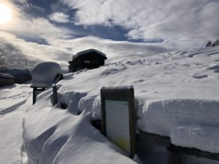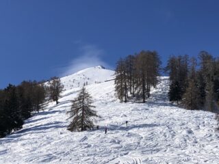 Strada fino al Bar Bianco lunga e noiosa e per quasi metà rovinata, soprattutto per la discesa, da solchi profondi di ruote. Io avevo uno zoccolo imperiale che mi ha fatto faticare fino in cima, altri in realtà nulla! Qualche centimetro di neve nuova ma già molto umida. Sci fino in vetta. Sceso poi sulla perpendicolare della cima con una grandissima sciata in mezzo metro di neve fresca con pochissime tracce. Ricongiunto alla via principale 100 mt sopra il rifugio dove l’aratura e’ notevole. Poi strada. Parecchia gente in giro. Stamattina strada ghiacciata, qualcuno ha tribolato.