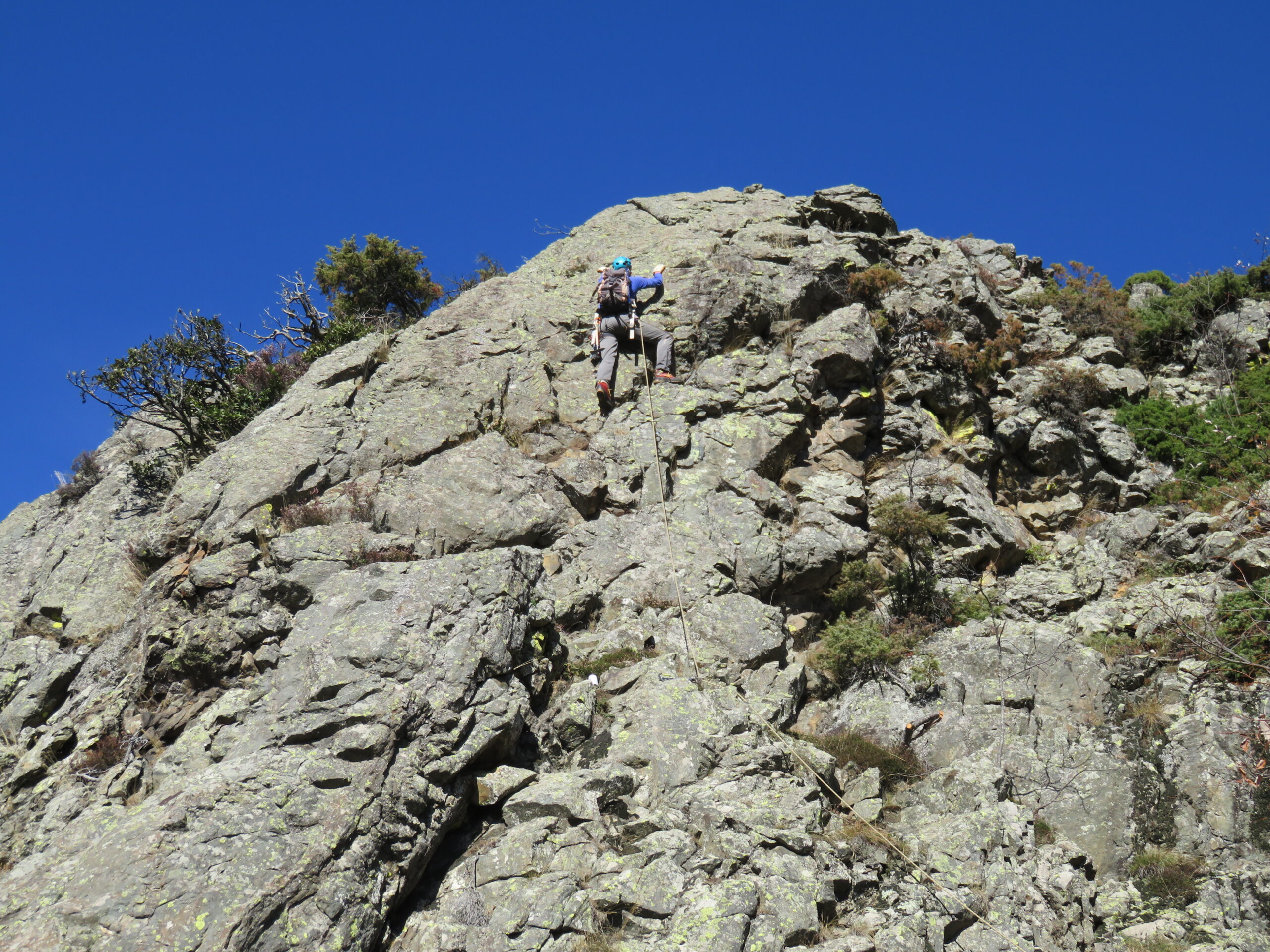 - L7: salire un breve muretto ripido (passo di 4b), quindi proseguire prima a dx e poi su uno speroncino poco definito, fin contro un muretto verticale (passo di 4b), delimitato a dx da un camino. Sosta su cordone su masso. 25m