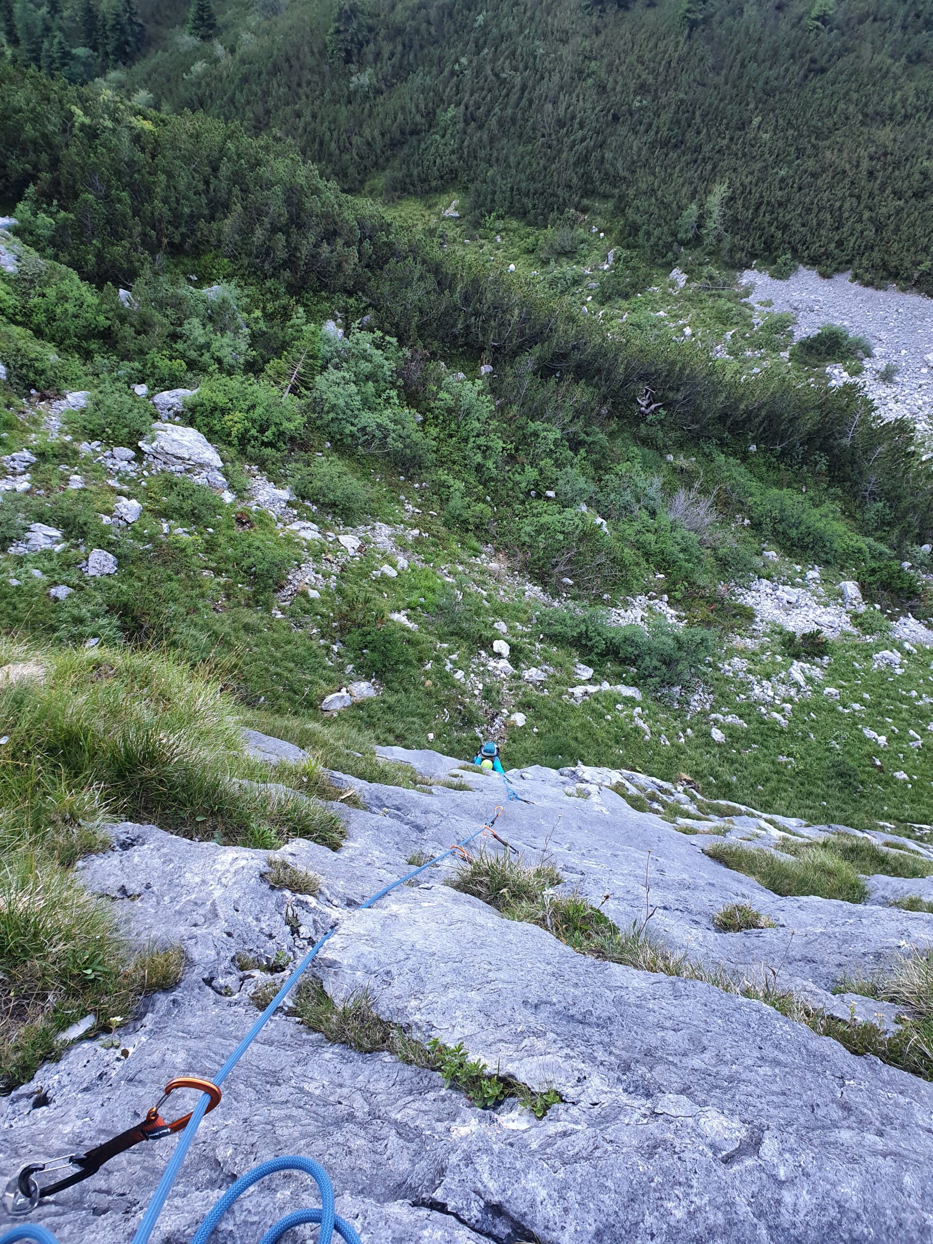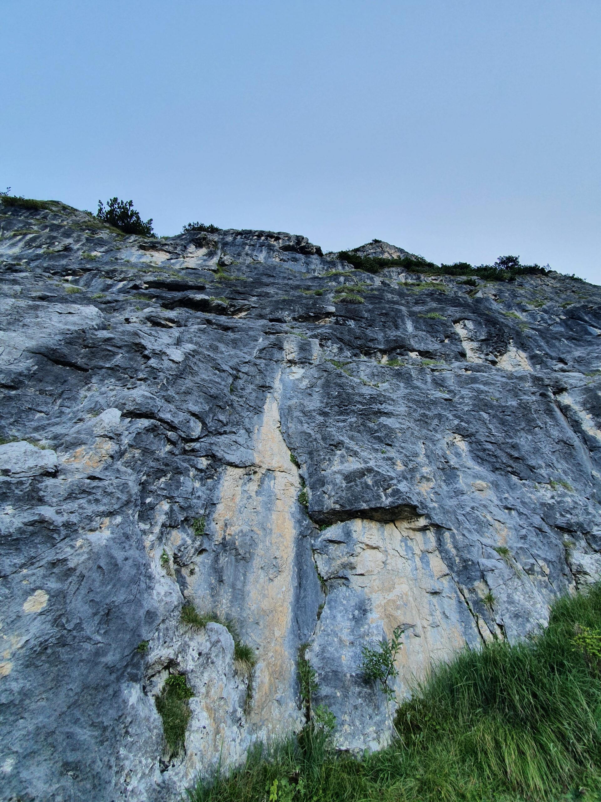 - L2: diritti lungo una paretina verticale poi obliquare leggermente a sinistra puntando dei mughi. 5c+ poi 5a, 30m (sosta dietro ad un grande mugo)
