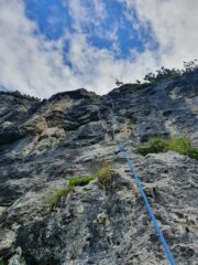 - L6: diritti sopra alla sosta, subito si presenta un passaggio leggermente ostico e poi il terreno diventa più facile. 5b poi 4a 30m