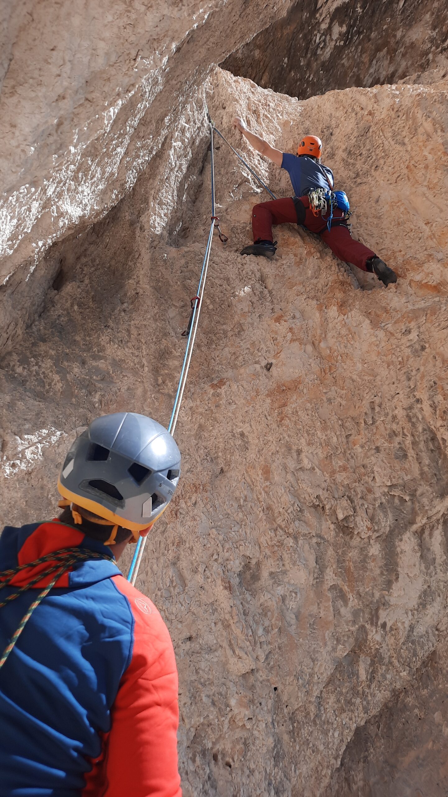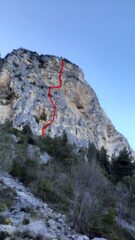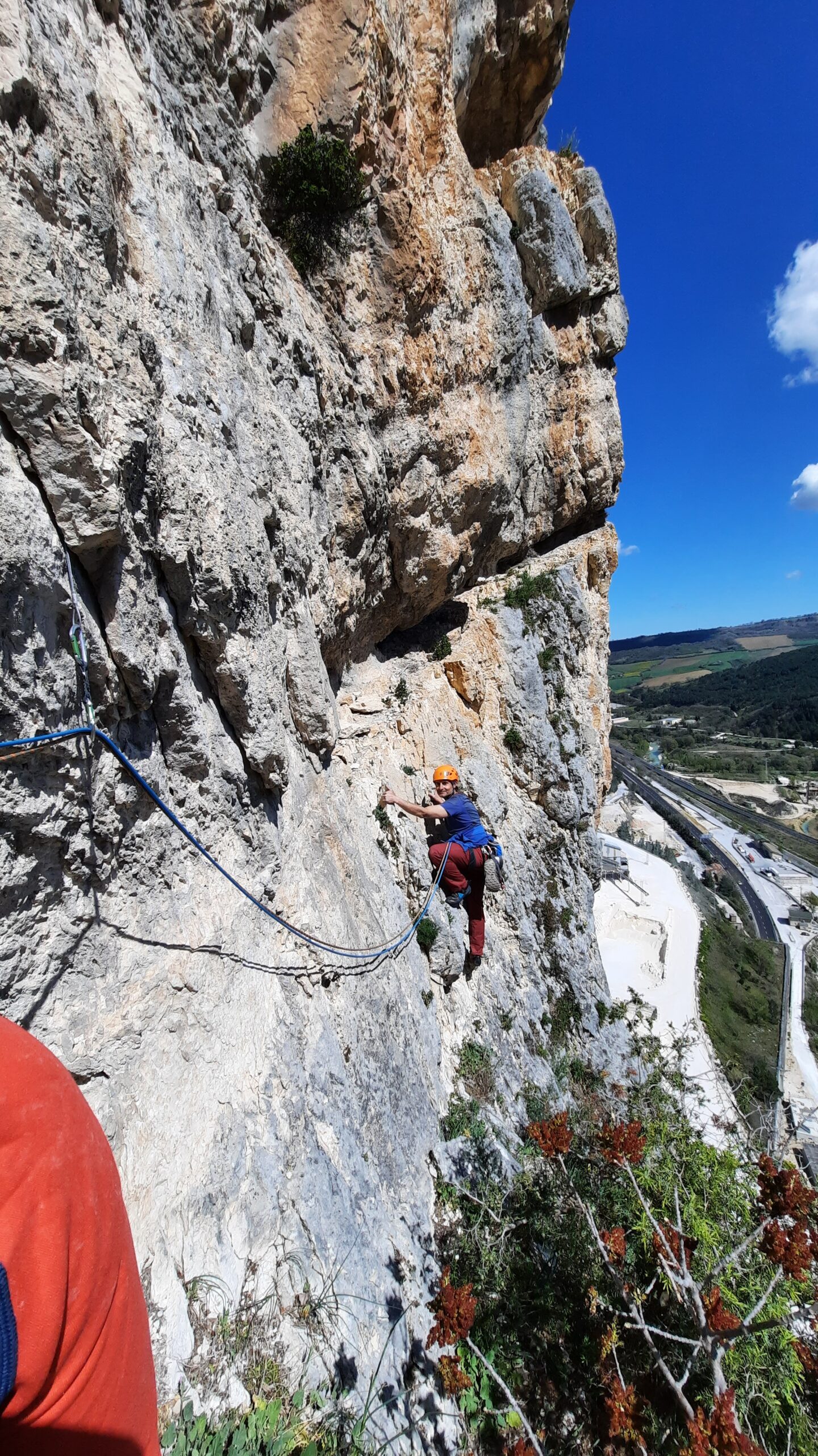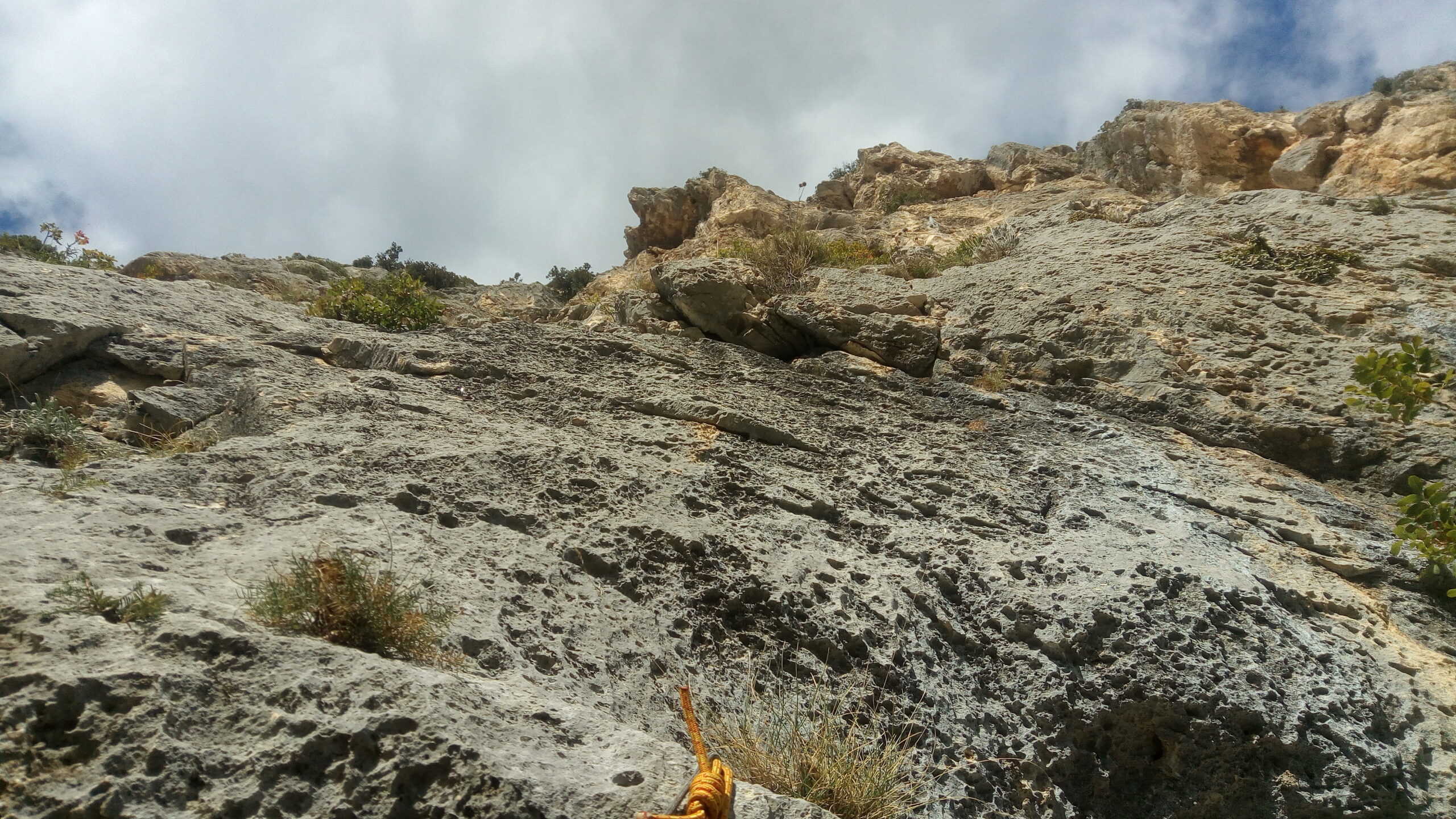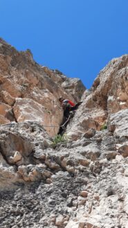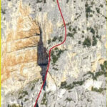 L1 salire prima verso dritti e poi verso destra per roccia gialla molto delicata e friabile, chiodi e fix ravvicinati sui passi difficili. Uscire su una grande terrazza a destra; sosta su 2 fix con maglie rapide, da collegare (30 m 6a)