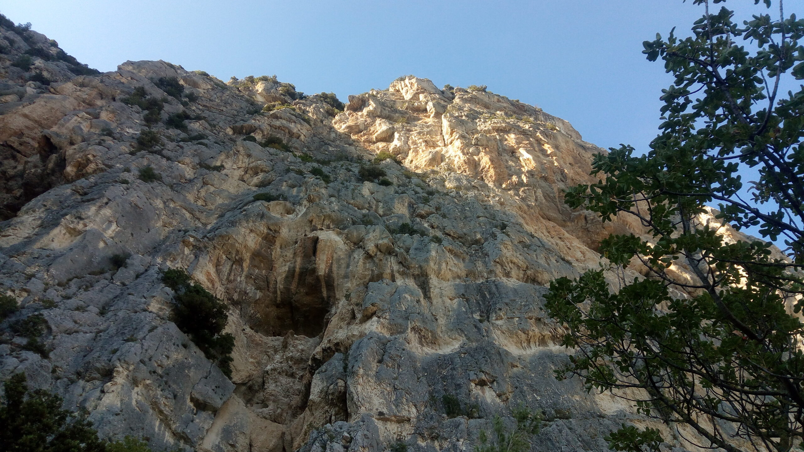Da qui calarsi (una calata lunga o 2 corte) fino a una zona di terrazze esposte, da qui con molta attenzione scendere alla meglio con passi di arrampicata (II) prima dritti e poi verso destra (faccia a valle), ritrovando alcuni bolli rossi sbiaditi, seguendo tracce fino a raggiungere la strada asfaltata. Contare almeno 1h30.