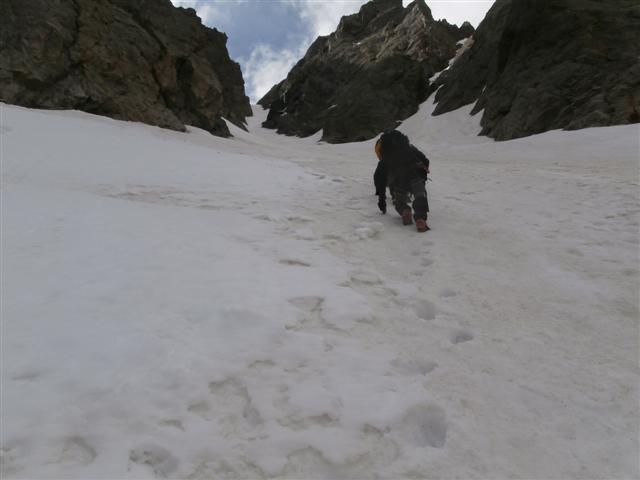 Gran bella gita, bell’ambiente e tempo discreto. Si sale su sentiero estivo fin poco sotto il lago Mongioie, poi neve più o meno continua fino all’attacco del canale (attenzione ai buchi, neve non proprio portante). Qui si mettono i ramponi ed inizia l’ascesa su neve discreta, comunque sicura, fino al colletto: qui finisce anche la neve, ultima parte di facile arrampicata su roccia asciutta fino alla croce di vetta. Breve sosta poi discesa dalla parte opposta verso la bassa di Schiantala e punta Zanotti, passaggio dal rifugio e ripresa della sterrata fatta al mattino.