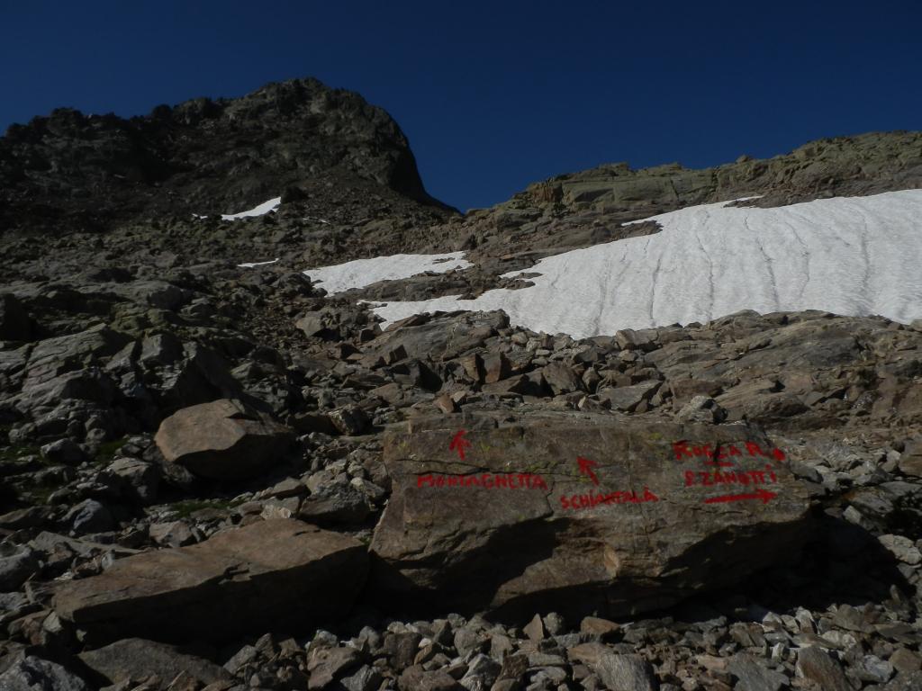 dal pian della regina salire fino al rif. Zanotti 2144 m (338/1898768) e proseguire verso la Bassa di Schiantalà. svoltare a destra in una pietraia e risalire per cenge le Rocce Mongioie. giunti in una conca svoltare verso sud lasciando sulla destra il sentiero verso la punta Zanotti. risalire un ripido pendio di detriti o neve fino ad arrivare sul bordo nord est dell’altopiano della rocca rossa. lasciando sulla destra un lago più grande, procedere verso il passo rocca rossa (tra la rocca rossa e cima della montagnetta). sotto il passo svoltare per un rampa erbosa che porta ad una cengia da cui per facili roccette si giunge in vetta (bollini rossi)