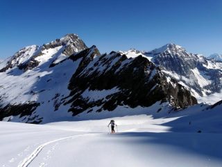 Discesa con farinosa su fondo duro fino al colle Arnas, poi il fondo diventa molliccio ma sciabilissimo; siamo scesi nel canale d’Arnas dove, sfruttando tutte le lingue di neve tra le rocce si tolgono gli sci per 5 metri.