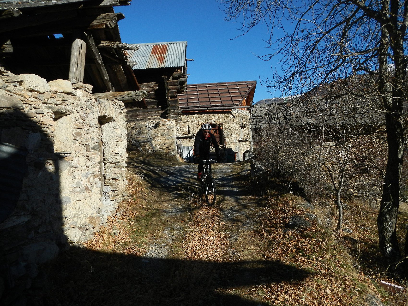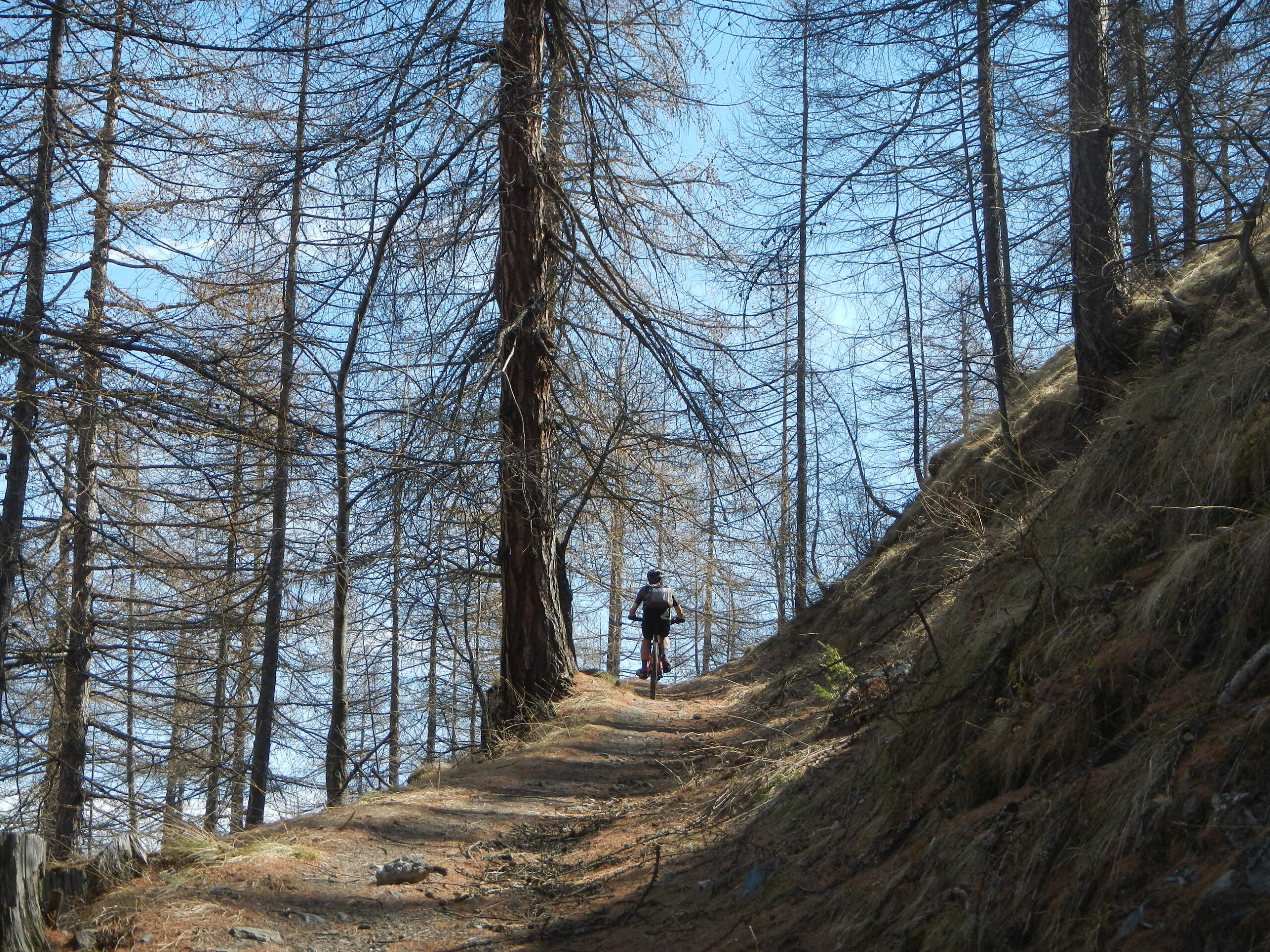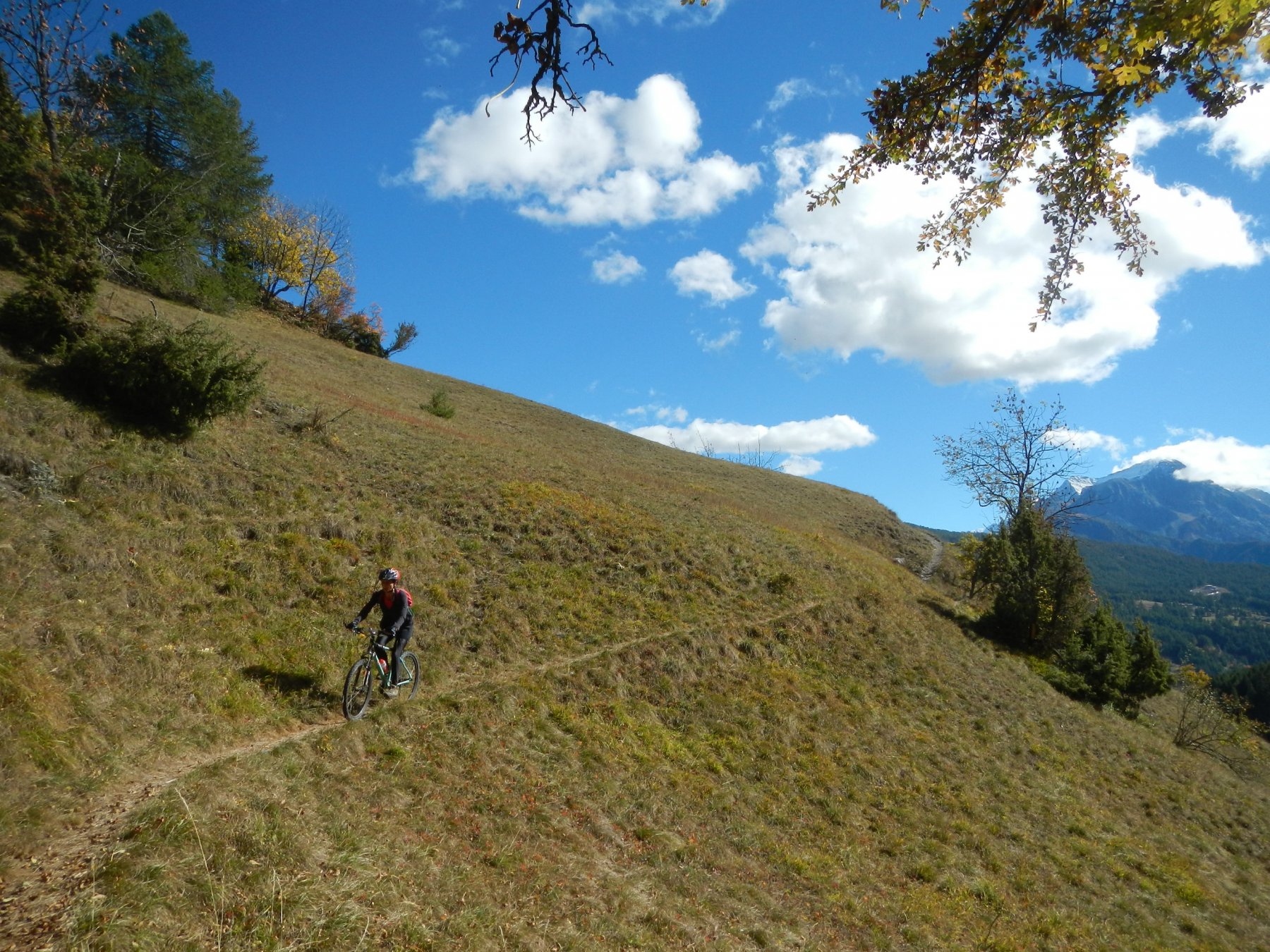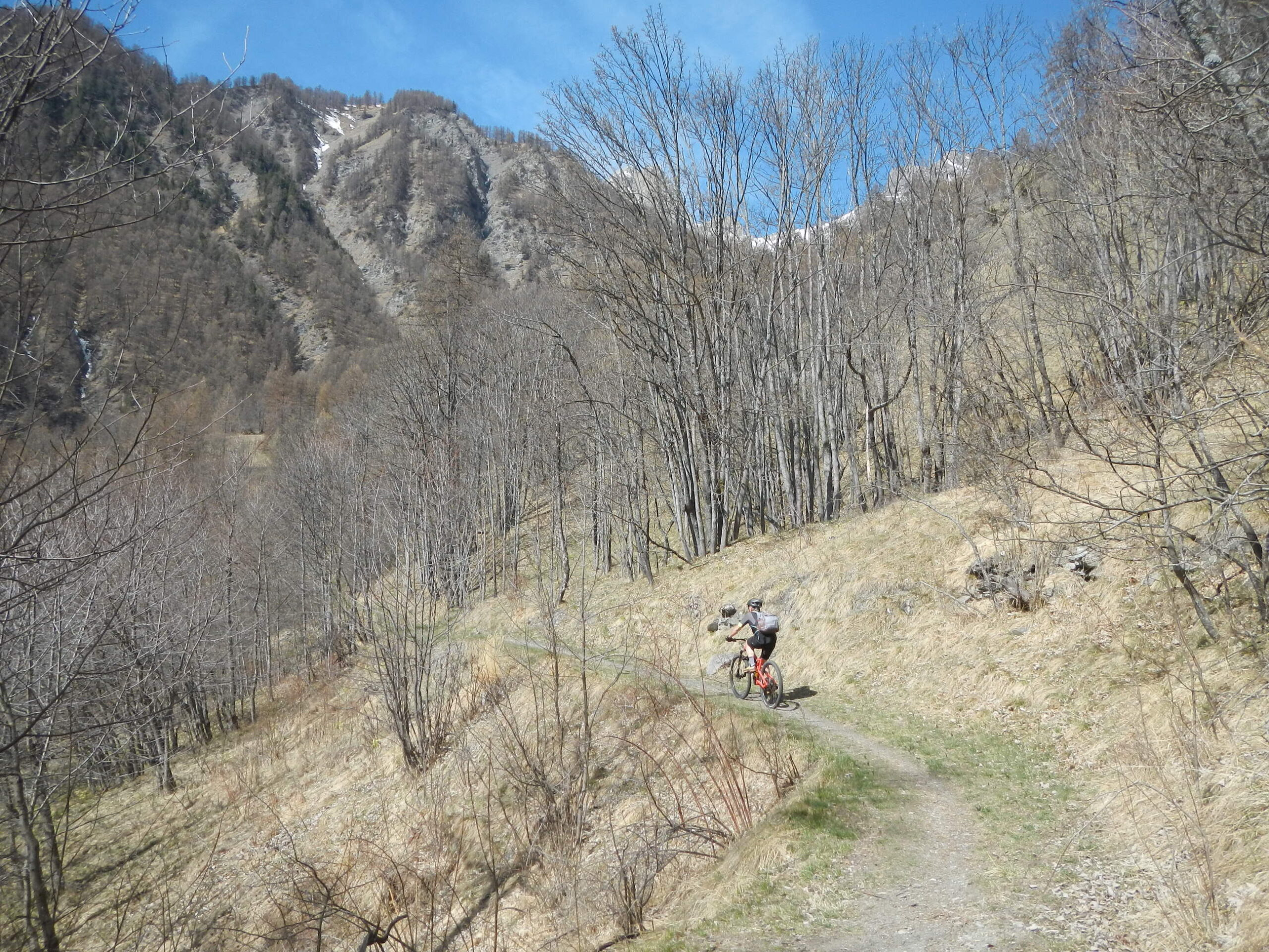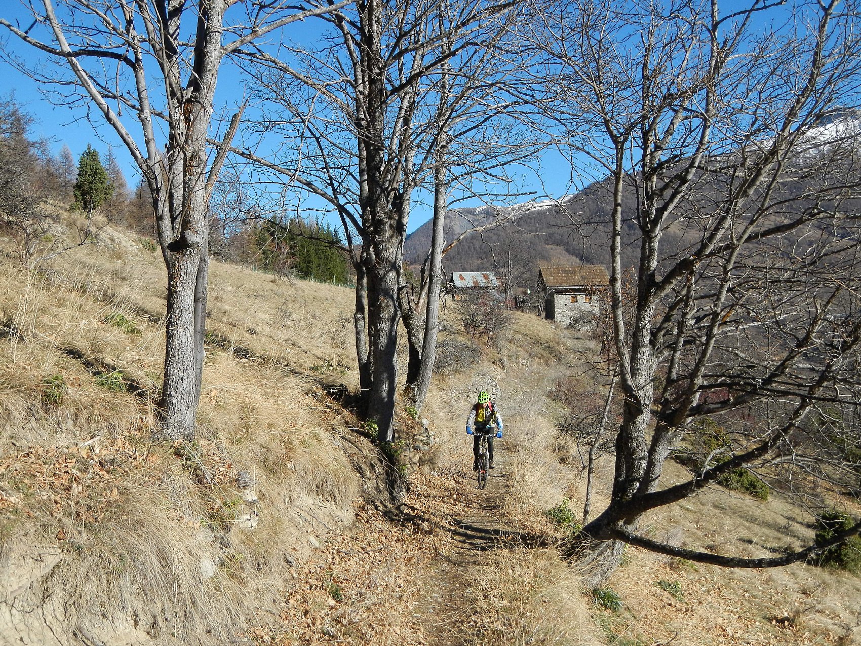 Attraversata la borgata un sentiero a mezza costa, ciclabile tranne in un tratto esposto in cui è meglio accompagnare la mtb, si perviene a Pra Claud.