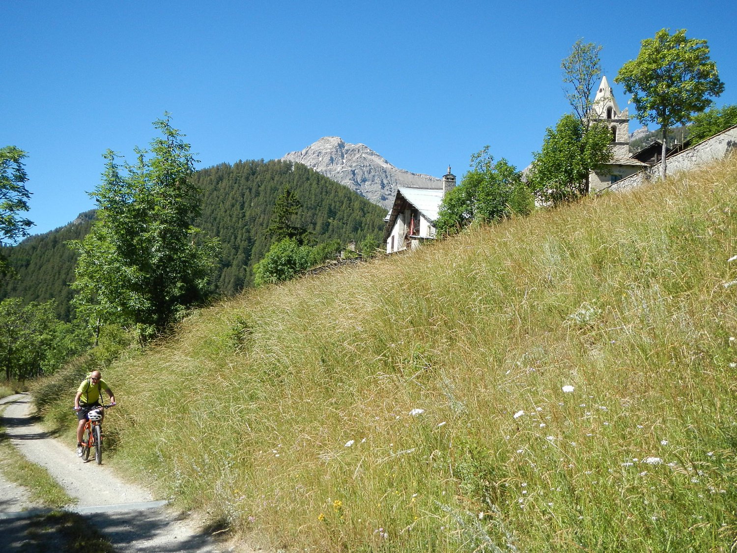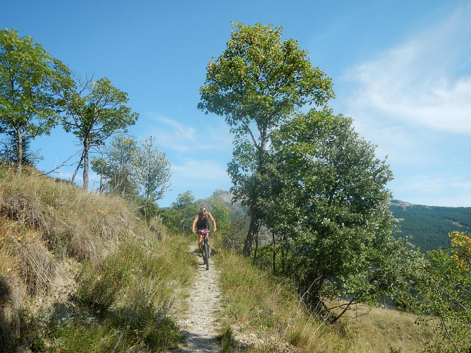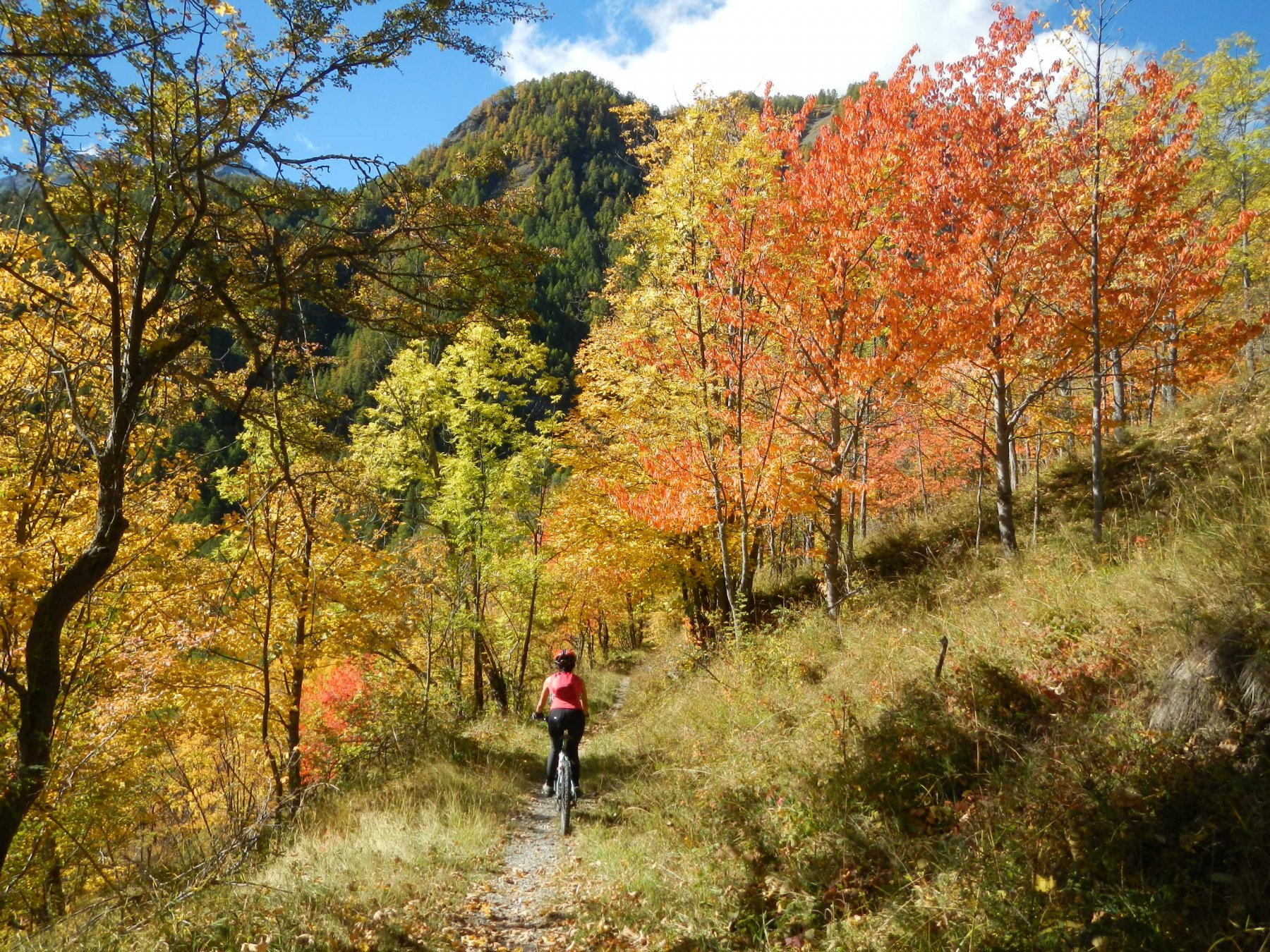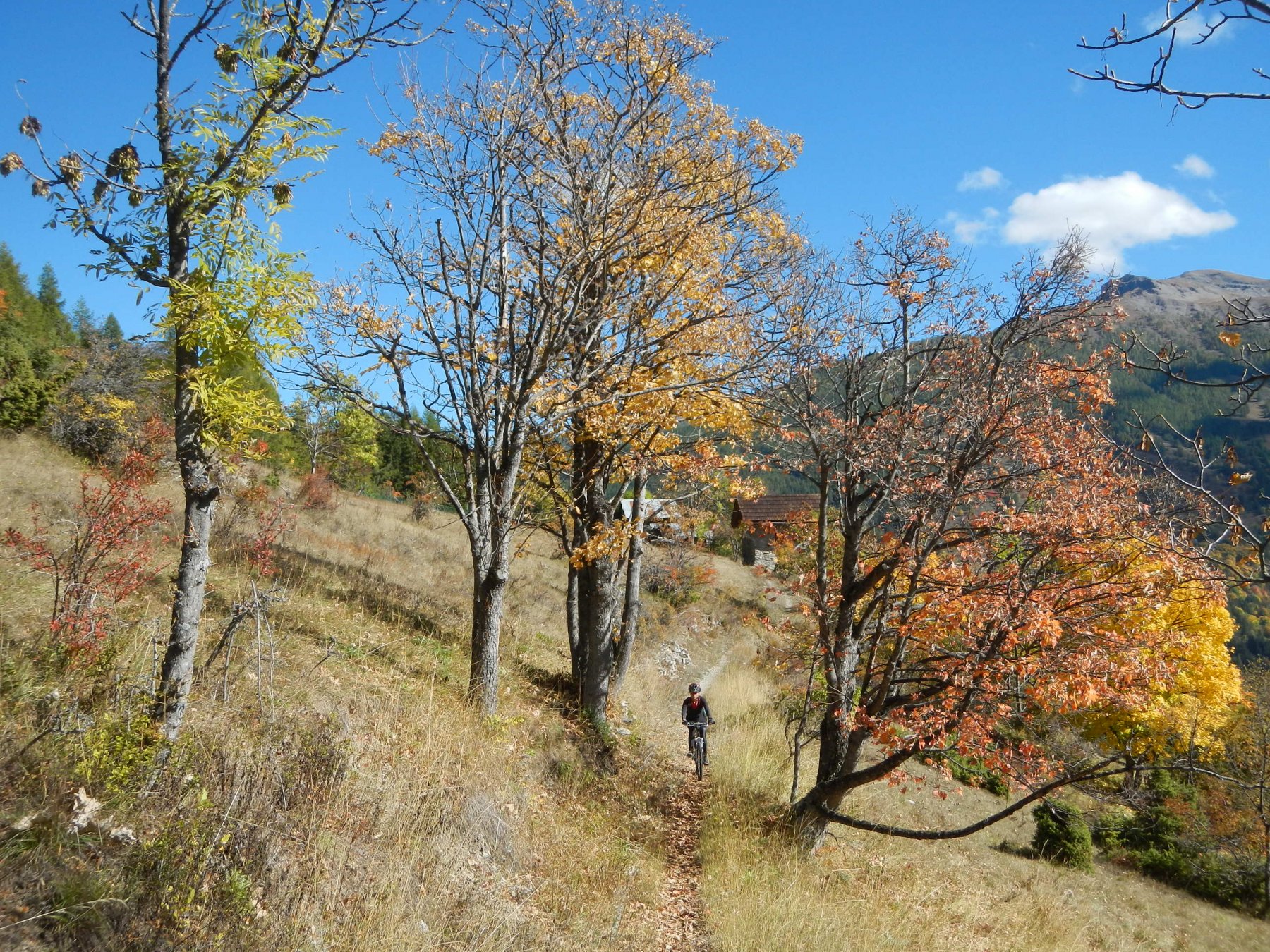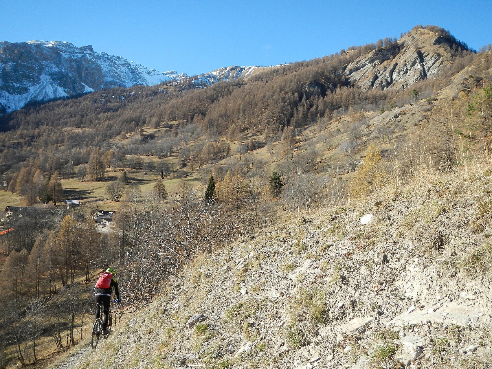 Attraversata la borgata un sentiero a mezza costa, ciclabile tranne in un tratto esposto in cui è meglio accompagnare la mtb, si perviene a Pra Claud.