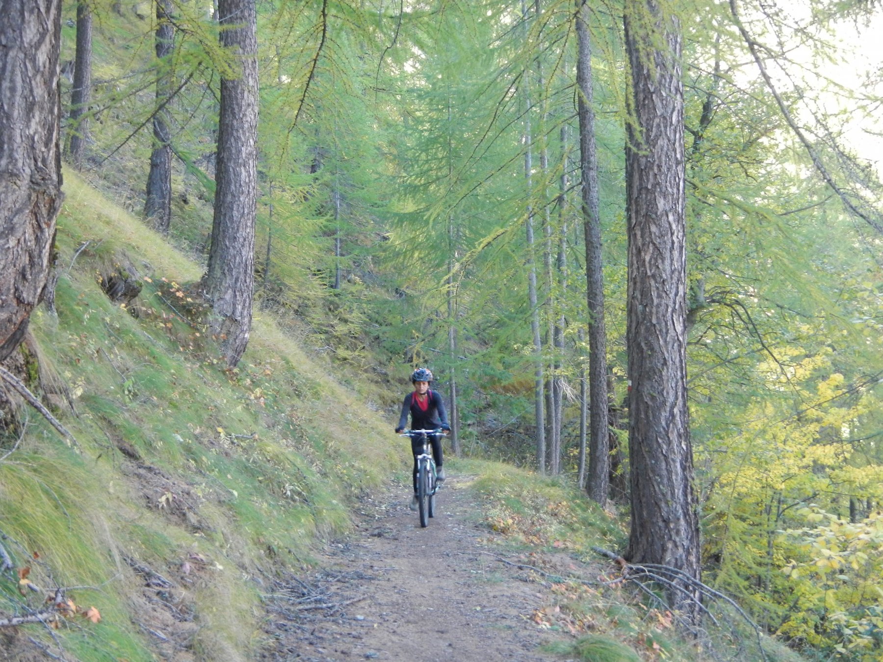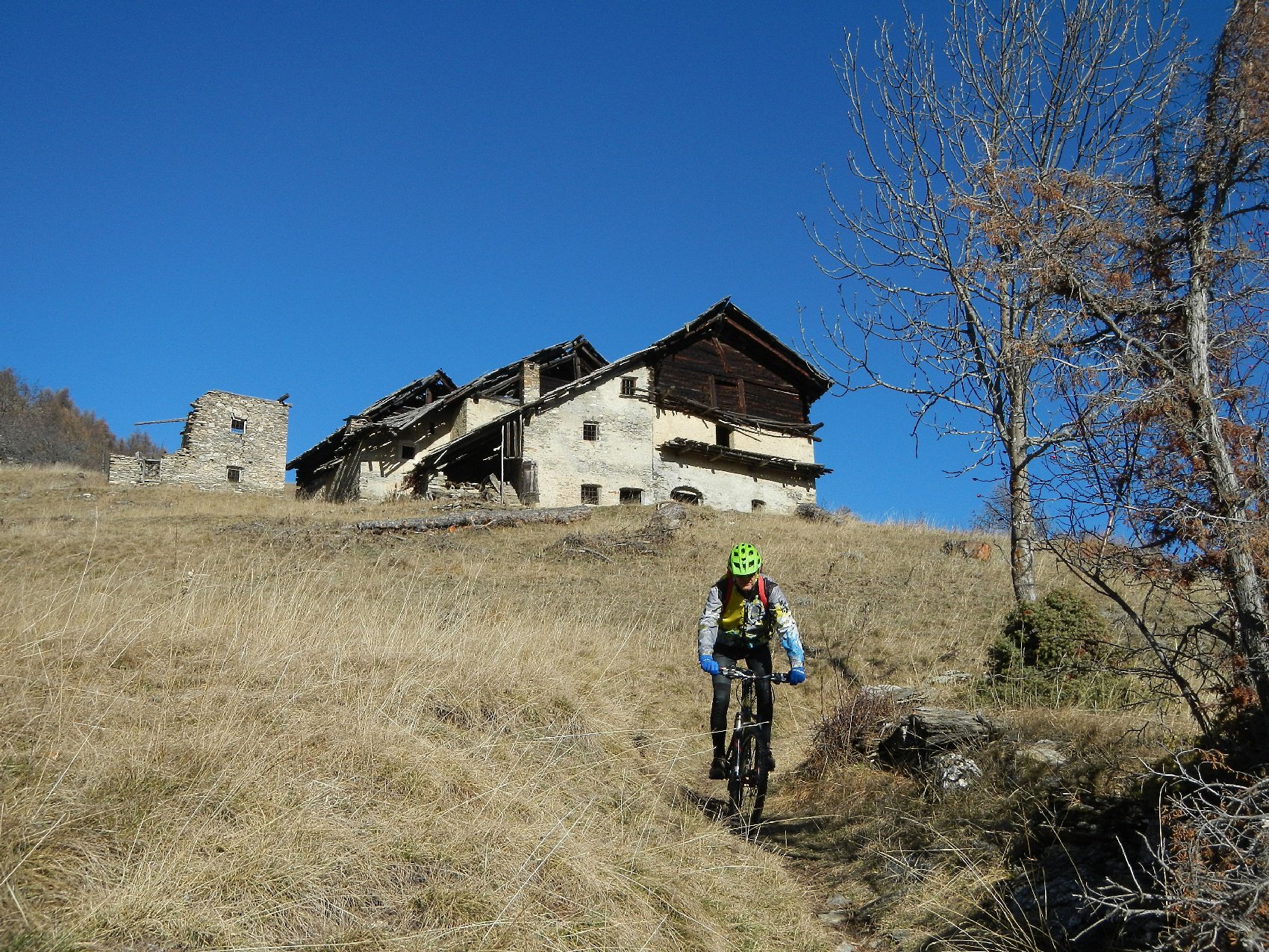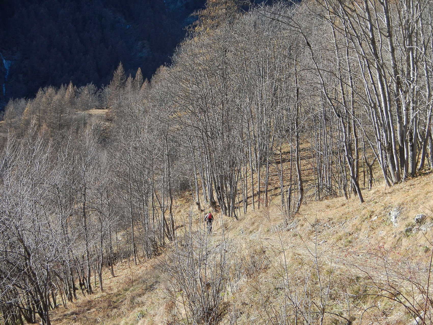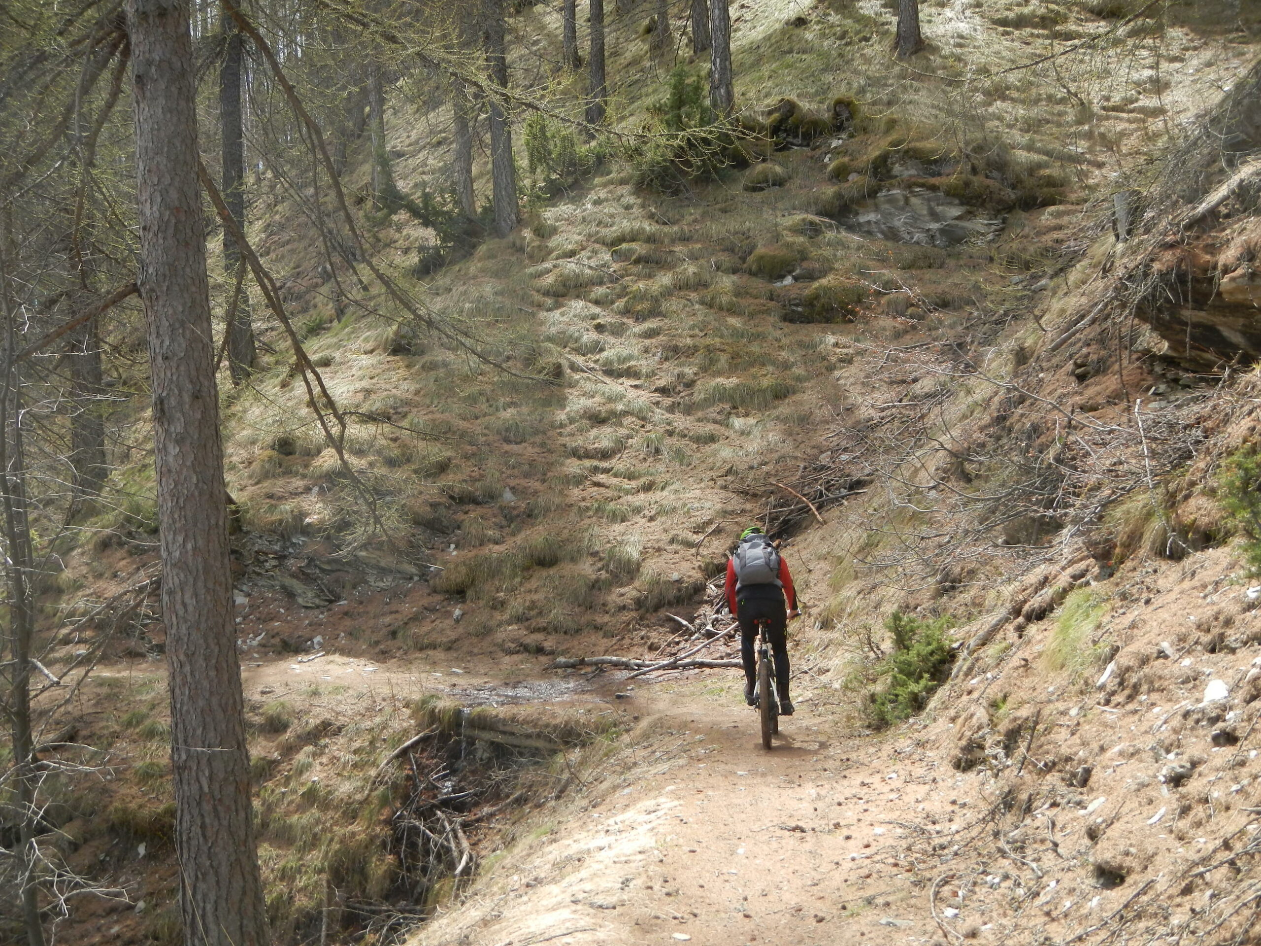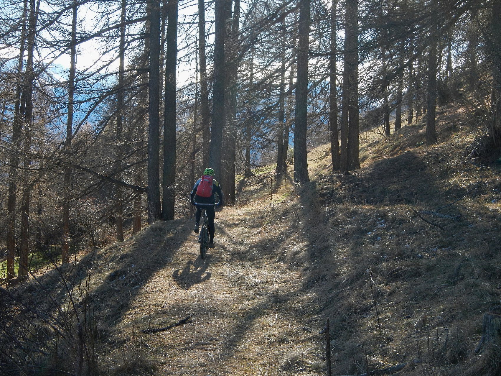 Attraversata la borgata un sentiero a mezza costa, ciclabile tranne in un tratto esposto in cui è meglio accompagnare la mtb, si perviene a Pra Claud.