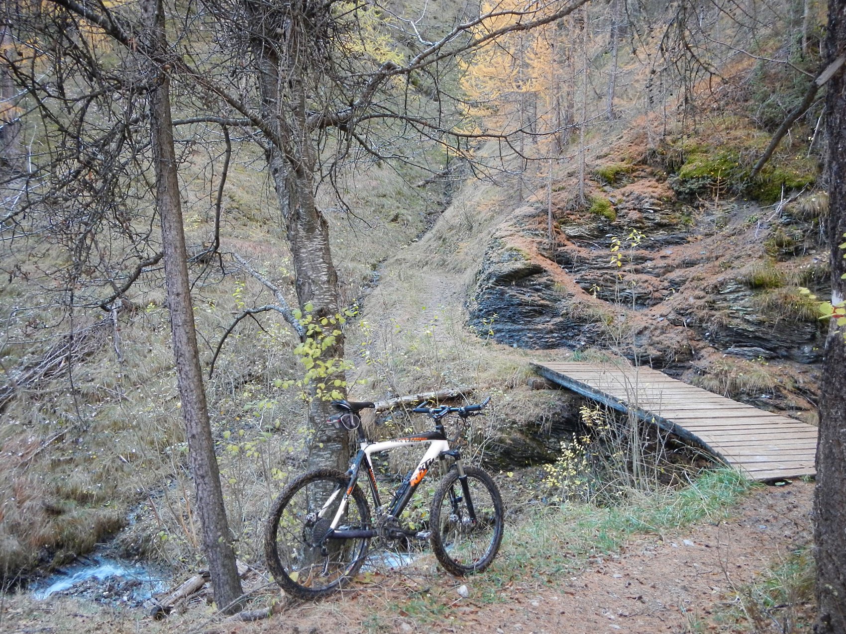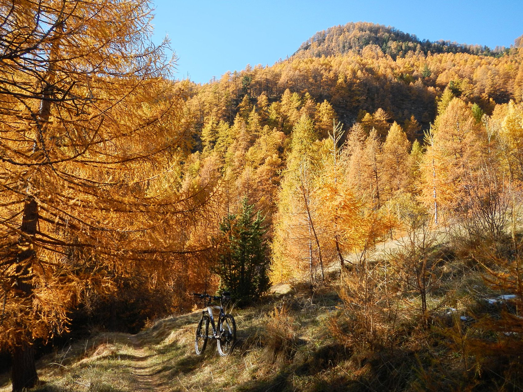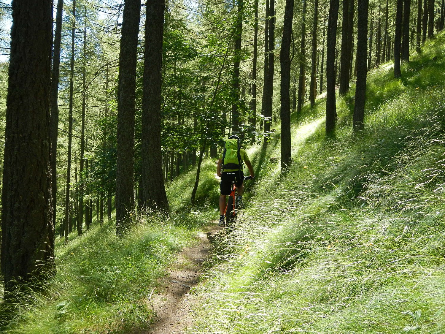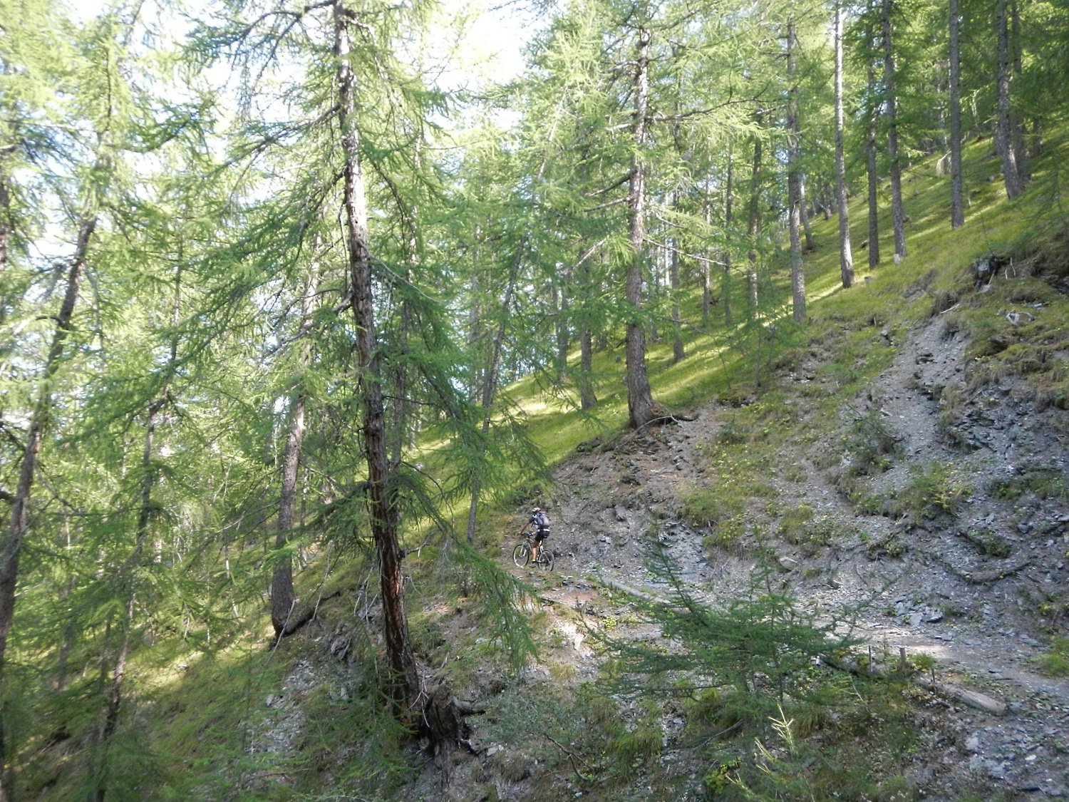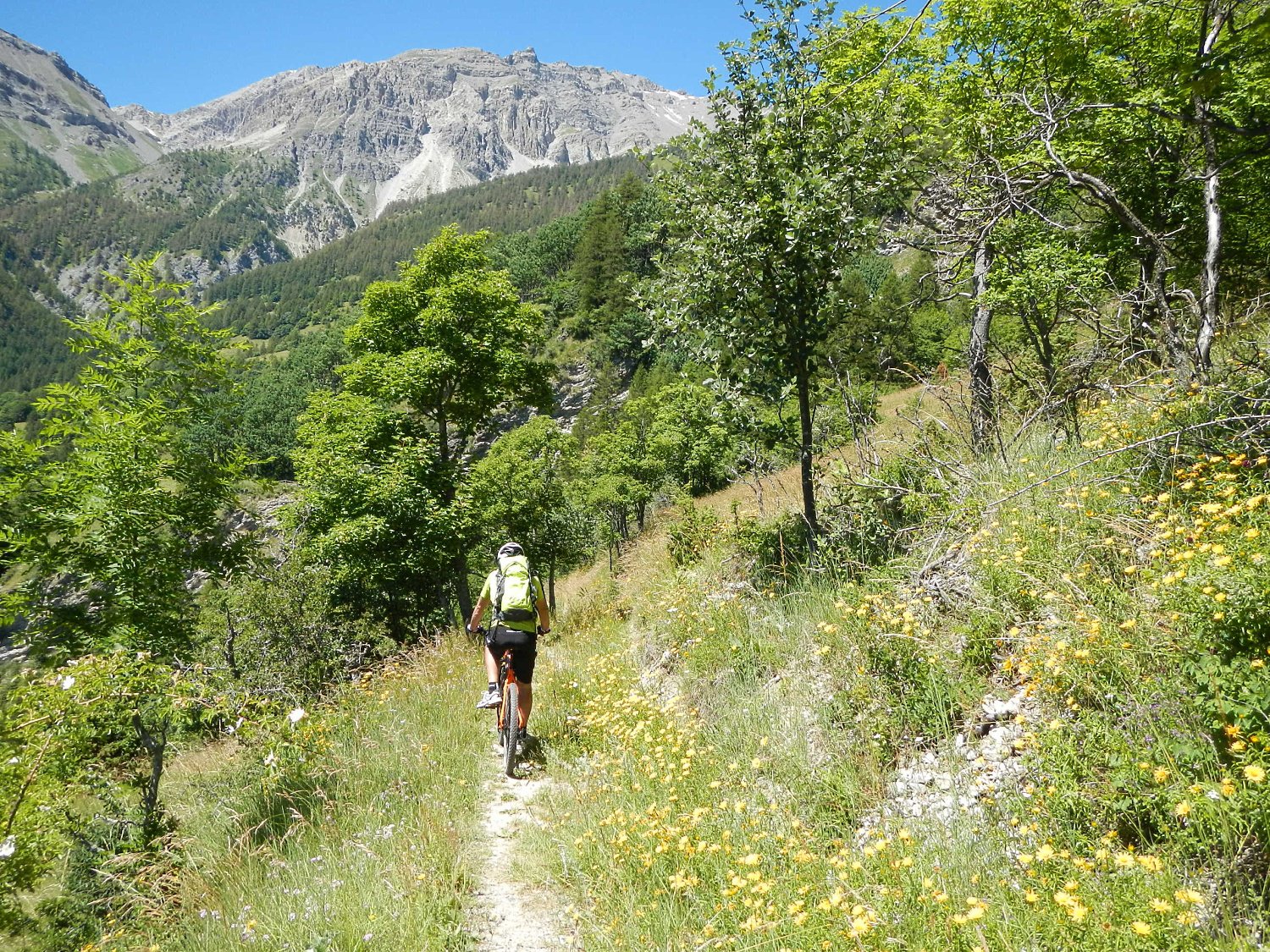 Attraversata la borgata un sentiero a mezza costa, ciclabile tranne in un tratto esposto in cui è meglio accompagnare la mtb, si perviene a Pra Claud.