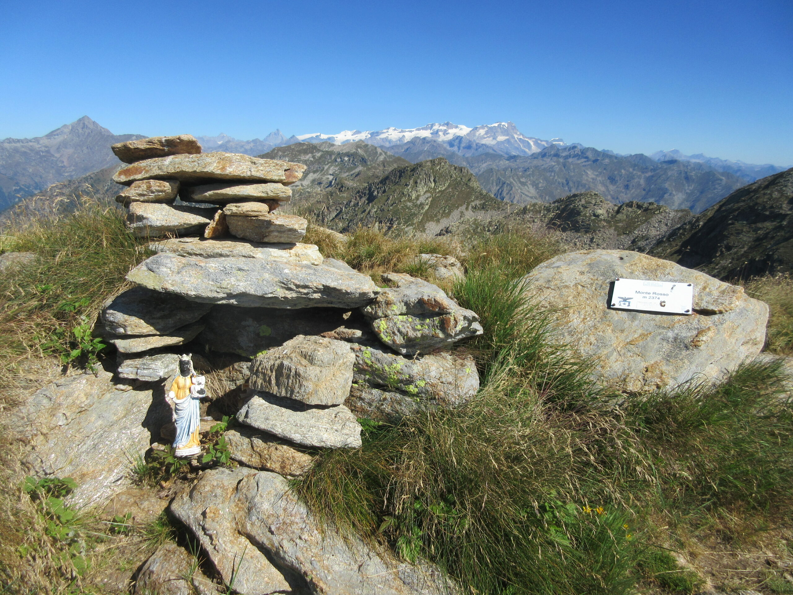 Dopo aver pernottato al rifugio Barma, salgo al Colle della Barma d’Oropa (30min.) Seguendo i bolli blu inizio il percorso in cresta con passaggi esposti o attrezzati con corde fisse da affrontare con la dovuta cautela. Aggiro sulla sinistra il dado fino al canalino di rocce rosse che salgo sulla sinistra uscendo di nuovo in cresta. In breve raggiungo la vetta del Monte Rosso (un’ora dal Colle della Barma). Discesa sul crestone fino al Colle del Rosso (splendido laghetto). Dal colle seguo il D23 (Mont Mars) e poco prima di giungere al Col Chardon piego a sinistra nel canale seguendo una labile traccia con qualche ometto e segnavia sbiadito bianco e rosso. Incrocio il sentiero GTA proveniente dalla Bocchetta del Lago. Traversata lunga con vari saliscendi e tratti attrezzati fino al Rifugio Coda . Breve sosta e ritorno sul sentiero fino al Colle Sella. Discesa sull’Alta Via fino a Serrafredda 1840m poi a sinistra sul 3/3a fino a Coumarial.