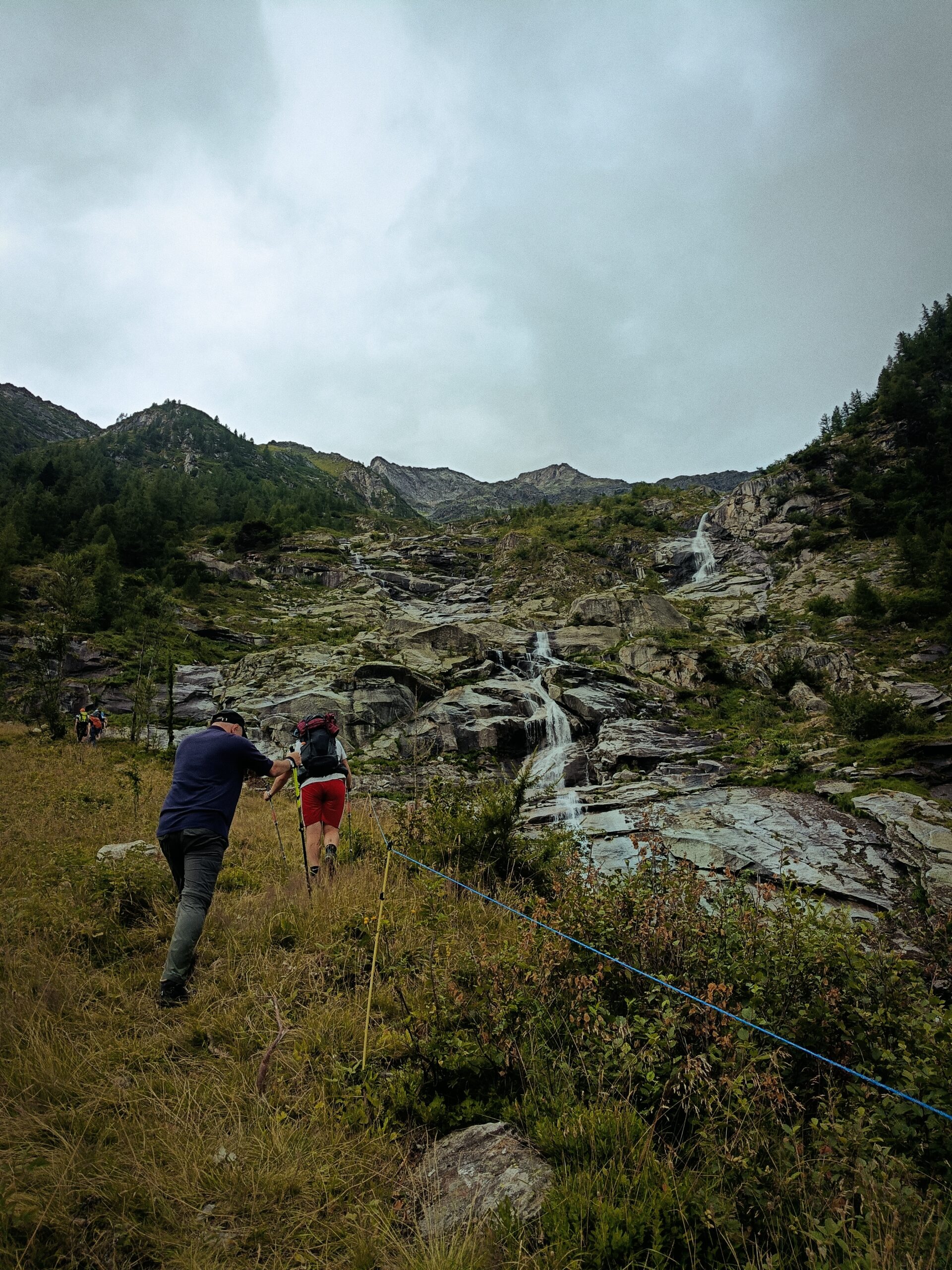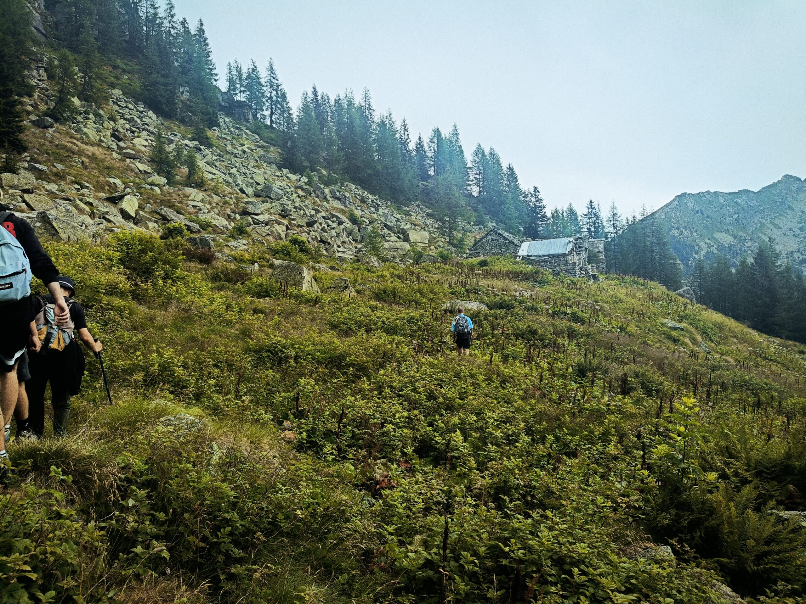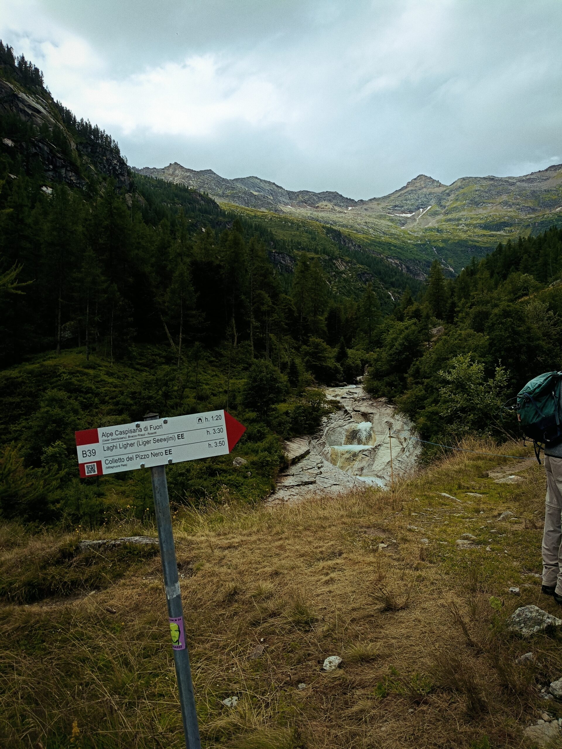 Superato il rivo, si incontra un cartellino con le indicazioni per l’alpe Caspisana di fuori e il bivacco (vedi foto). Abbandonare quindi il sentiero principale e proseguire per prati, nella direzione indicata dal cartellino, seguendo alcuni ometti e sostanzialmente il corso del rivo. Una volta raggiunta la sommità della rampa erbosa, il sentiero piega verso sinistra (faccia a monte) e raggiunge un vecchio alpeggio. Proseguendo poi per ripidi tornanti prima nel bosco e poi per prati, si giunge in vista dell’alpe e quindi del bivacco. Superati un paio di torrenti, facendo attenzione a seguire gli ometti e quindi senza risalire ulteriormente, si giunge in breve al bivacco (80/90 Min dal bivio).