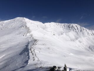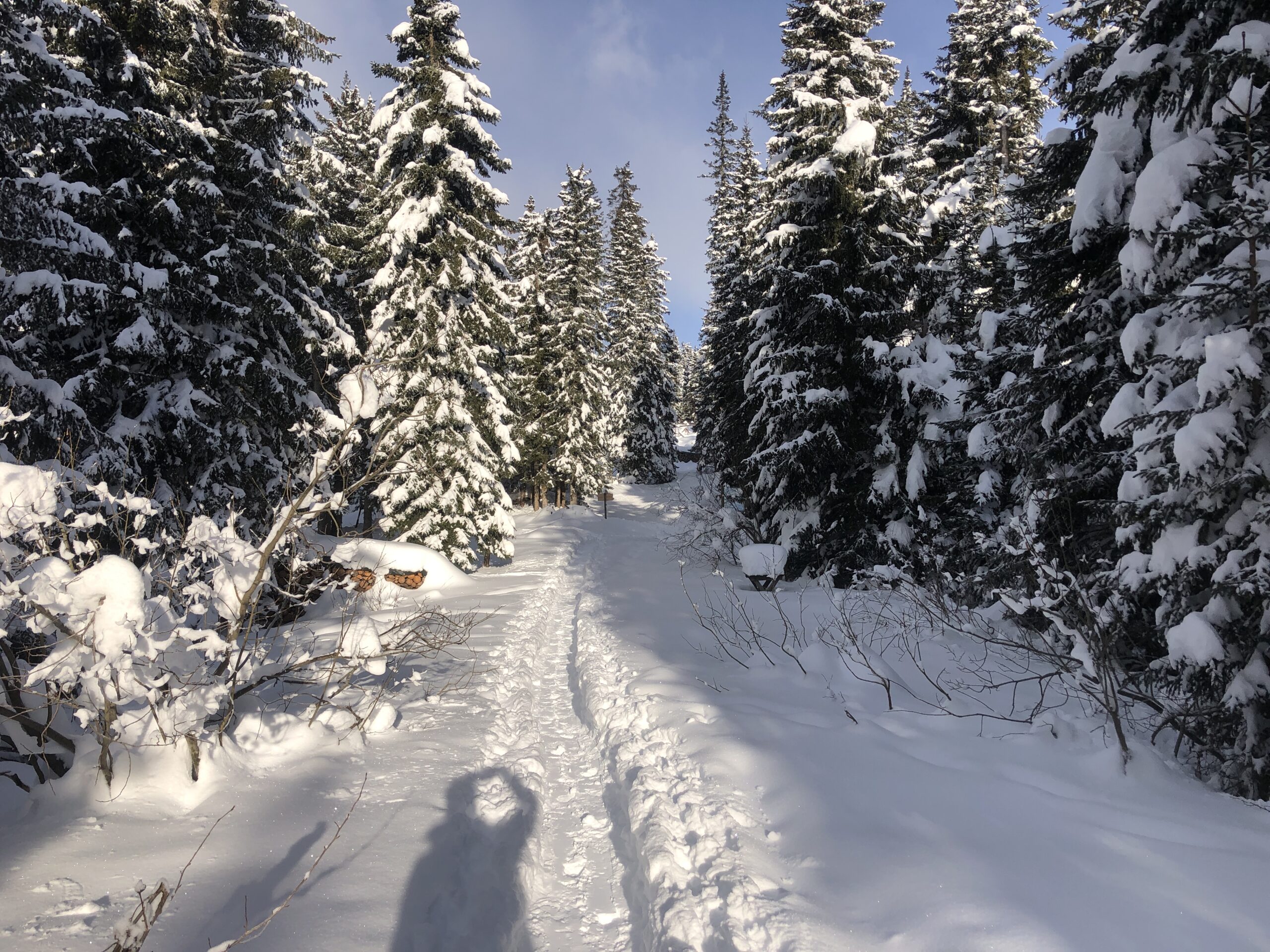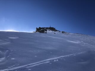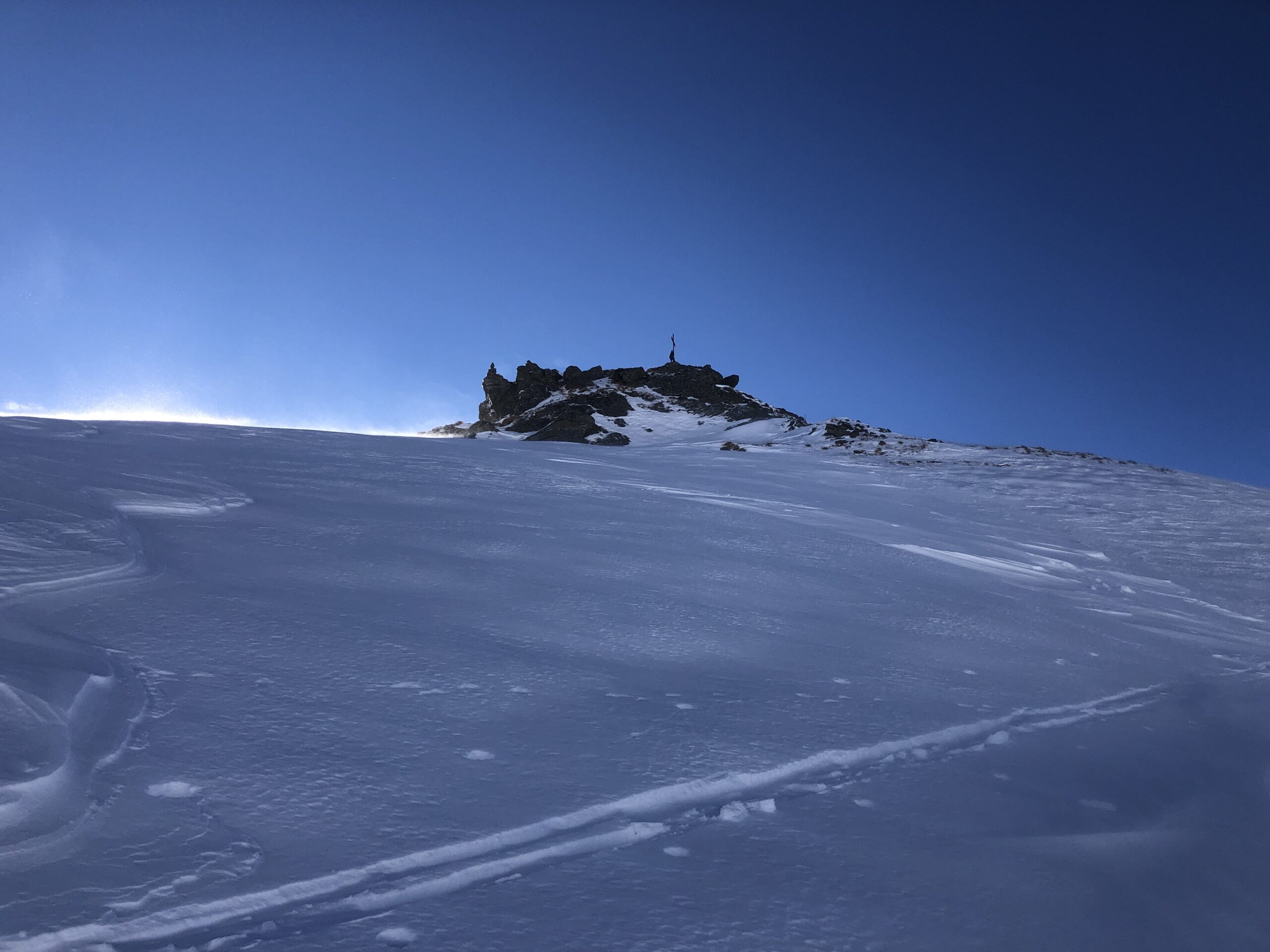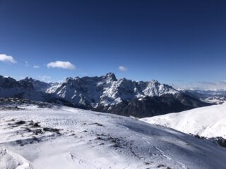 Ancora vento freddo e cumuli. Cime spazzate e pendii pericolosi allora altra gita sicura. L’intenzione era la Demut spitze ma la salita al colle ripida e sottovento non diceva niente di buono e le folate patagoniche non incoraggiavano per la parte abbastanza lunga da fare in cresta. Quindi mi sono fermato alla croce di questa elevazione di 2400 non quotata. Sciata da qui più che accettabile. Freddo ma bellissimo panorama. Malga Nemes aperta per un ottimo pranzo. Discesa sci ai piedi all’auto sulla stradina.