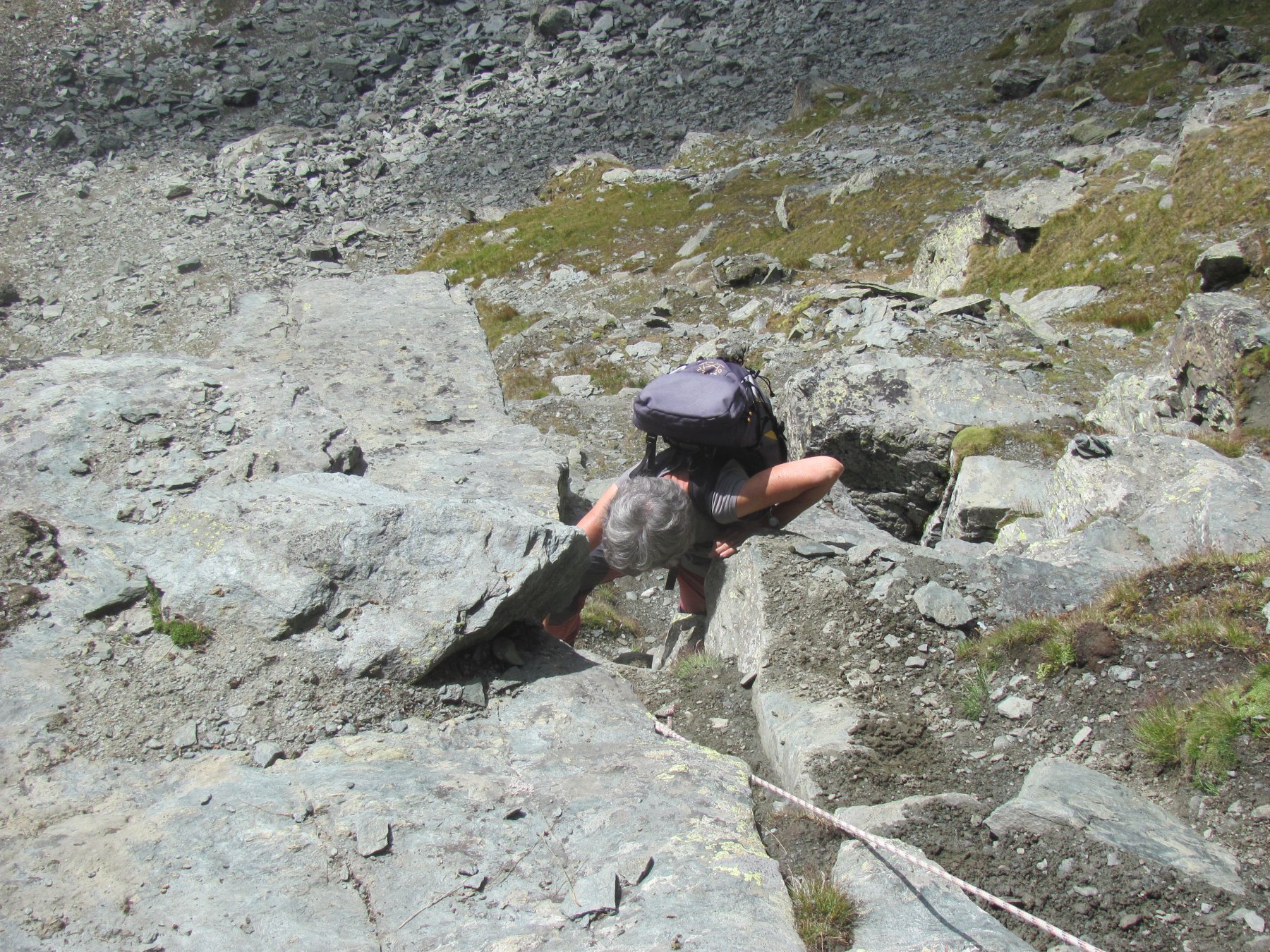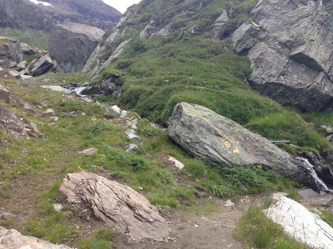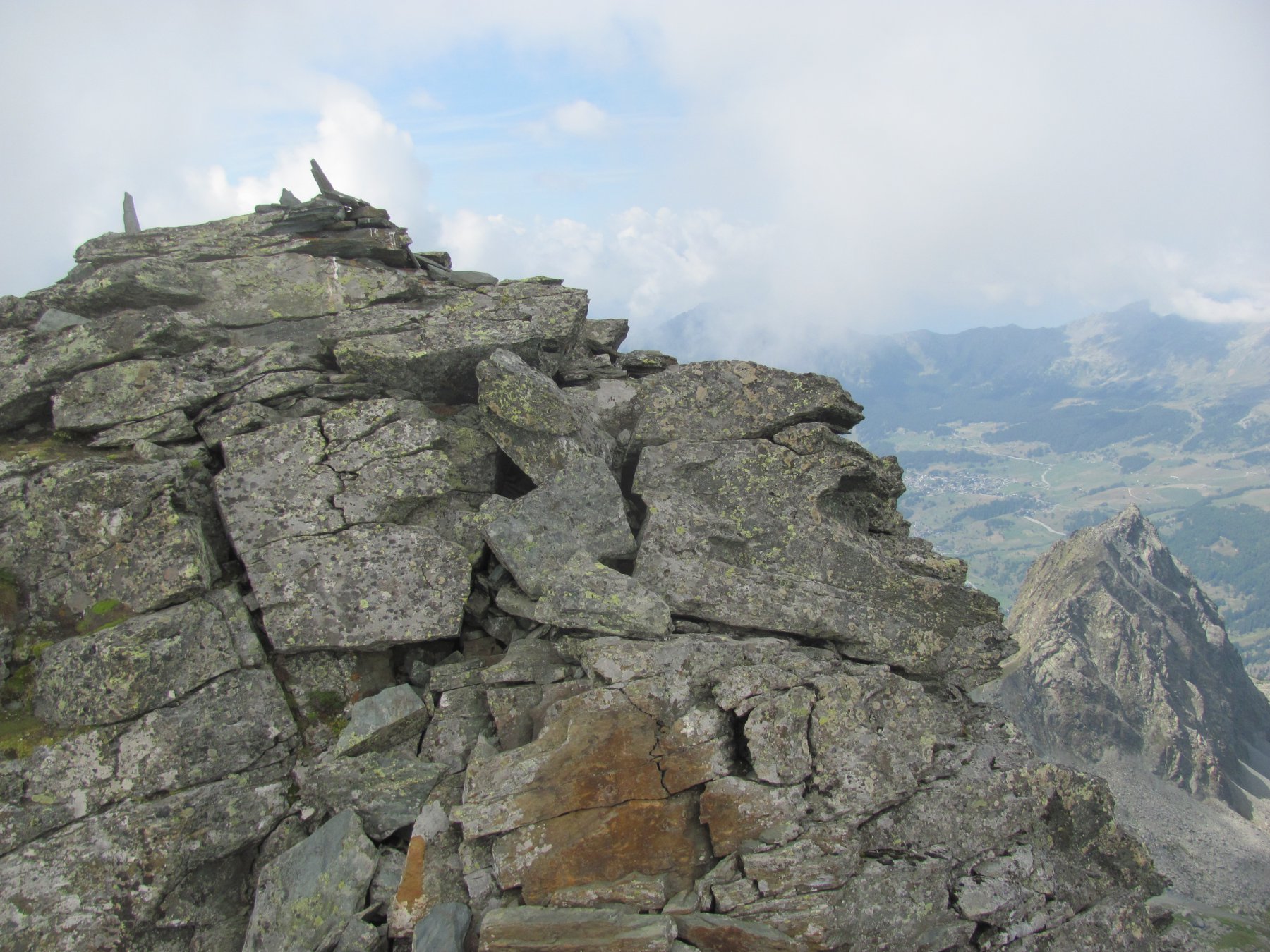Partendo da Ostafa (secondo tratto di cabinovia da Champoluc), si percorre inizialmente il sentiero n 12 (direzione Colle Pinter e Testa Grigia), facendo attenzione, dopo circa 600 metri, in corrispondenza di alcuni roccioni (possibili tubi scoperti dell’acqua), alla deviazione verso monte, con indicazione semicancellata (forse volutamente) del segnavia 11 (o 11A). Nei primi metri il sentiero è tracciato, ma presto si perde e si deve continuare a salire piegando verso est, fino a raggiungere l’ampia conca di un riale, che consente di individuare con maggior consapevolezza la direzione di salita, che resta comunque orientativa, lungo i ripidi pendii erbosi o detritici che fiancheggiano il riale (o la sua traccia), al centro del vallone su cui incombono il Testa Grigia (a destra) ed il Bec Forcu (a sinistra). Verso quota 2700 m circa si supera un salto roccioso, da affrontare preferibilmente tenendosi sui ripidi prati a destra del canale detritico (sinistra idrografica). Al di sopra, dopo un breve tratto di minor pendenza, inizia il tratto più delicato, in cui si deve individuare la posizione della sella, alla sinistra di due gendarmi (corni rocciosi) posti alla fine della linea di cresta del Testa Grigia, anche se è possibile incontrare qualche traccia ed eventuali ometti sul percorso. Il percorso migliore piega tendenzialmente a sinistra (direzione NNE), attraversando sfasciumi, piccole pietraie e possibili nevai fino a metà estate. Superato il colletto a quota m 3010 circa si passa nel versante di Gressoney. È preferibile piegare immediatamente a sinistra (mantenendo la direzione NNE) per evitare di perdere eccessiva quota, abbassandosi di non più di 40 m, attraversando l’ampio e facile pianoro mantenendo il più possibile la quota, ai piedi delle frastagliate creste del Rothorn, fino ad intercettare il segnavia n. 10 (bollini numerosi e ben visibili) che sale da Gressoney (un Km dal colletto). Si raggiunge la base della cresta est del Rothorn (alla stessa quota della sella 3010), dove, appena prima dell’ampio colle fra i due Rothorn, conviene abbandonare il sentiero 10 (che in pochi minuti conduce al Blach o Piccolo Rothorn) e salire prima la più impegnativa cresta del Grande Rothorn, procedendo inizialmente in direzione nordovest su tenui tracce di sentiero e quindi più marcatamente a sinistra (ovest) in direzione della vetta ormai ben visibile. A circa 50 m di quota sotto la vetta (m 3100) bisogna individuare il passaggio migliore all’interno di un breve canalino. Il passaggio richiede qualche passo (poco più di dieci metri) di arrampicata facile e non esposta (1° grado), ma va correttamente individuato per evitare difficoltà maggiori. Infine con un ultimo breve tratto di cresta rocciosa si raggiunge l’ometto della vetta a quota 3152. Al rientro conviene dedicare pochi minuti in più per raggiungere anche la facile e caratteristica cima a cresta piatta del Piccolo Rothorn (marcatura m 3025). Il ritorno avviene lungo lo stesso percorso dell’andata.