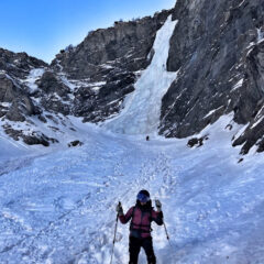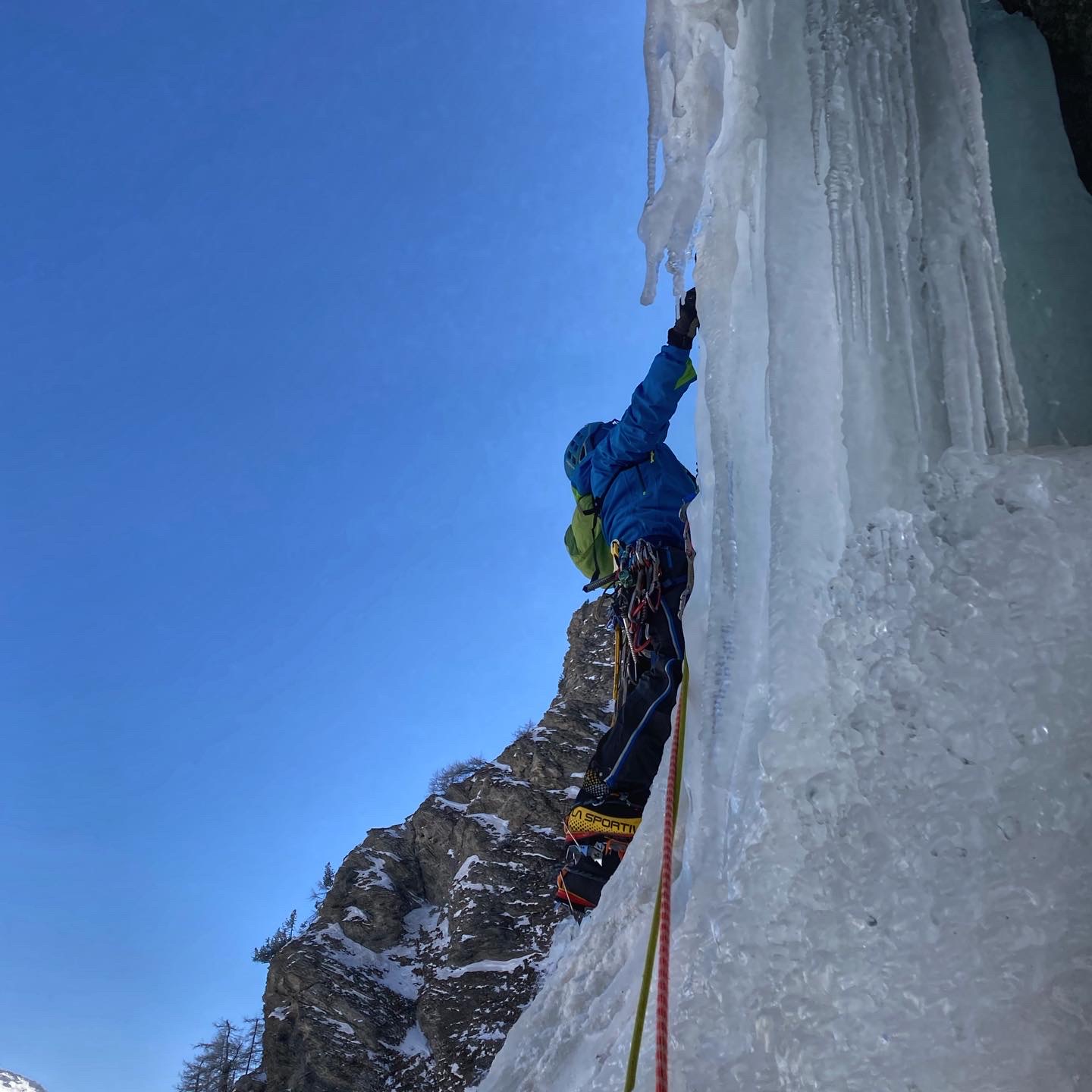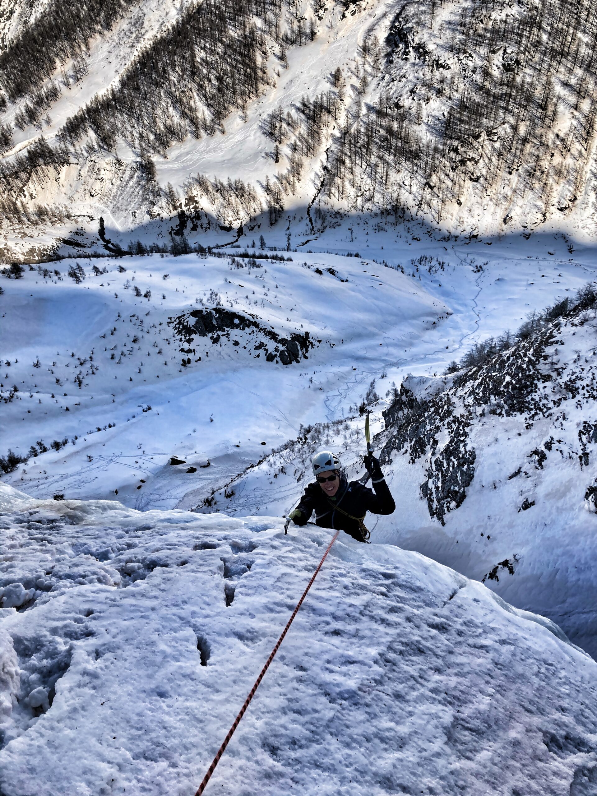 Sempre stupenda , seria senza mai essere estrema, saliti lungo il percorso originario che porta nella nicchia a dx , traversino a sx dritto poi tirone da 55 fino alla vecchia sosta a dx su chiodi , ( smantellati da cordate dei gg passati) Sosta su ghiaccio insieme a Ernesto e che ringrazio , arrivati da sx con soste su abalakov, uscita a sx su muretto breve ma intenso , S3 su abalakov che inizia a risentire del sole (attenzione) con Mirella e un grandissimo Ricky alla sua seconda esperienza ..