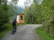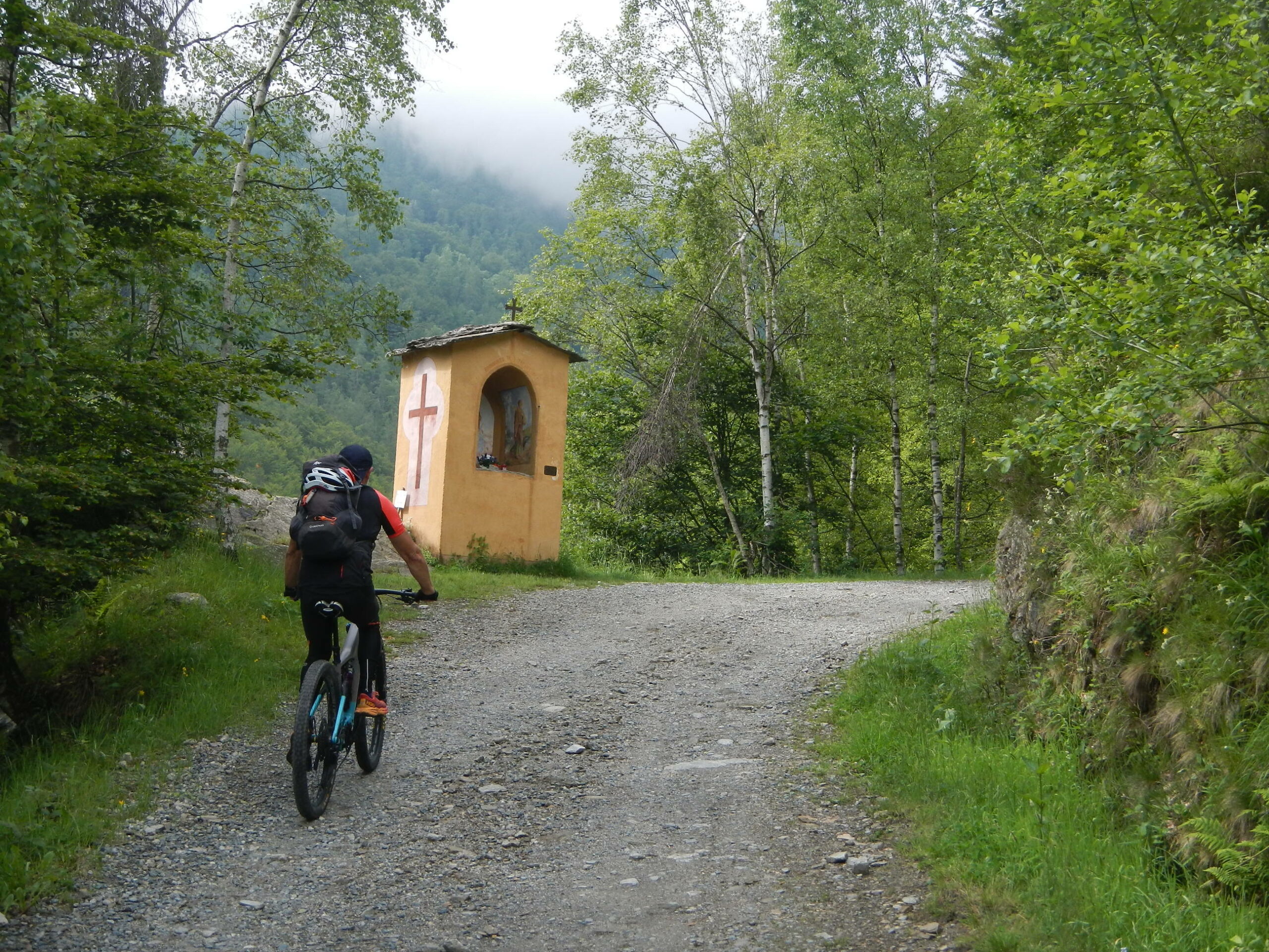 Dopo aver superato un pascolo si sale verso il gruppo di baite sovrastanti (Case Dragone) per immettersi su una carrareccia che passa accanto a due piloni votivi.