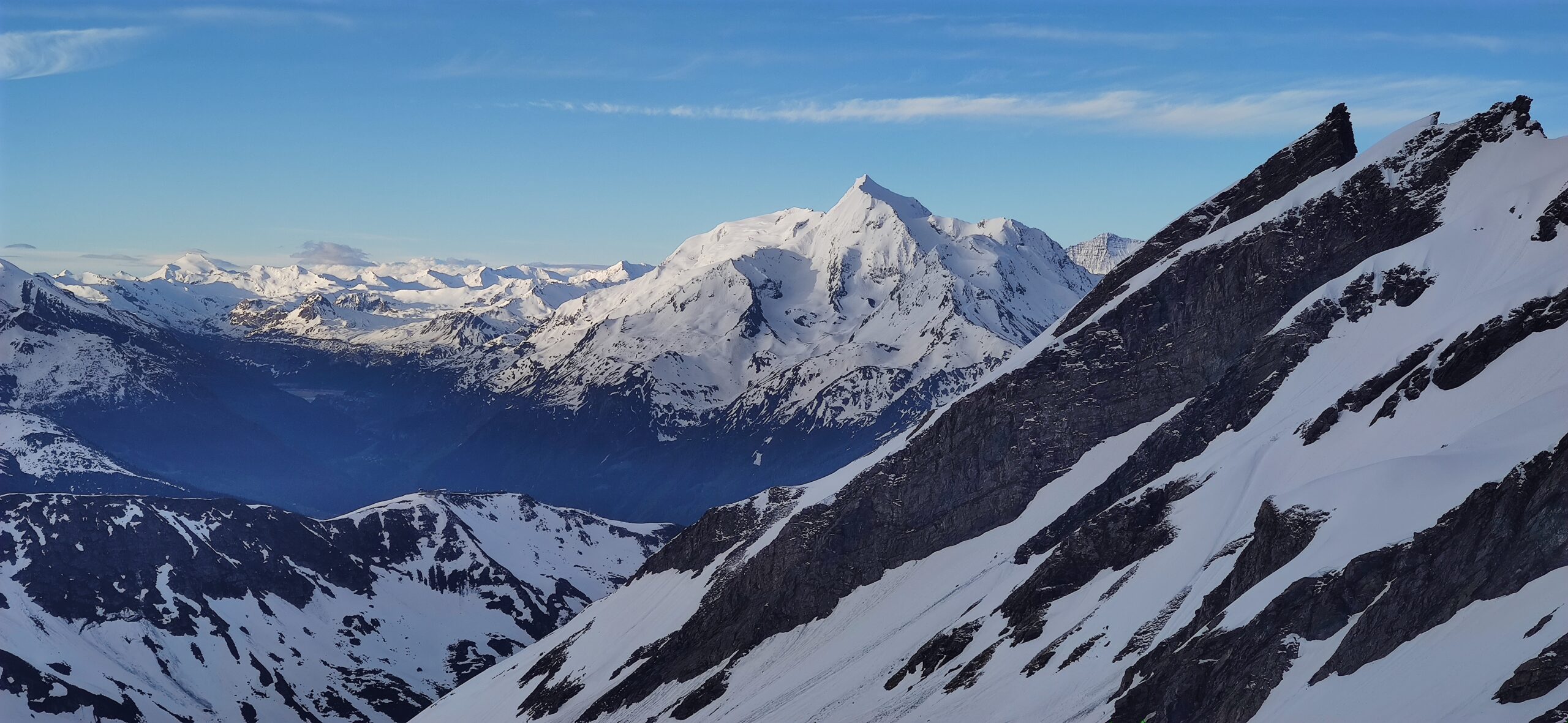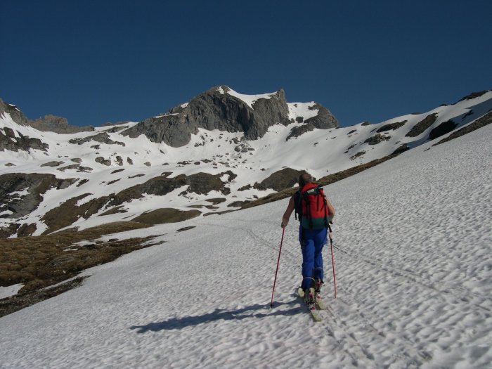 Costeggiare la cresta verso destra fin che c’è neve, poi lasciare gli sci (a circa 2860 m) e proseguire sull’aerea cresta per roccette (II grado) e brevi tratti innevati.