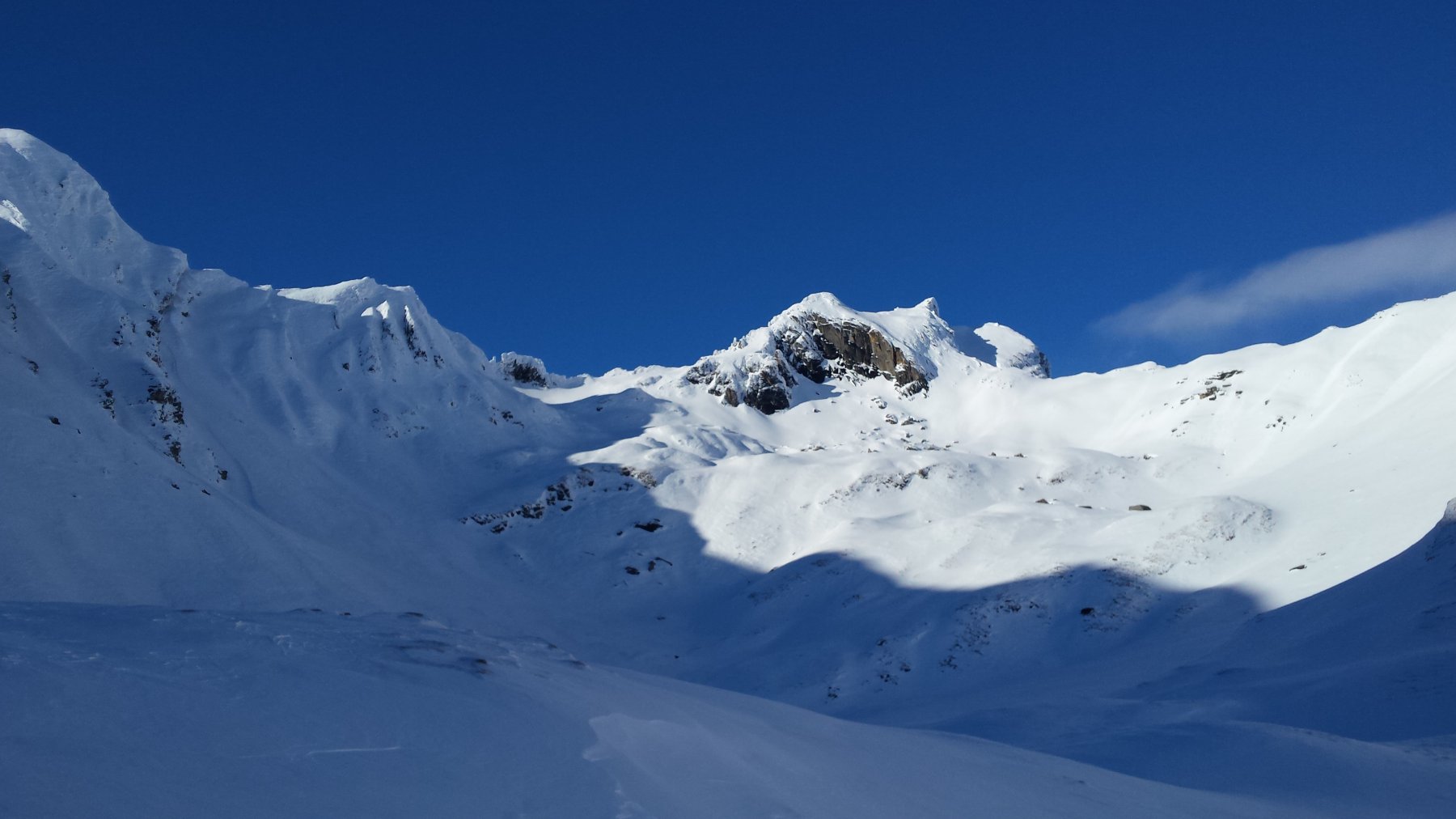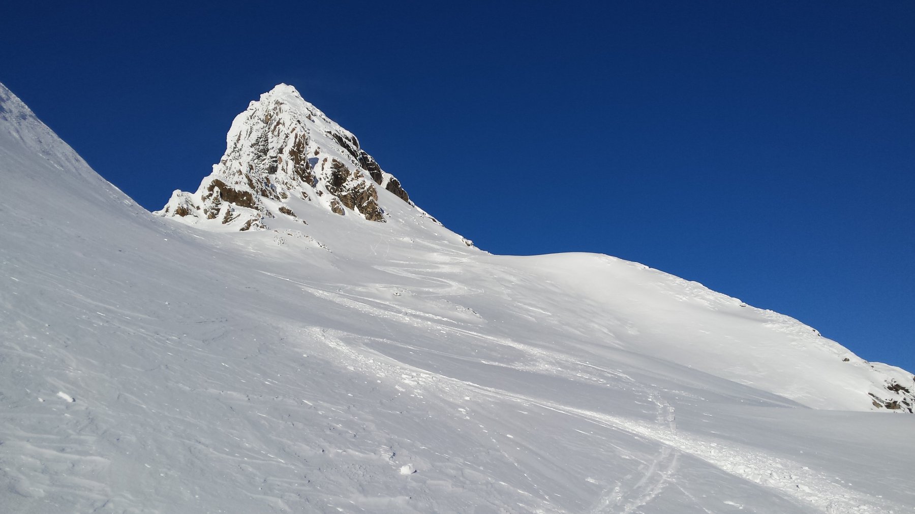 Si arriva ad una prima cima, si discende un poco su neve facile e si risale sulla vera vetta che si presenta come un piccolo torrione.