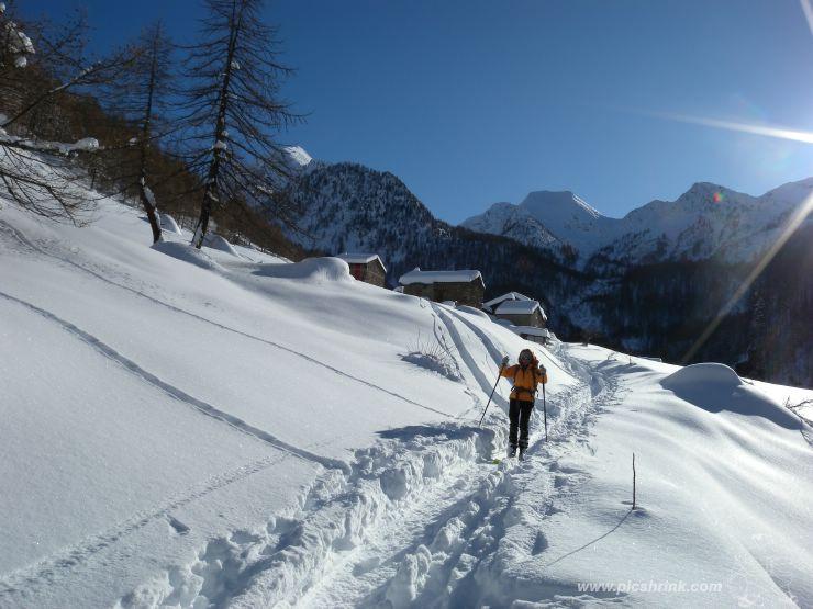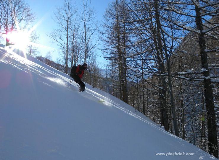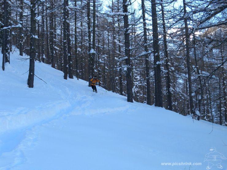 Partiti per Viafiorcia, ma già dal bivio per Bout du Col nessuna traccia…mah!Bel traccione invece verso Selle; ok si và anche se mark deve tornare presto al lavoro..ma a q.2100 circa direzione col Giulian, l’enorme pistone fa un repentino semicerchio a dietrofront??Con mark pensiamo sul da farsi, tutt’intorno piante abbattute ed una strana sensazione…Era 20 anni che non passavamo più da queste parti e non mi ricordavo sinceramente una zona così pericolosa…Nessuna nota sul web dei numerosi predecessori…che hanno saggiamente scelto di tornare indietro.Scendiamo anche noi senza remore su neve fantastica, segnalando ai visitatori che al momento in questo vallone non c’è alcuna altra traccia battuta!