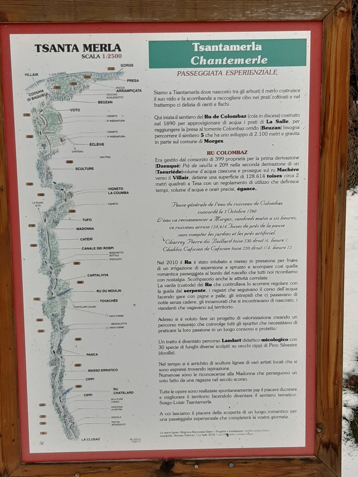 Anello come da descrizione, variato solo il punto di partenza: dalla fortezza di Chateau anziché da Croix des Pres. Discreto l’innevamento anche alla bassa quota di La Salle (un 30-40 cm ci sono tutti), traccia sempre presente quindi ciaspole non indispensabili, Ru de Colombaz ancora visibile.