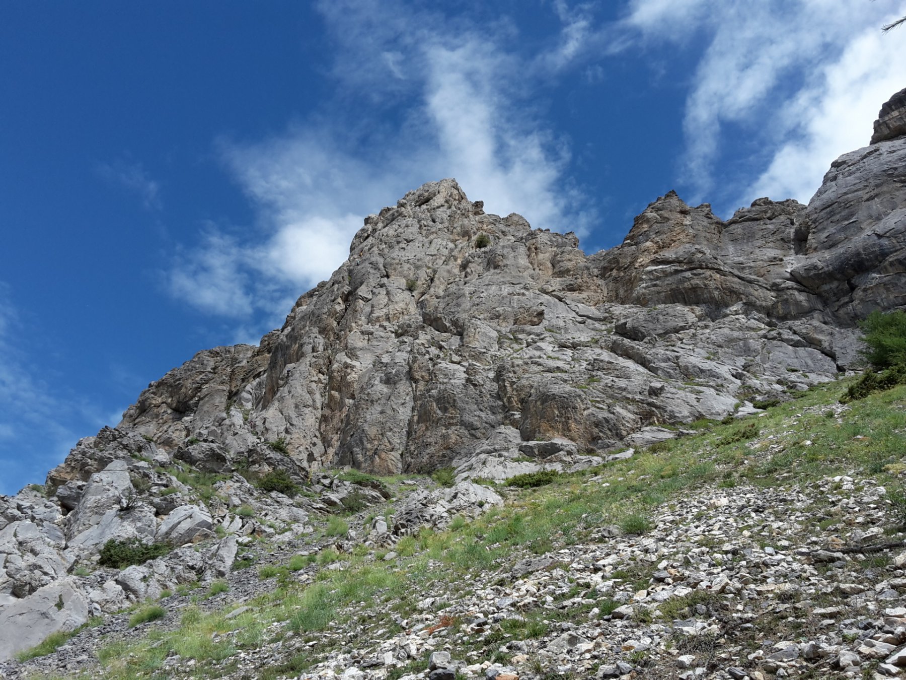 L6-L7-L8) Seguire il filo della cresta, incontrando chiodi, spit e soste delle altre vie, fino a dove questa muore nell’erba della vetta.