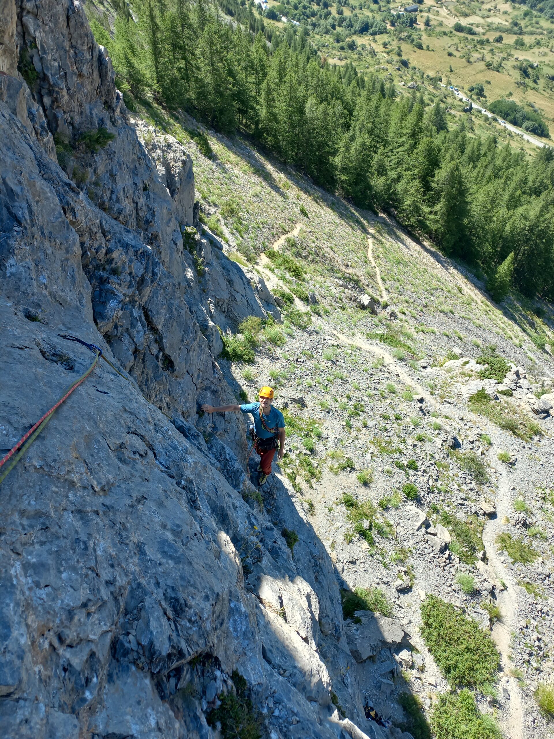 L1) Salire il piccolo pulpito roccioso, poi attaccare la piccola placca ascendendo verso destra, poi prosegiure pressocchè dritti fino in sosta. 4°+