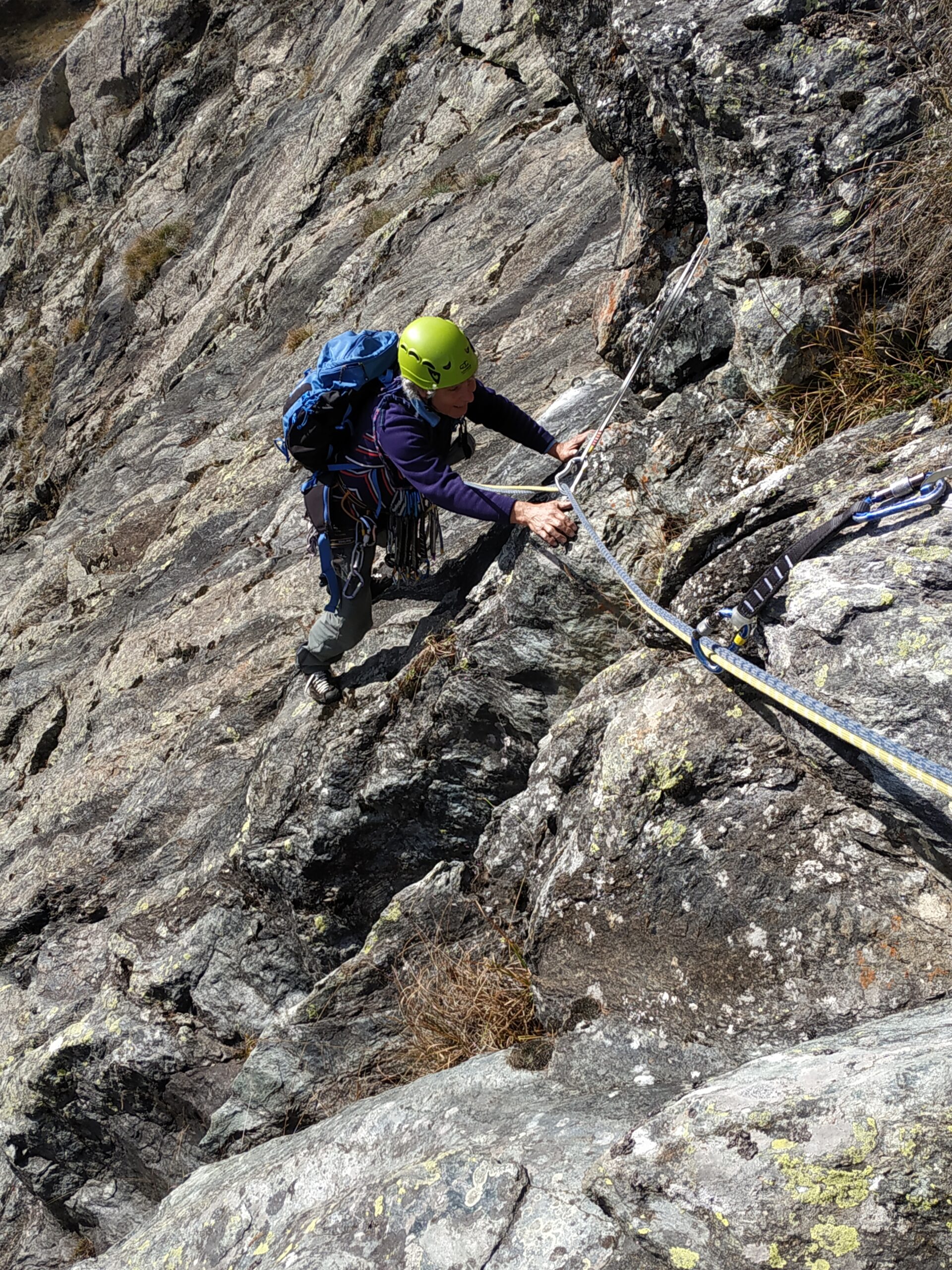 Discesa: dall’ultima sosta ascendere leggermente verso sinistra per circa 25/30 metri, fino a reperire la prima calata in doppia. Con 3 doppie si ritorna alla base.