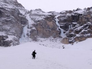 Avvicinamento in 1,30 h. Traccia ben presente con tratti ghiacciati, oggi coperti da un dito di neve nuova.