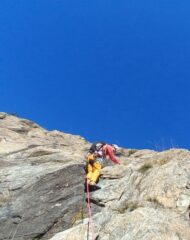 Sono stati aggiunti alcuni spit in L5 e L6 dove era stato evidenziato pericolo in caso di caduta, ora la via è, a mio avviso, ben protetta. In precedenza era stato messo uno spit con cordone per sostare nel piccolo canale tra L3 e L4.