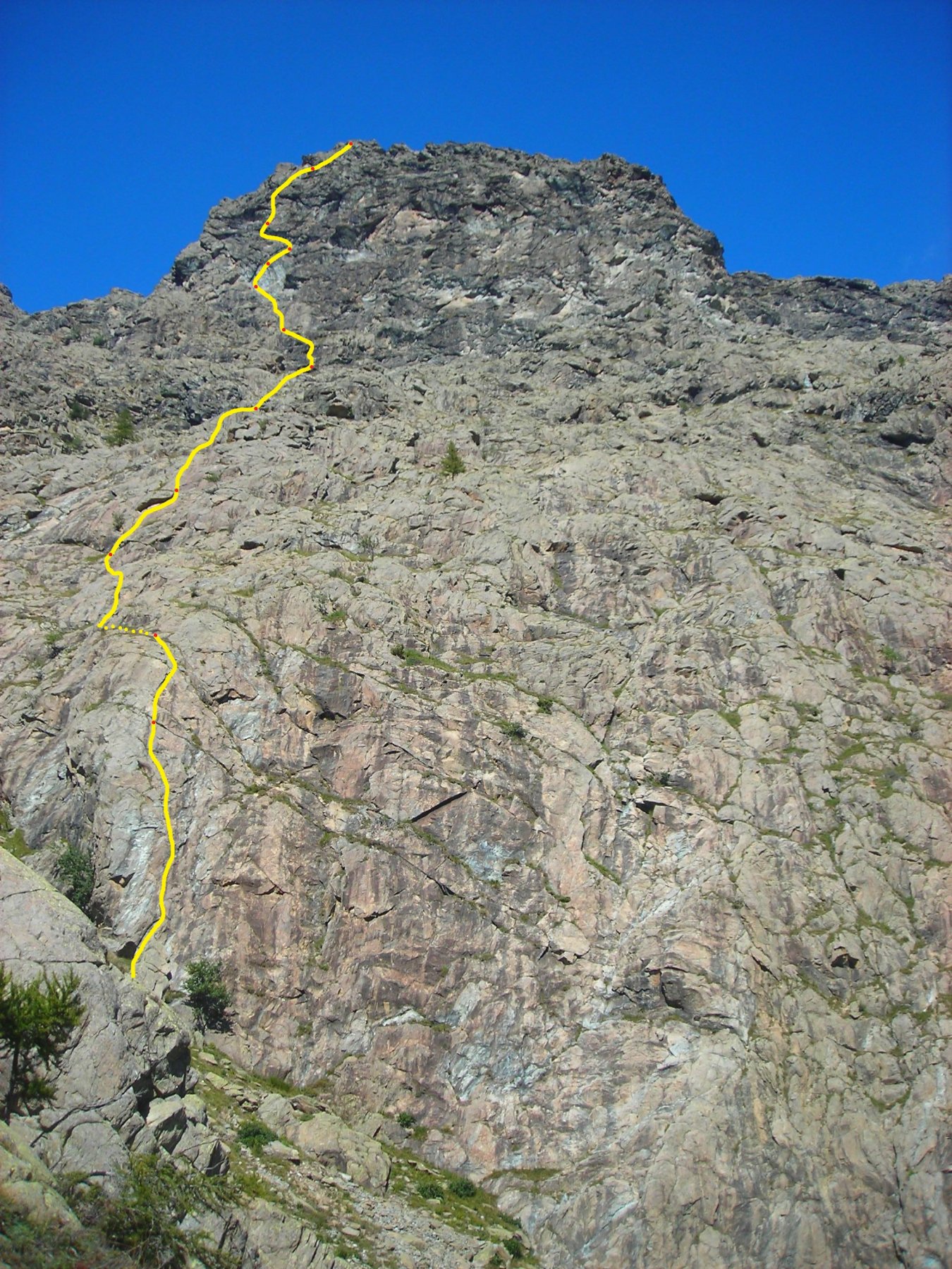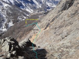 Salire verso dx nel canalino fino a una sosta con cordino, alla base di uno spigolo
