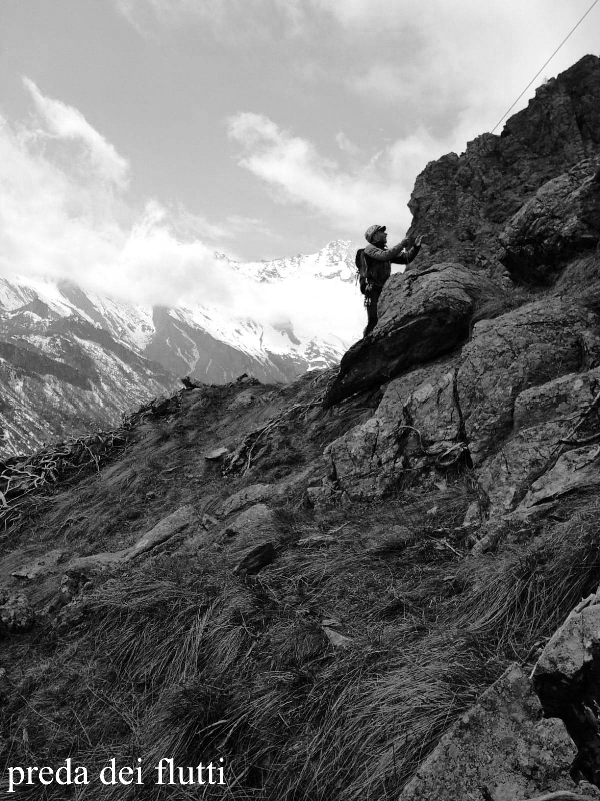Il tirolese H. Keinwunder, il più enigmatico e straordinario tra gli alpinisti degli anni cinquanta del secolo scorso. Era dotato di una classe purissima e di un’etica specchiata. Scalava cime per vie difficili e le discendeva sempre in arrampicata, non lasciava tracce del suo passaggio in parete, era del tutto disinteressato a raggiungere la cima, ben prima dei protagonisti del Nuovo Mattino torinese. Di lui si hanno notizie frammentarie e pochi scritti gelosamente custoditi. Alcuni amici, sgombrando una soffitta a Balme, hanno ritrovato un ingiallito quaderno al cui interno vi erano considerazioni e schizzi siglati “H. K.”. Si trattava di Herman Keinwunder? Forse visitò quest’angolo di Alpi Graie sulle tracce di antiche parentele. Una pagina riporta lo schizzo di una parete con sommarie indicazioni di arrampicata; siamo allora partiti per la nostra avventura, alla ricerca della via. L’abbiamo cercata scalando con l’utilizzo dei nostri metodi, forse non ortodossi agli occhi di Herman, ma d’altronde noi non siamo fuoriclasse come lui. Sicuri che non avremmo trovato segni materiali, ci siamo fatti guidare dagli appunti e dall’intuizione derivata dalla nostra esperienza. Noi ci abbiamo provato. Abbiamo trovato il percorso giusto? Abbiamo ripetuto esattamente la via? Mah…chiedilo a Keinwunder. L’unico docufilm realizzato sul fortissimo scalatore tirolese è stato presentato nel 2014 al Film Festival di Trento col titolo “Chiedilo a Keinwunder”. Si trova facilmente su YouTube in versione integrale, ne consigliamo assolutamente la visione.