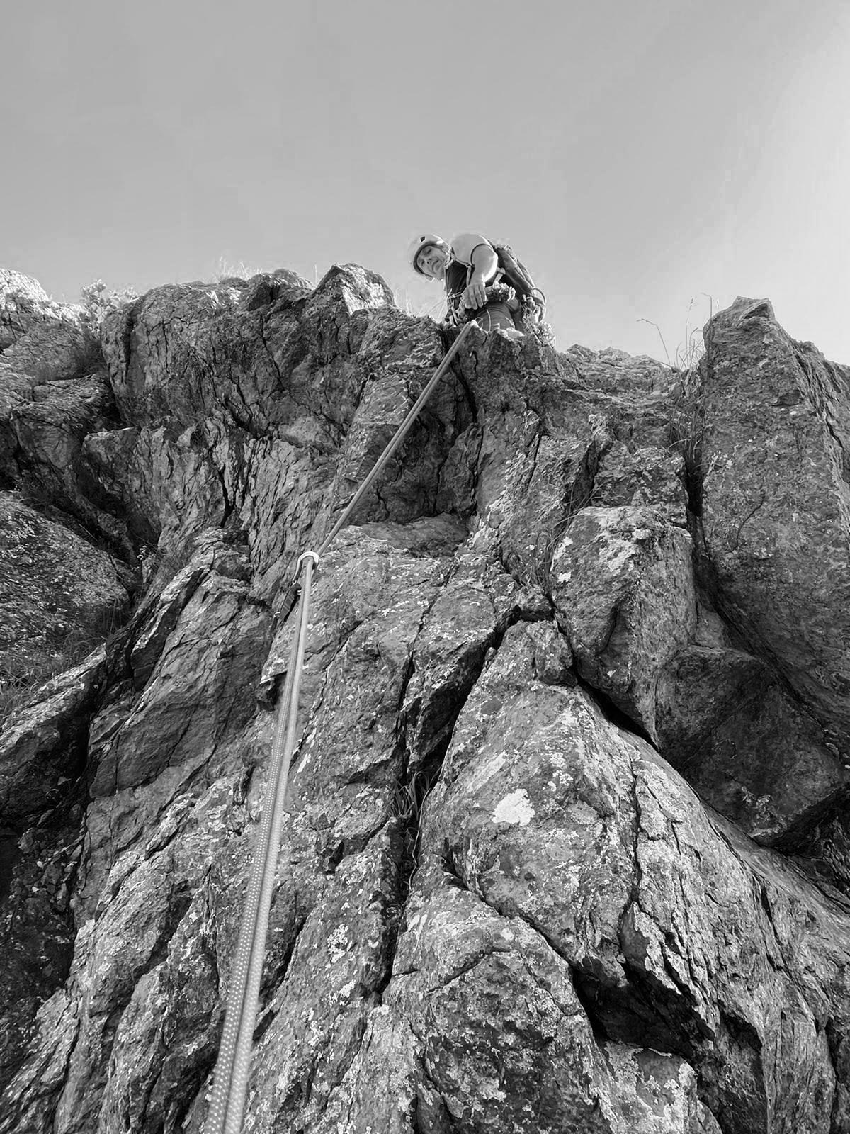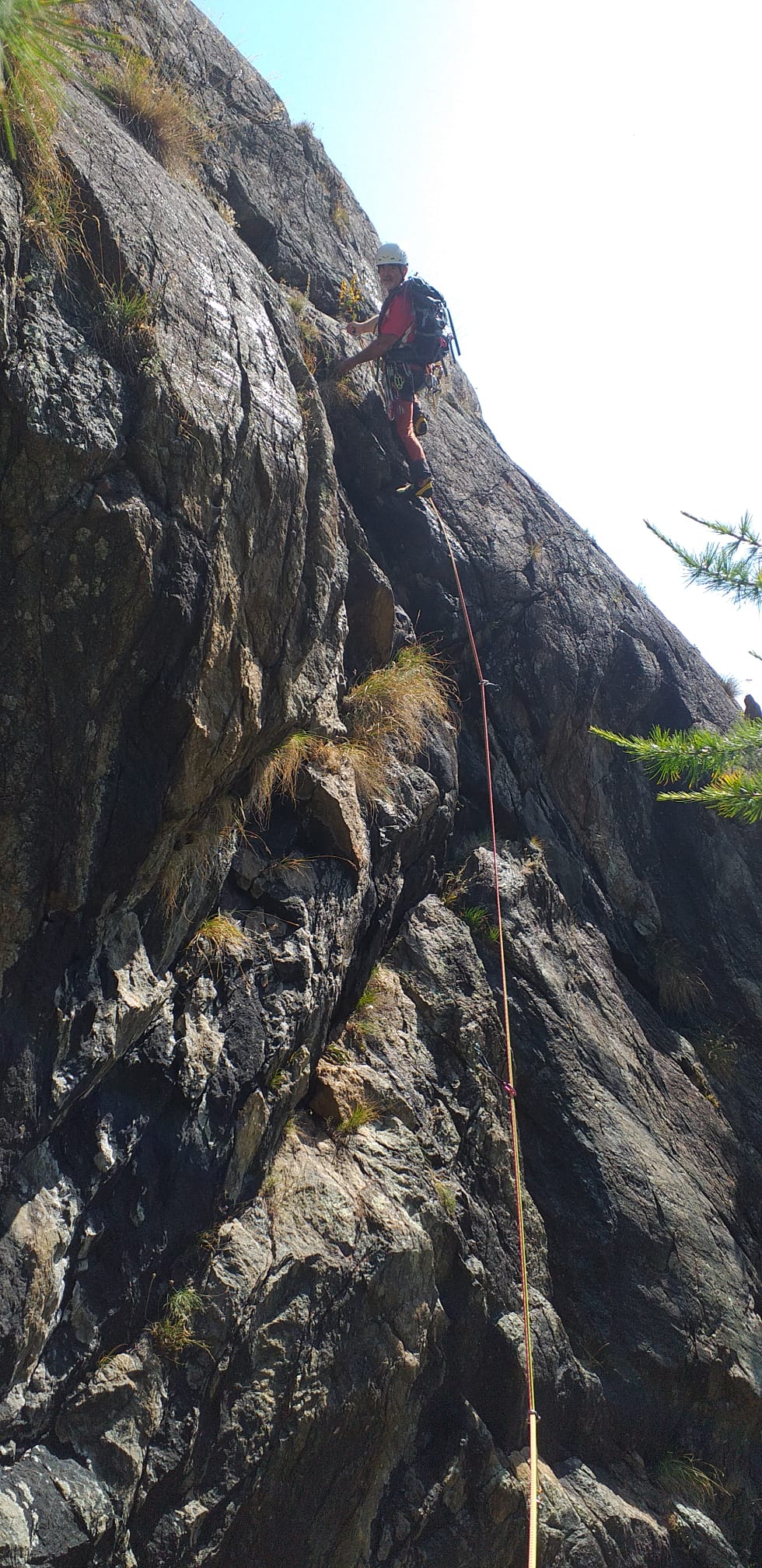 - L10 5c 35 m. Scalare lo spigolo a sx per poi tornare a dx e proseguire alla sosta (possibile sosta intermedia).