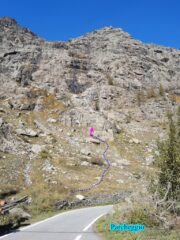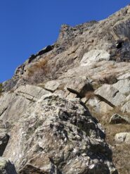 - L2 3a 20 m. Traversare scendendo leggermente per poi superare un muretto e una corta placca fino alla base di uno sperone grigio.