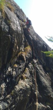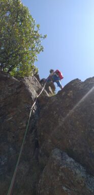 - L5 5c 55 m. Breve traverso a sx, scalare un muro e proseguire a dx aggirando uno spigolo (valutare la possibilità di sosta intermedia sull’albero), continuare su muro fessurato e placca fino alla sosta dell’albero secco.