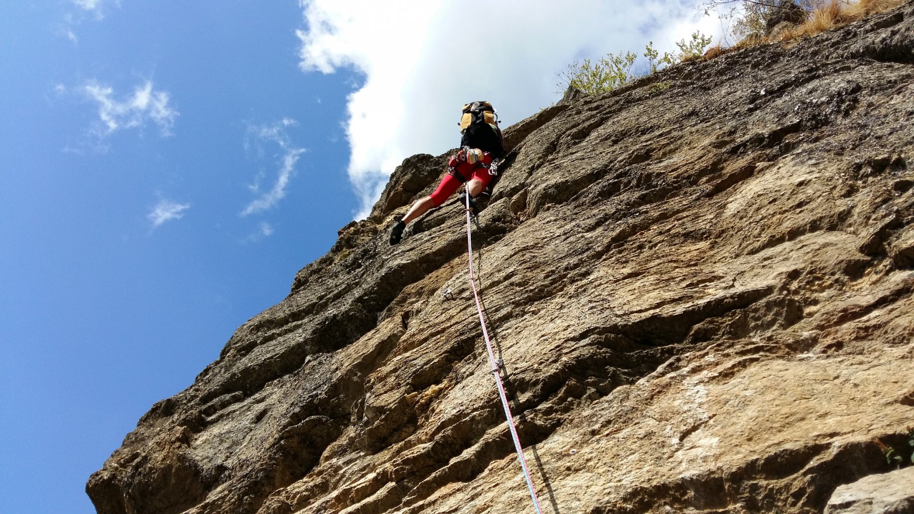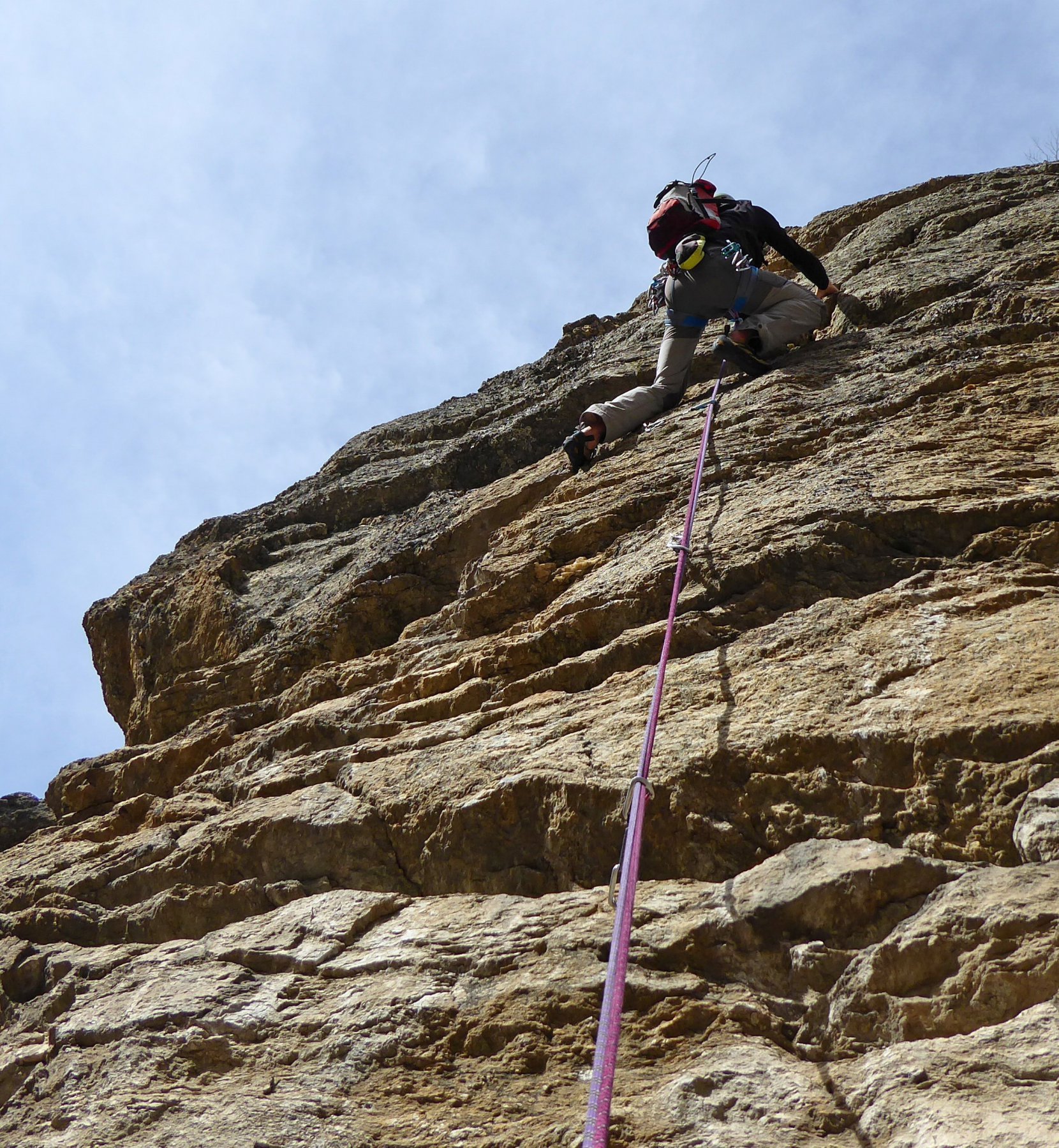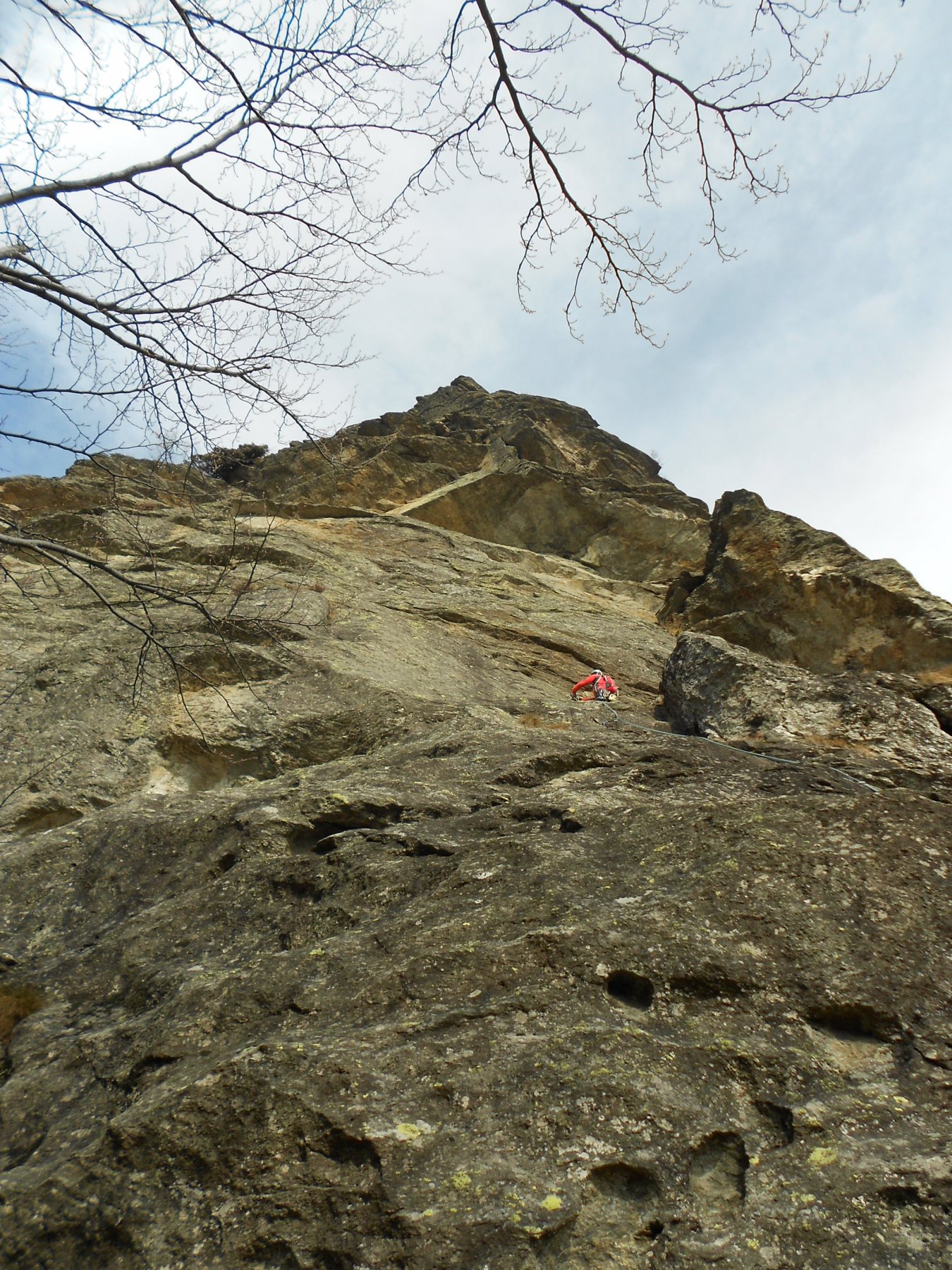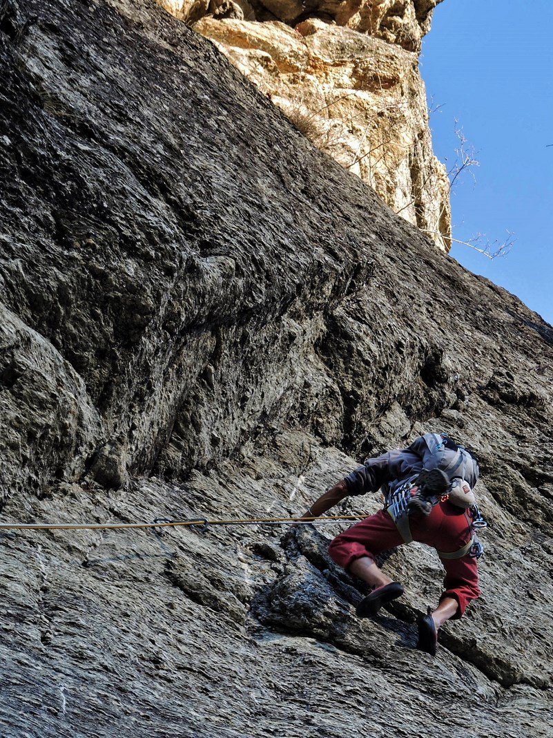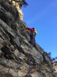 - L1) Superare un paio di risalti e poi un’evidente diedro obliquo e sostare su una comoda cengia (5c)