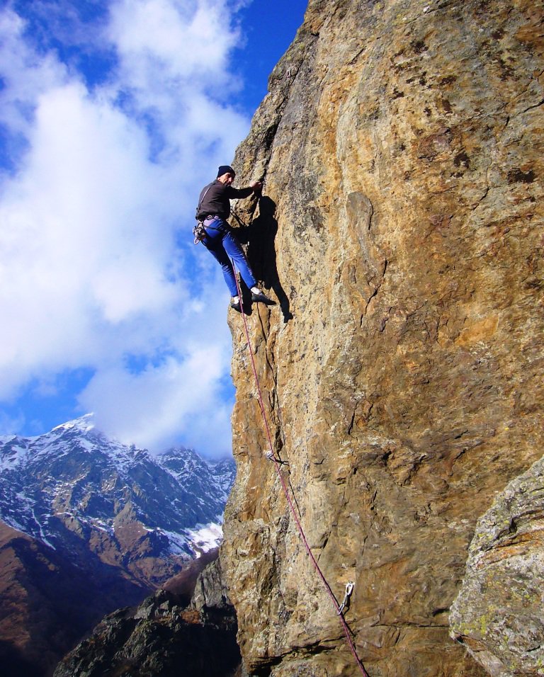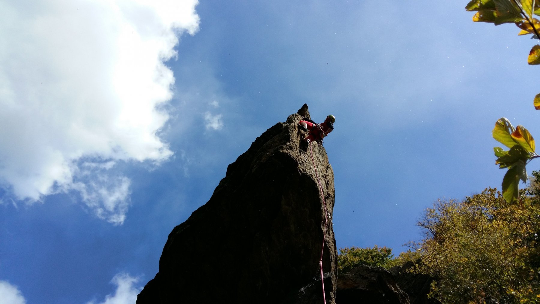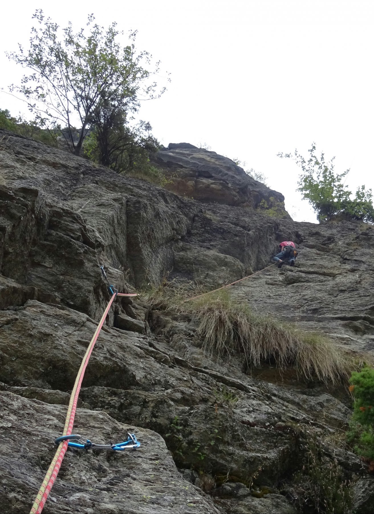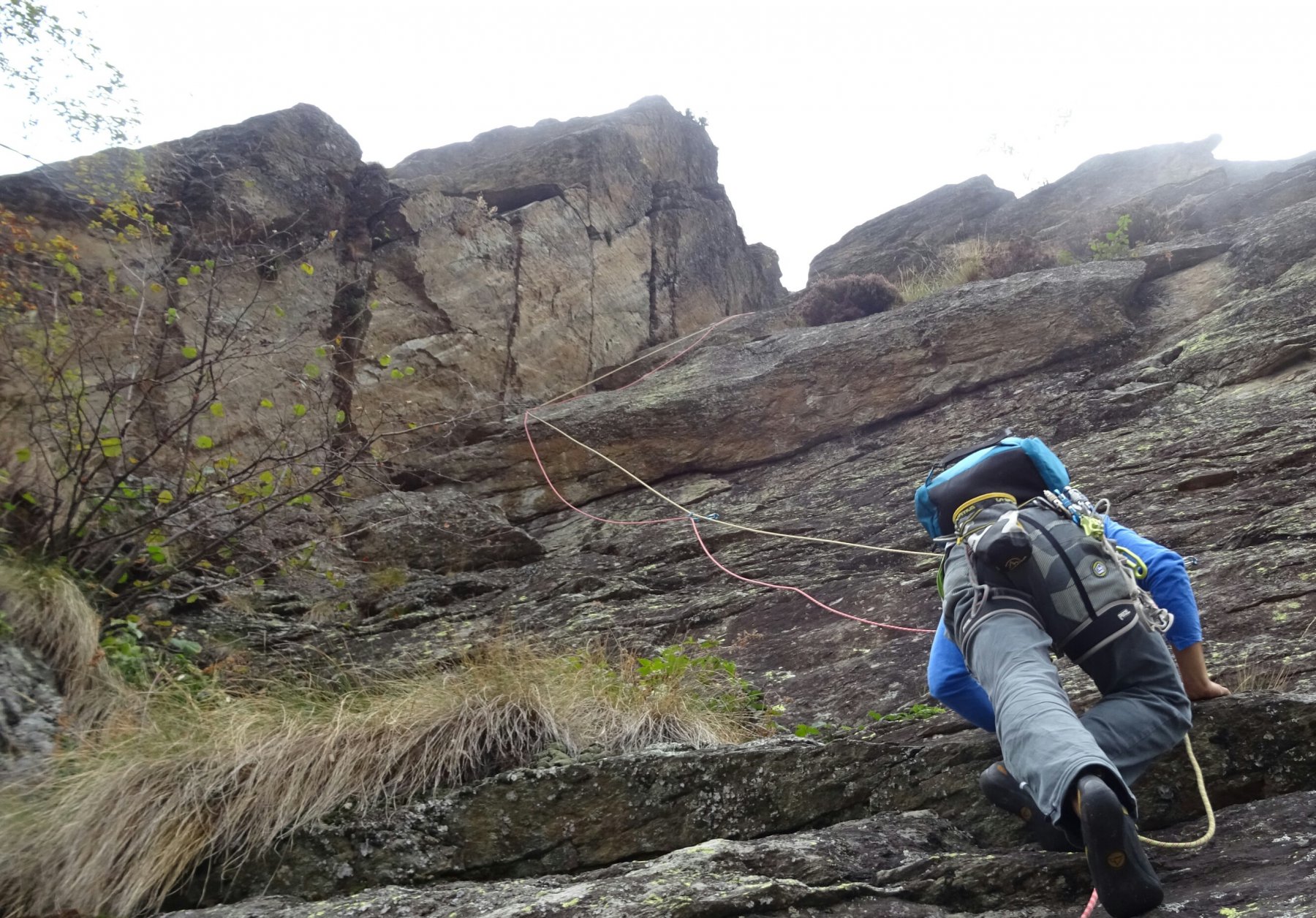 - L1) Superare un paio di risalti e poi un’evidente diedro obliquo e sostare su una comoda cengia (5c)