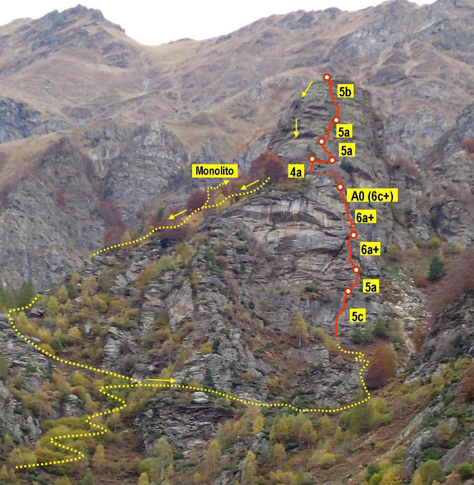 La via 26 dicembre al Monolito è sullo spigolo ovest (6a/6a+).