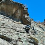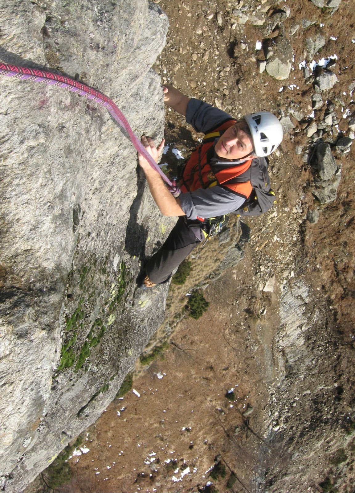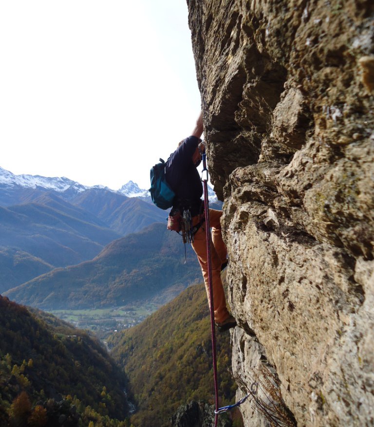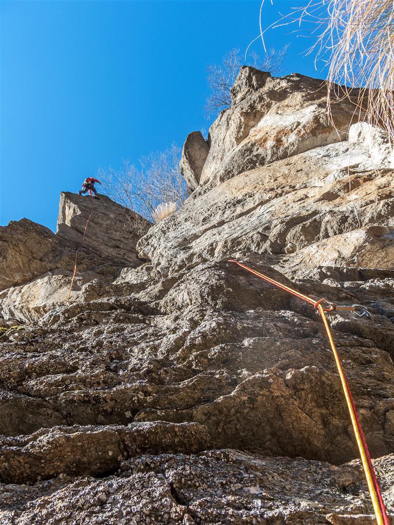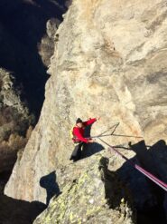 - L6) Attraversare facilmente a destra sotto un marcato strapiombo e raggiungere un’altra sosta portandosi sulla parete Sud, quindi proseguire salendo leggermente verso sinistra su placche e lame e sostare sul margine destro di un tetto (5a)