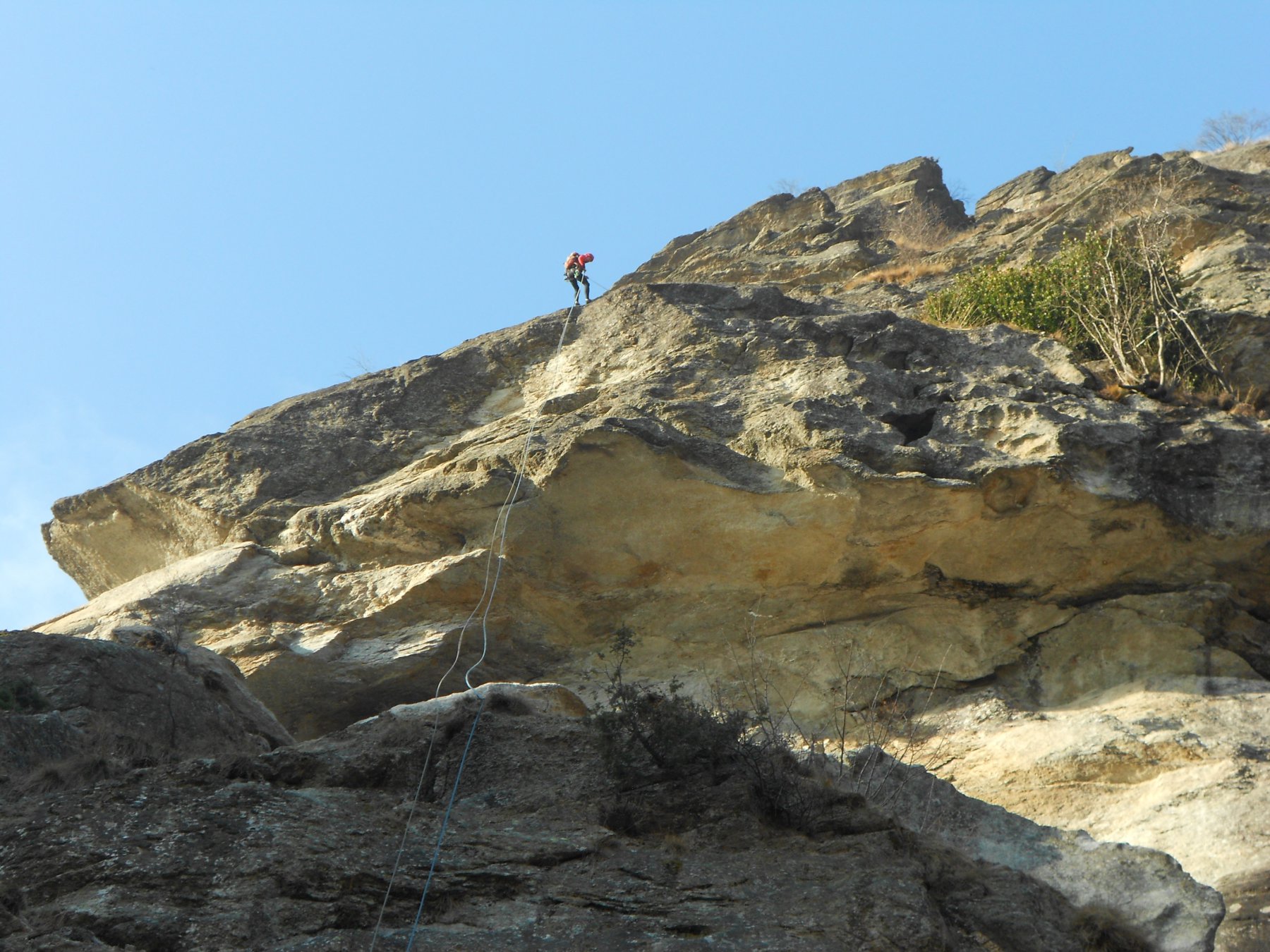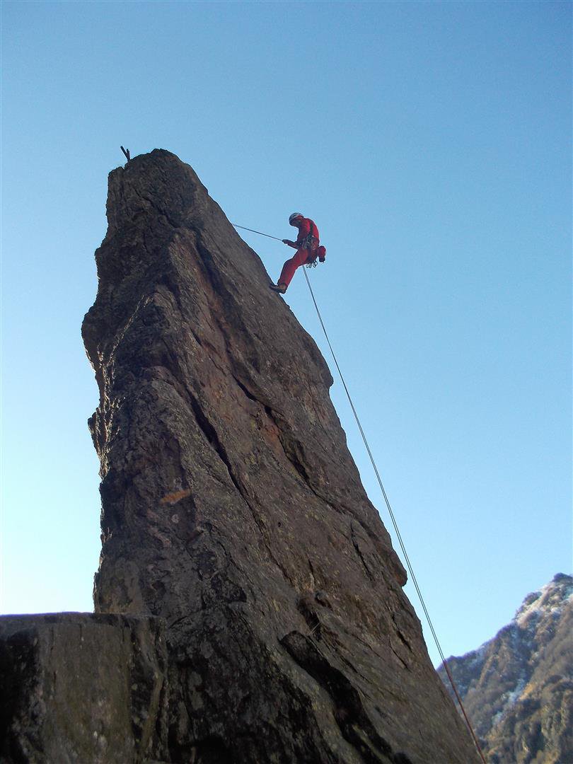 Tre doppie da 25 metri; la prima sulla parete Ovest e poi sulla parete Sud
