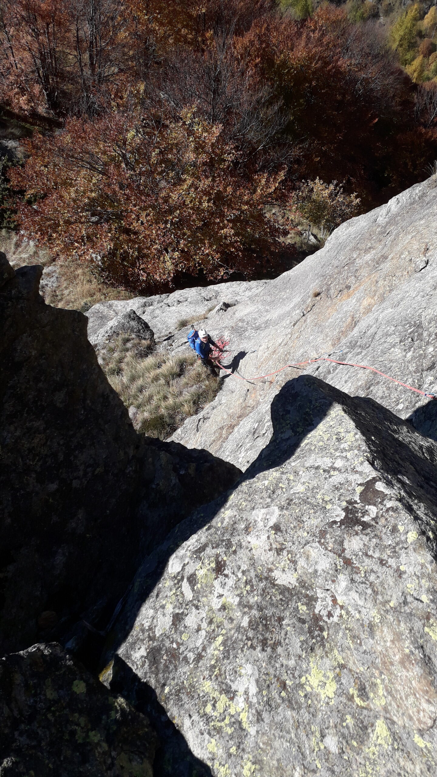 Volevamo integrare con Lou pertur da chat una volta scesi dal versante nord ovest, senza impegnarci pero’ piu’ di quel tanto nella ricerca dell’attacco. Va da se che alla fine ci siamo ritrovati a salire la piu’ difficile Ento pa far lou pa pi lonc que la chambo, che abbiamo preso parecchio a sx della sbiadita scritta gialla alla base, finendo inevitabilmente sul passo di 6b, dopo traverso ascendente per una rampa sulla dx. Nessun problema azzerarlo grazie ai due spit ravvicinati, che portano a continuare con passi ancora piuttosto delicati a uscire da questa via. Una via salita per errore, ma inutile nasconderlo, ci ha fatto anche un po’ onore.